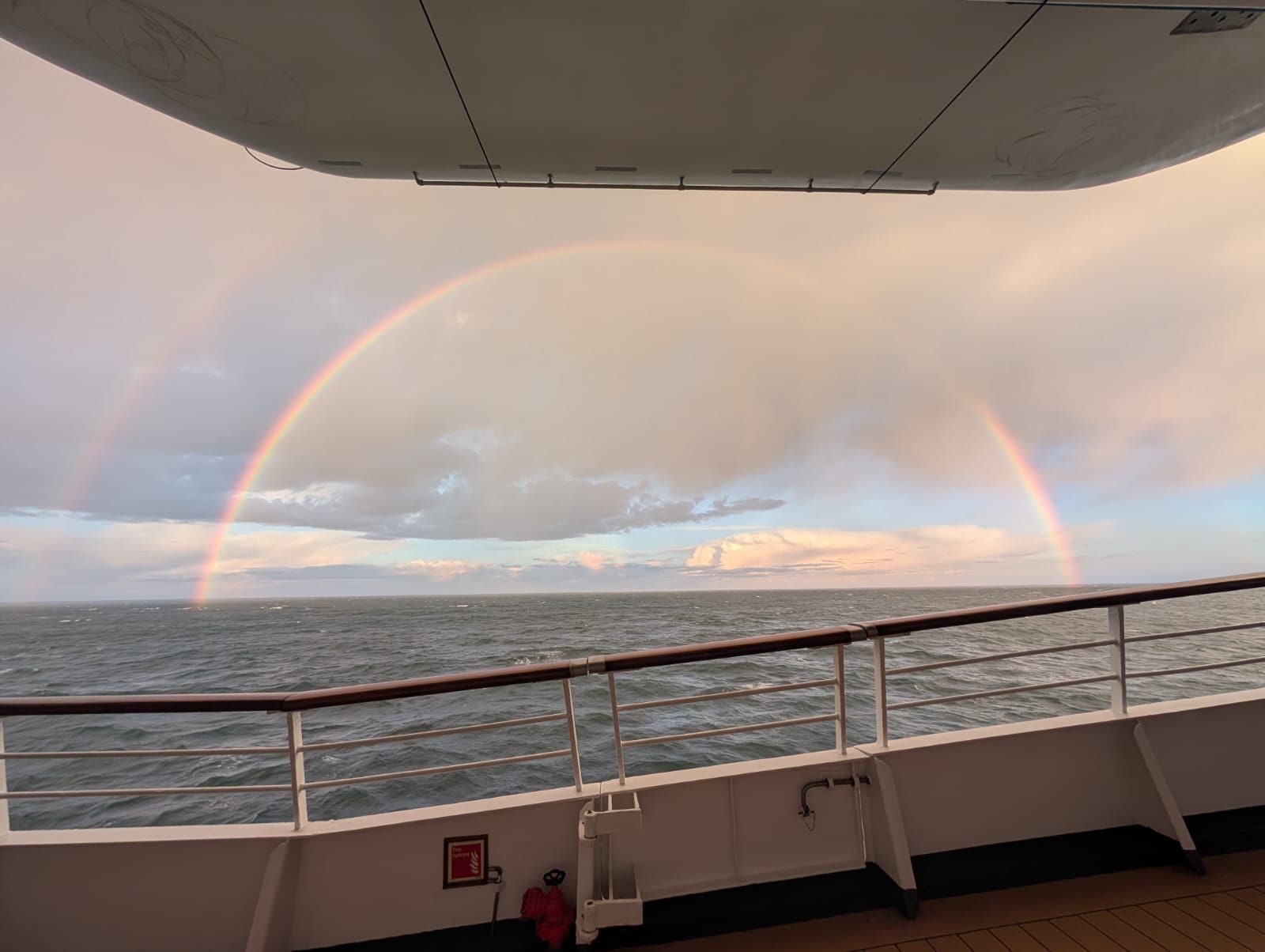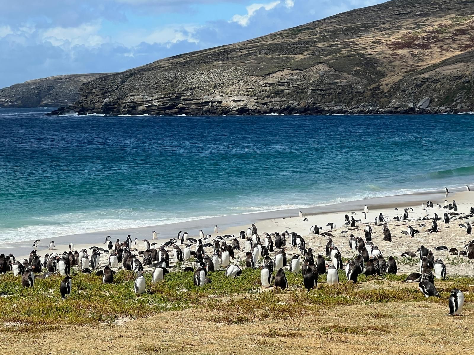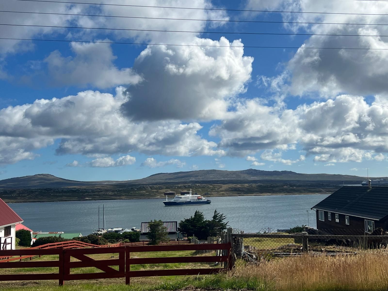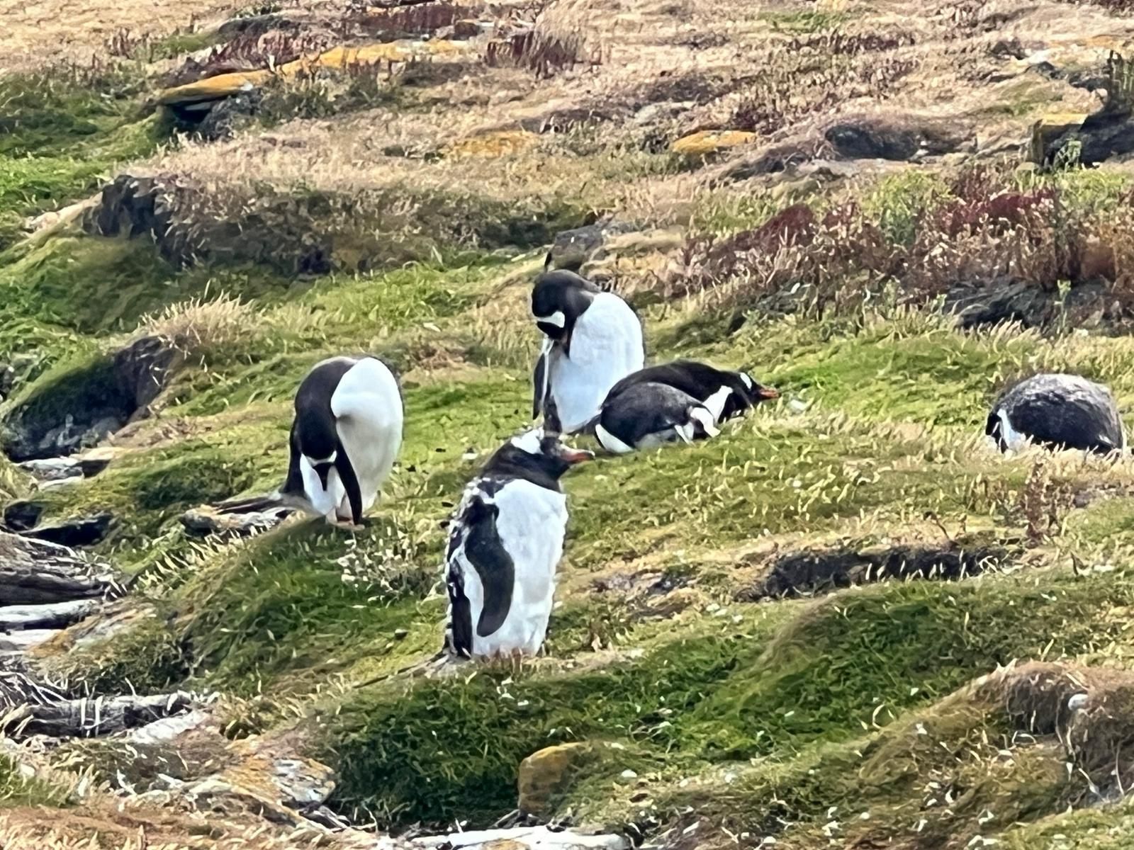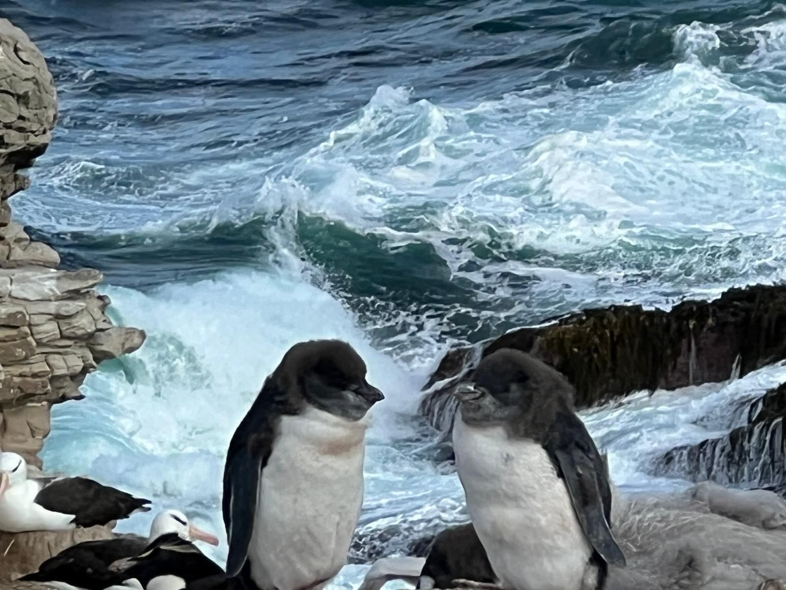 Puerto Deseado is a sleepy little town that gets 1 cruise ship, every 3 months. There is not a lot to do there, but it is home to a large colony of Rock Jumper penguins, seen here. We have to tender in from this port and wave swells are so high that it is not safe for us to tender to port our second day there. This was a bummer for us because a group of about 30 of us had planned and excursion out to see the rock hoppers up close and personal. Several others got to see them on our first port day, so we have their photo's to live vicariously. We did get some amazing sunsets and rainbows the last couple of days despite the choppy seas.