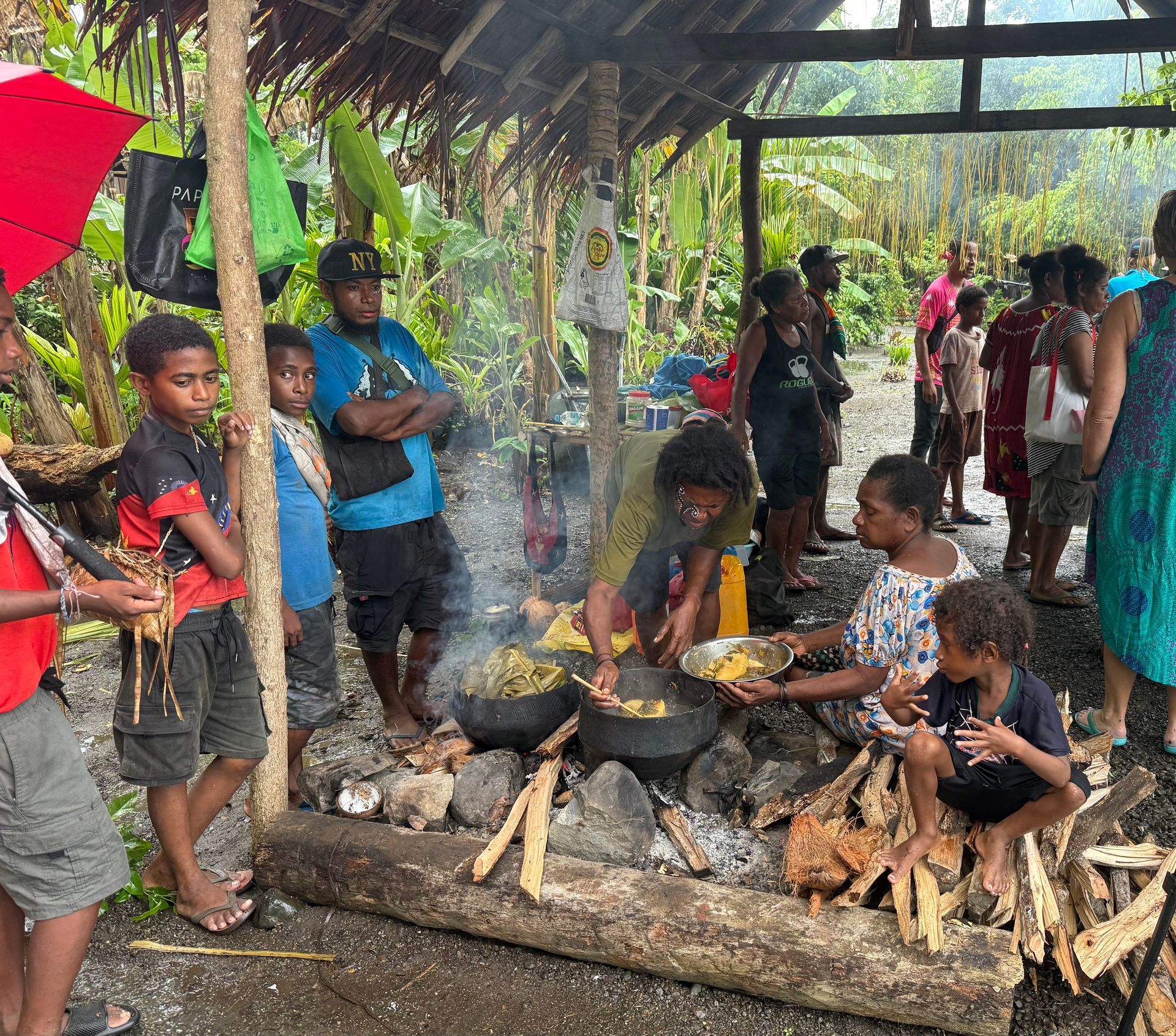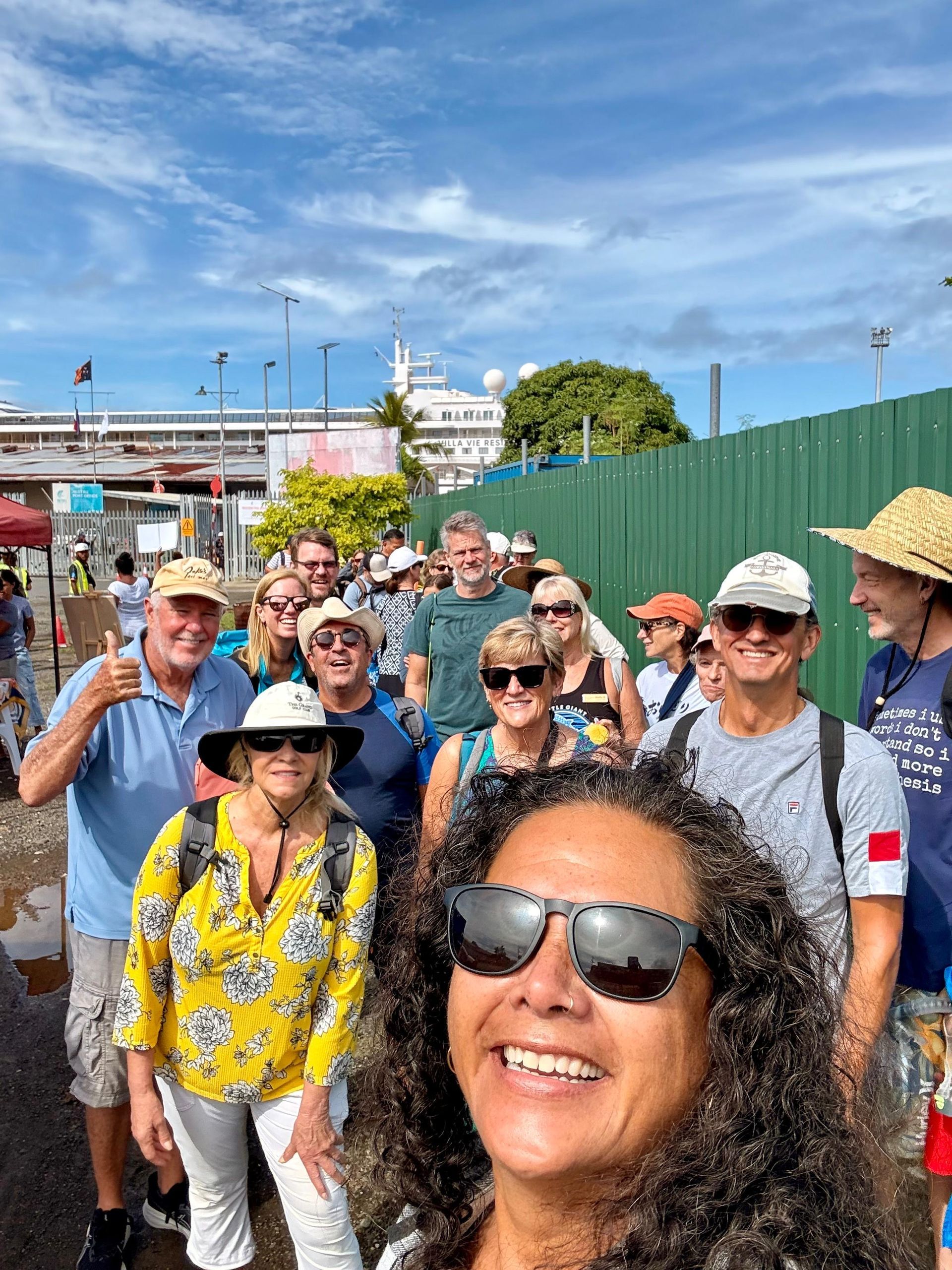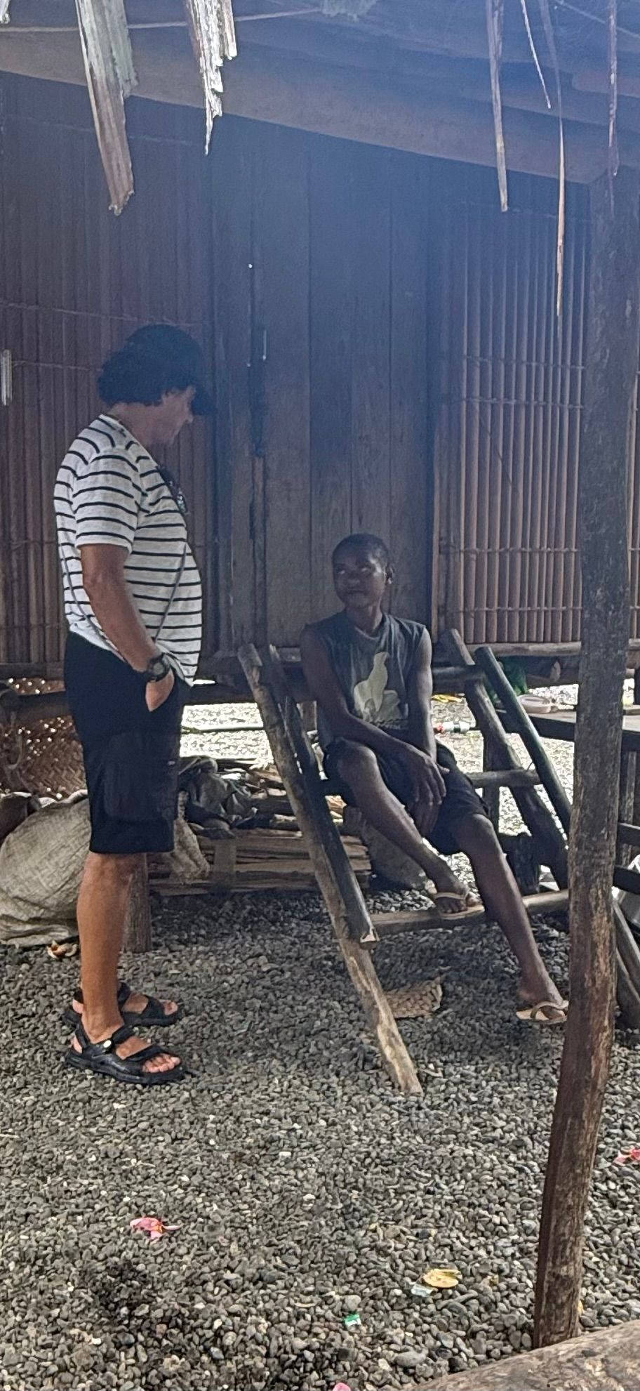 I joined a group of 23 other residents in exploring the Island. It's rained most of the day, but the tour went on! The main road bridge from the port is being replaced, so we had to detour and luckily we didn't get stuck, like others before us ( see below). Farming & fishing are the primary occupations on the island. Poverty is severe and many of the homes lack running water, plumbing and electricity. The people, especially the children were very warm, welcoming and chatty. Alotau averages one Ship a month, however this month 3 are scheduled. We started with a 45 minute ride to meet our guides grandparents at their village where her 89 year old grandfather is the elder in charge. We didn't get to see him there, but we did meet her 85 year old grandmother and a few cousins.