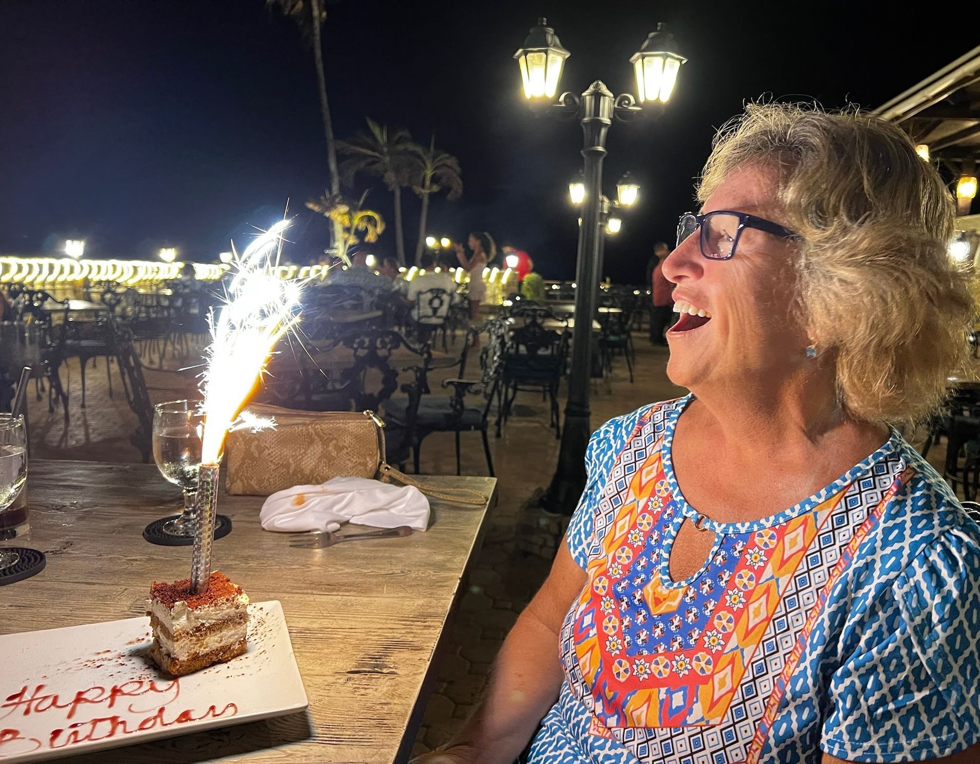 To cap off our FUN week with the Miller's, Bosco suggested we go to one of his favorite restaurants in Aruba, Faro Blanco (or the white lighthouse) at the north end of island. The meal was delicious, lots of homemade pasta and it seemed every table was celebrating somebody's birthday. Not to be left out, when I stepped out to use the restroom, the Miller's and Bosco plotted to celebrate my upcoming Birthday. So upon my return to the table, I was surprised by a flaming torch in a piece of cake with singing wait staff! A nice surprise!