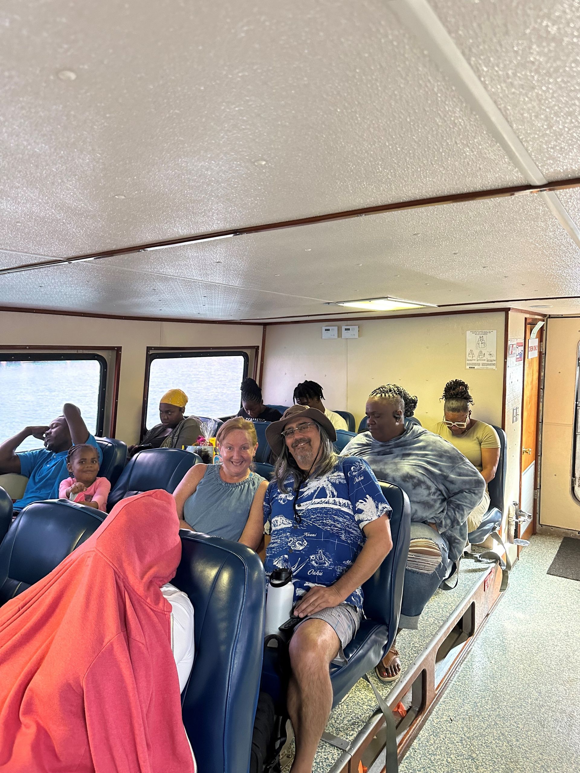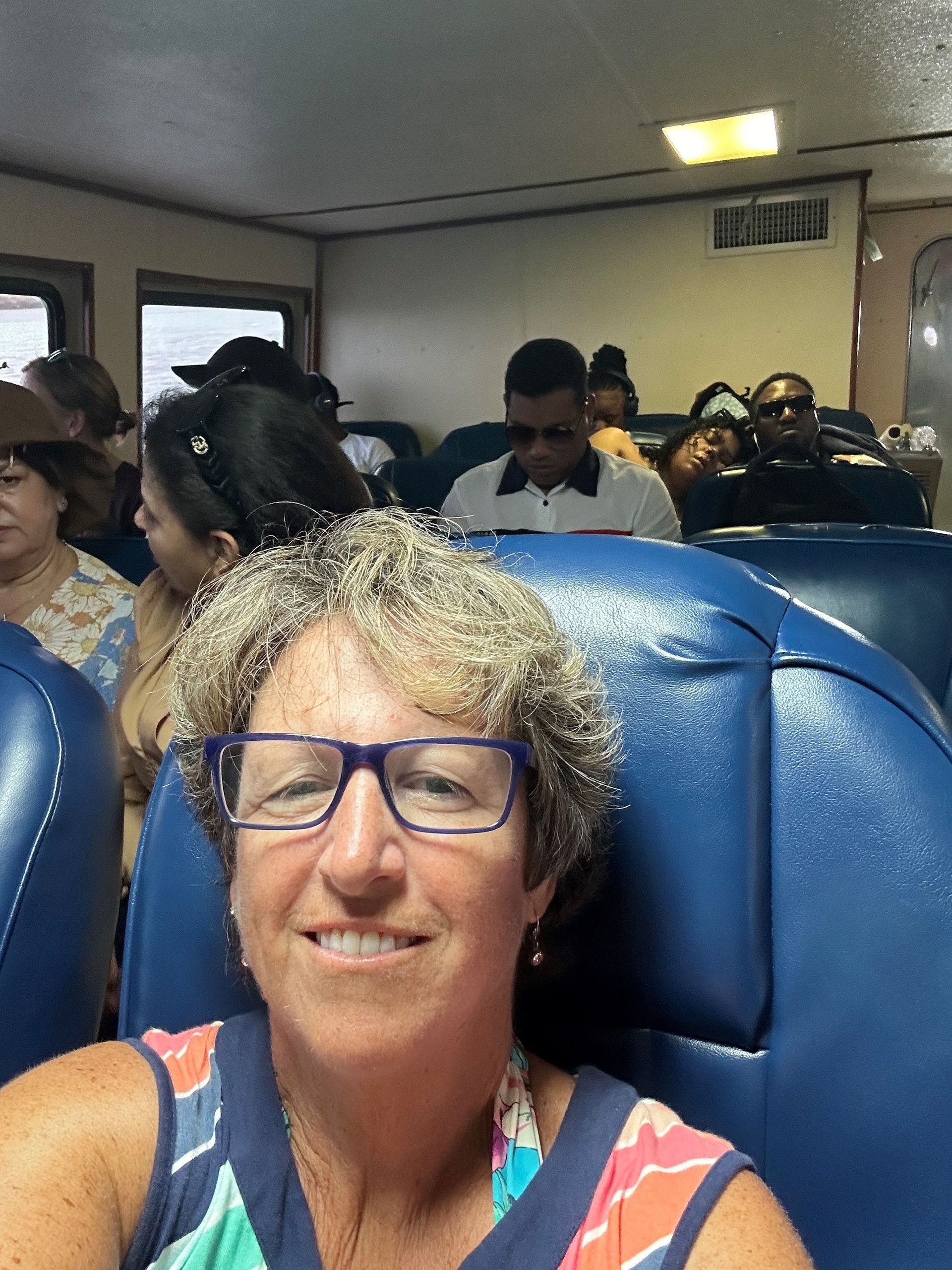 So I had never heard of this island, but Cousin Cathy had done her research and was on it! The adventure starts with a 90 minute ferry ride at 9 am, from Antigua, which we just got into and cleared customs at 8 am. The ferry is $100 / round trip - so I was expecting something nice. The Express Ferry was filling up quickly when we climbed on board. There was upper deck seating, but was toasty in the sun, so we quickly found open seats, inside in the air conditioning of the front cabin. The seats were comfy, while not luxurious. The ride over was very rocky at times, some passengers got pretty green, but we felt ok. Time went by pretty quickly in anticipation.