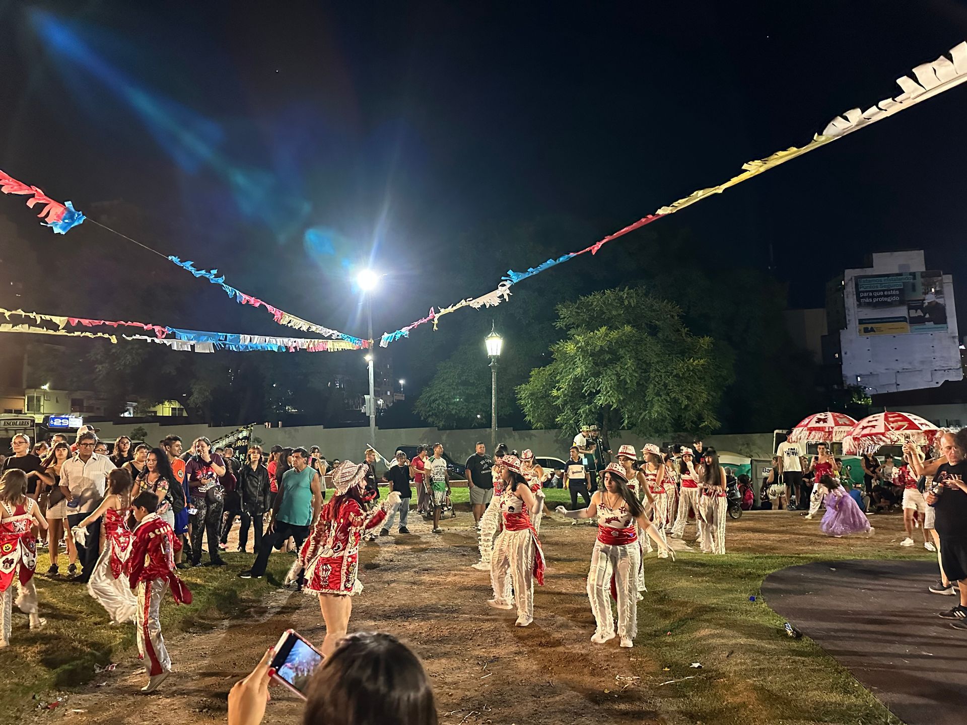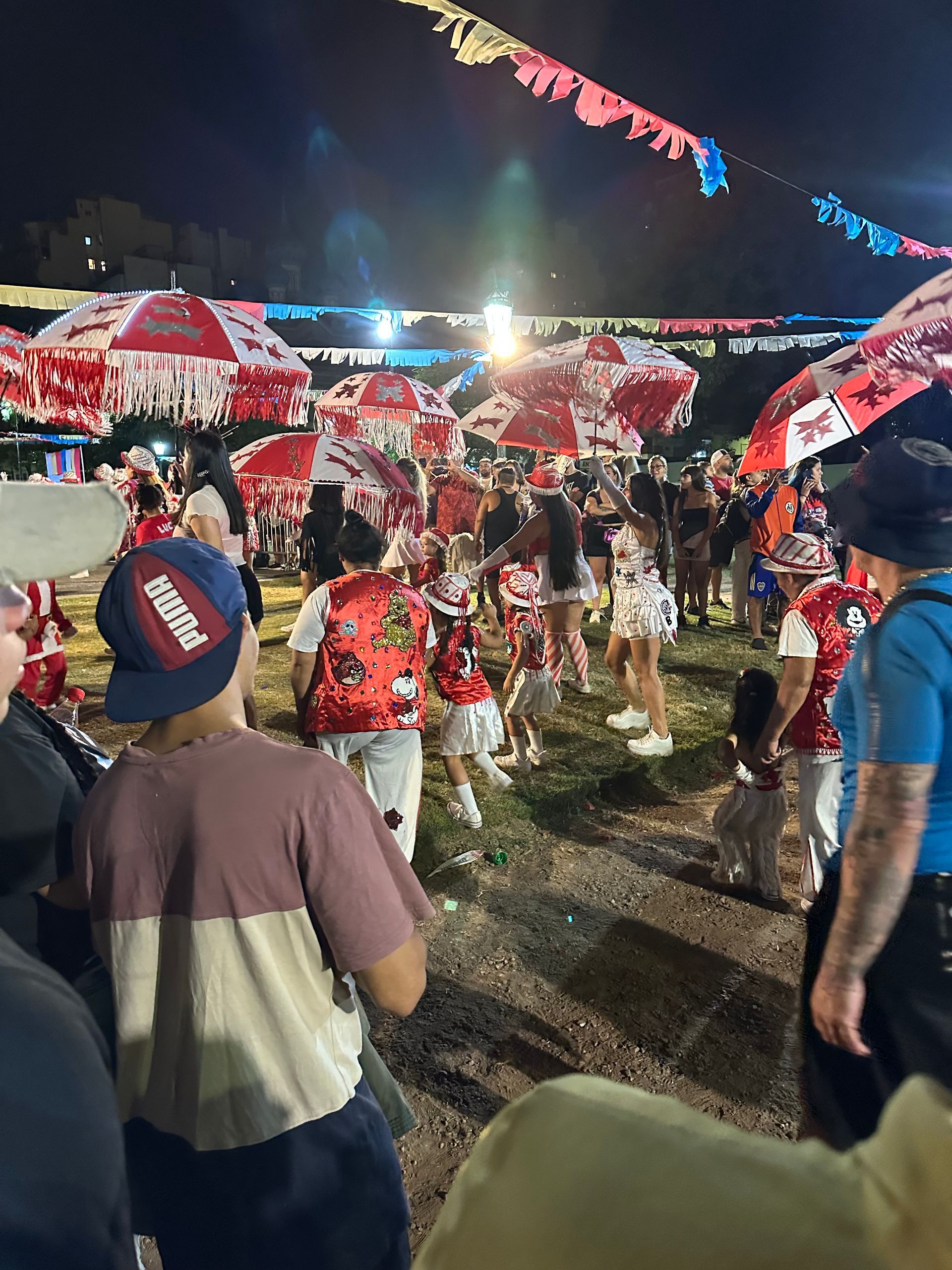 Carribean 7 group - left to right Sarah, Scott, Me, Jimbo, Anna, Sheri, Mirta ( Bob's friend - was an exchange student in high school ) & Bob. Enjoying a Argentine Steak Dinner at Villegas. After dinner we went to a neighborhood Carnival band performance in a local park. Five neighborhood groups performed. We caught the tail end of the last 2 groups. A good taste of what is come in Rio.