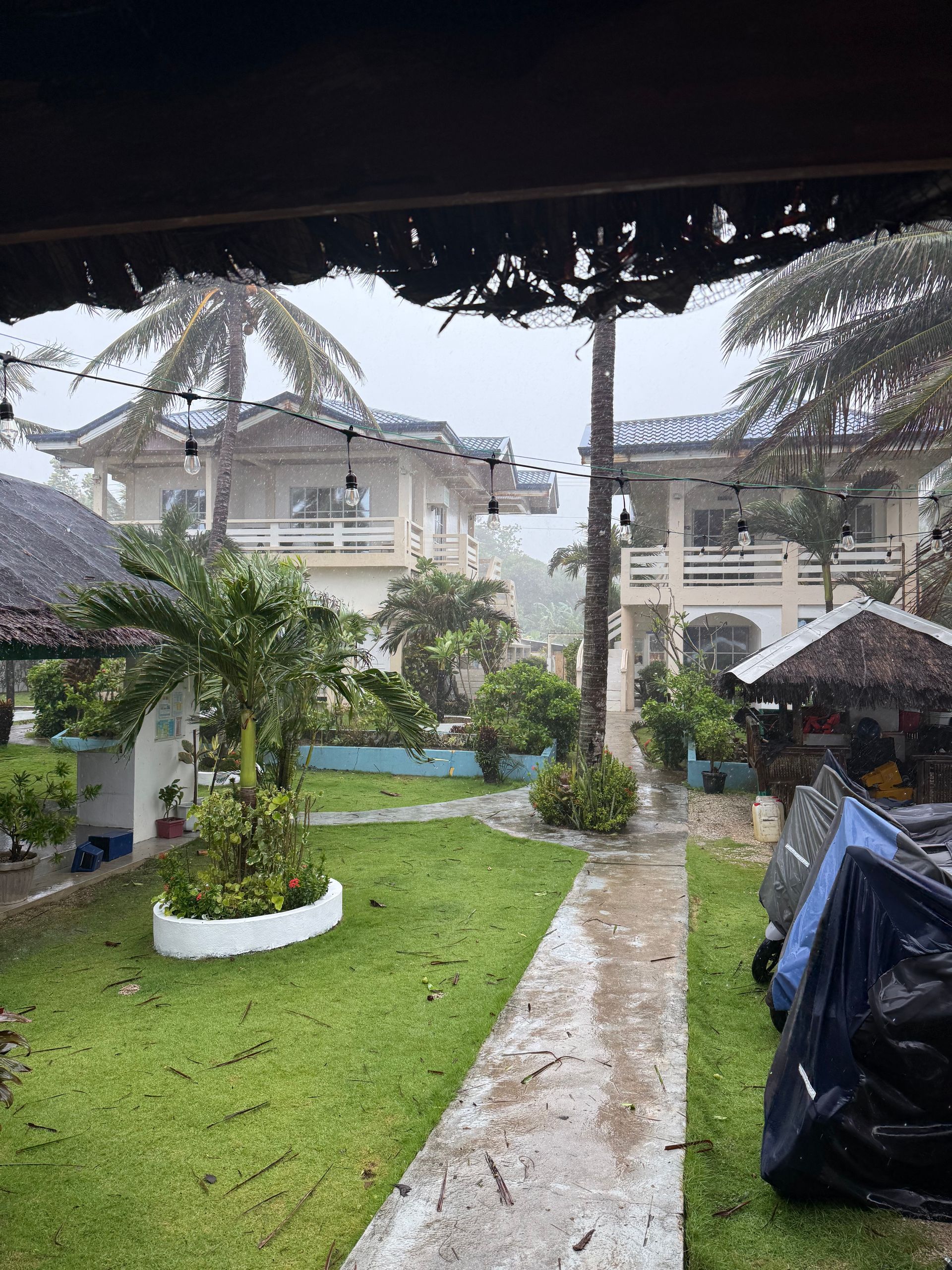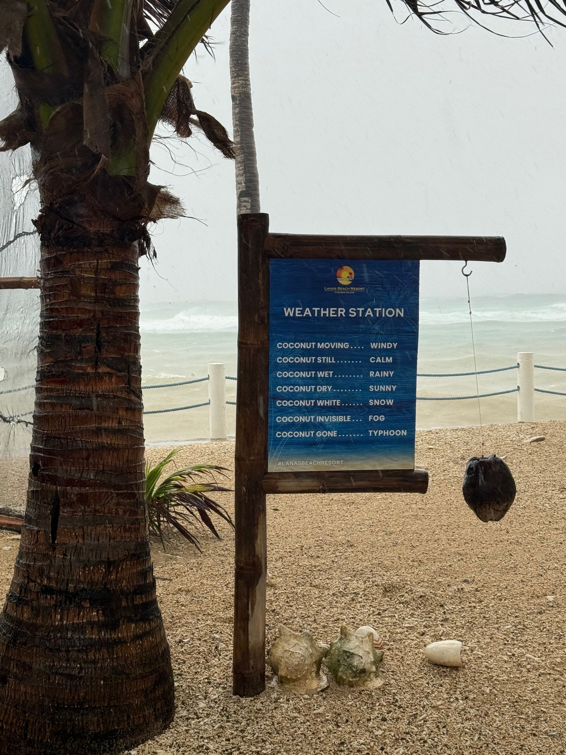 turned and made a beeline for our small island. What we experienced that night was a lot of wind and rain; we awoke to a power outage and pounding wind and rain around 7 am. Our beach front windows & sliding door sills could not keep up with draining. The wind gust rattled the frames so much, that water was seeping in all over our floor. We tried battling with towels, but it was too much. The Resort came to check on us and quickly moved us, to the room Memo and Susan, were supposed to be in and that was set back further from the beach. The whole island was without power for most of the day, but they had emergency generators for essentials. The Typhoon hit our island around 1pm, it sank 2 boats, but we have not heard of any other major damage. We had breakfast, chatted with staff about other storms and played