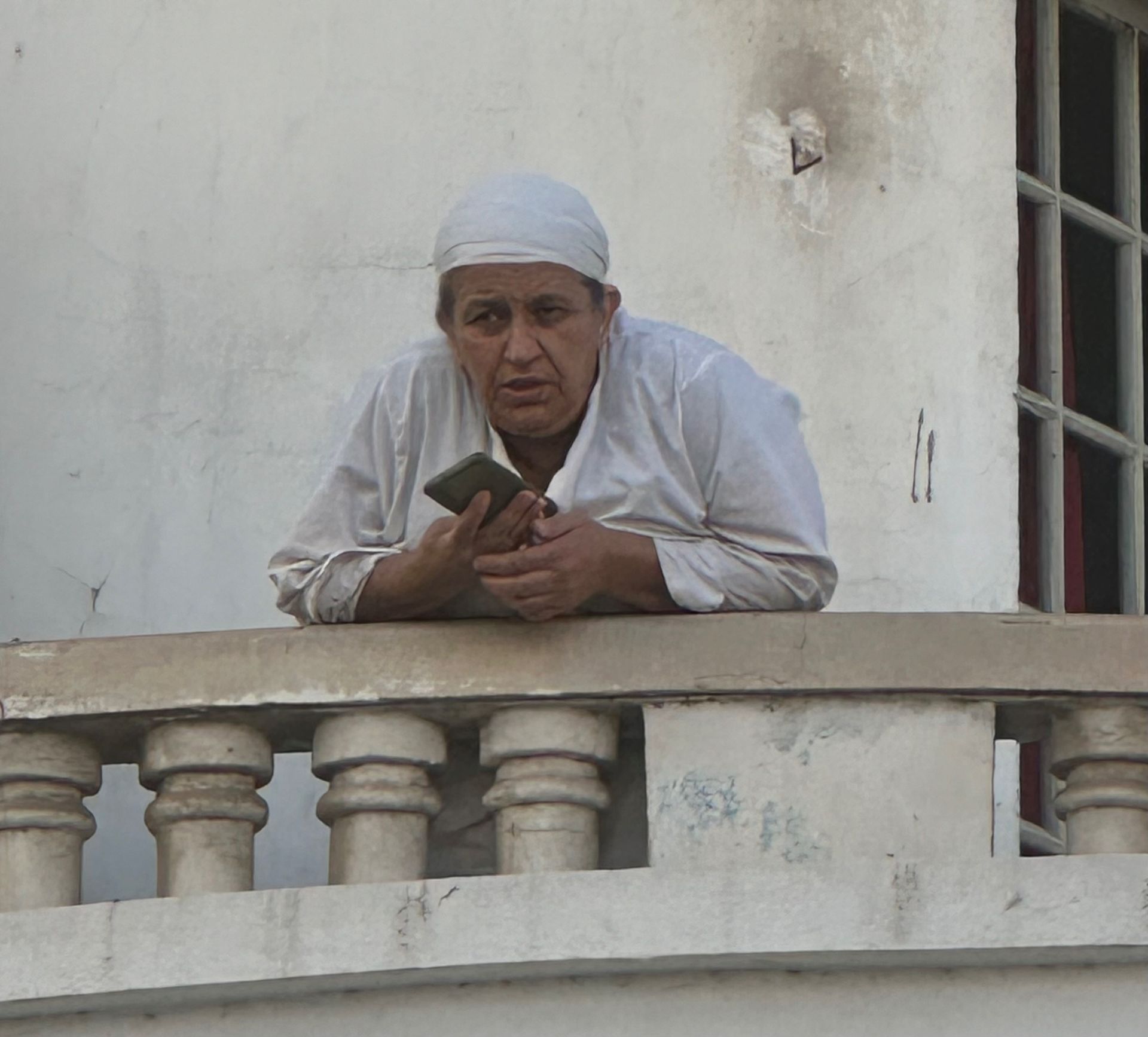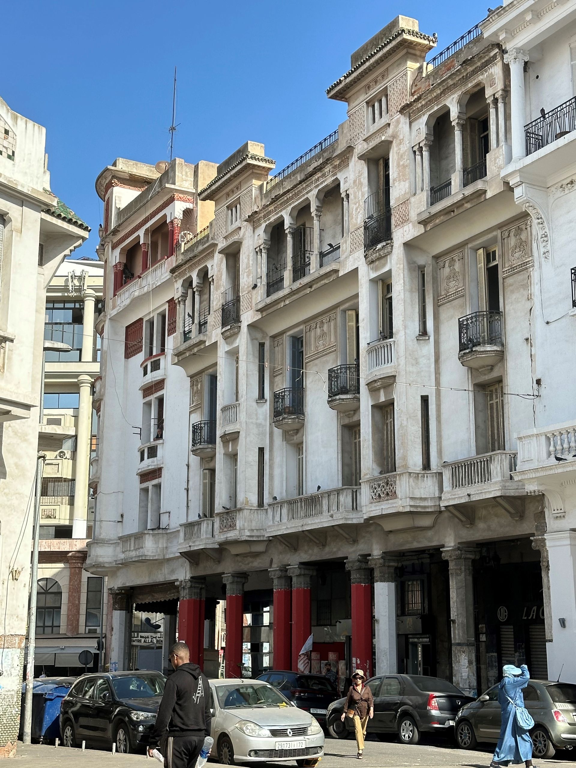 French influence in architecture - Muslim buildings never have windows or balconies - don't want their women seen. Water men in red dress - sell water out of leather pouch, poured into gold cups they carry. One lady who may not be Muslim, looking down from Balcony.