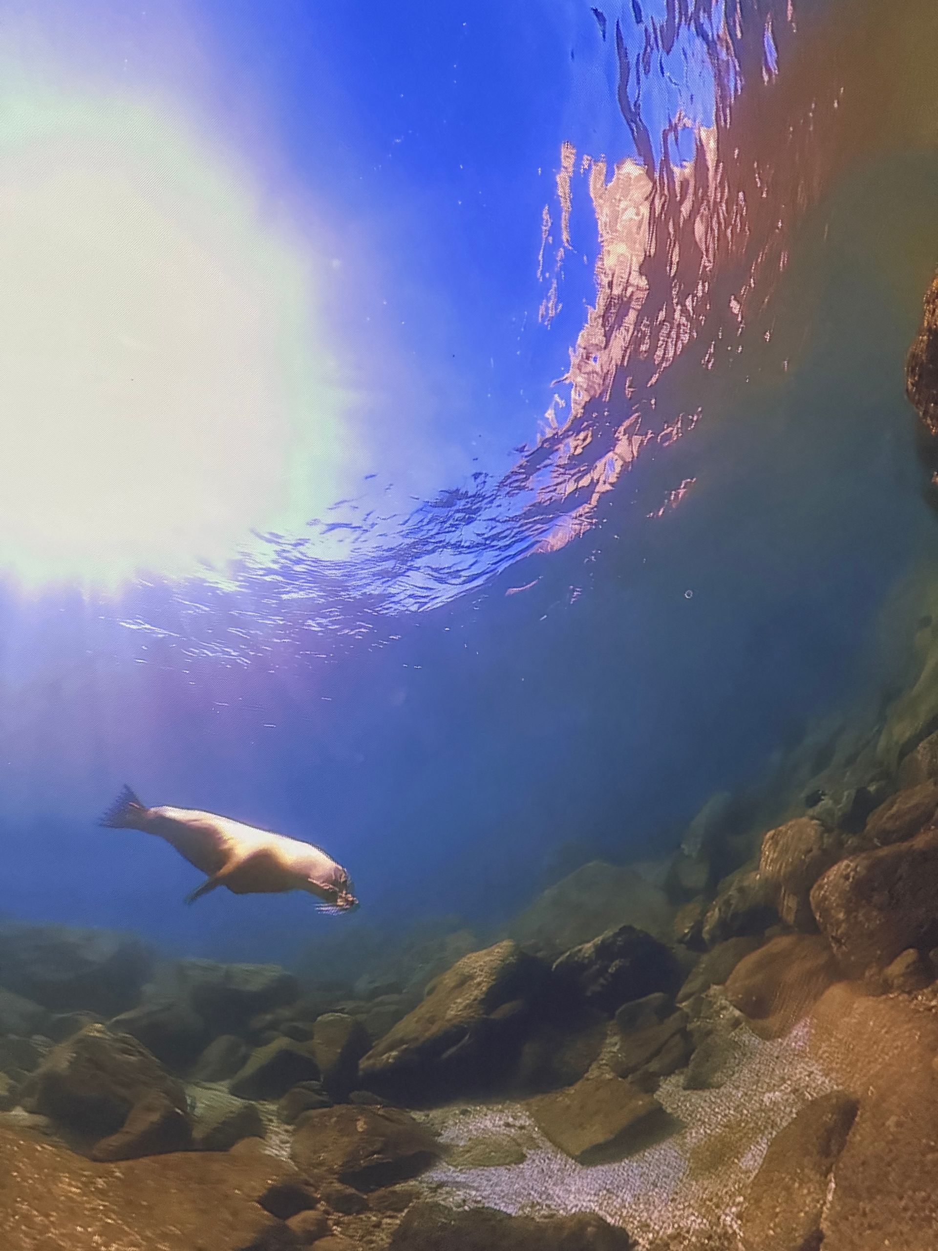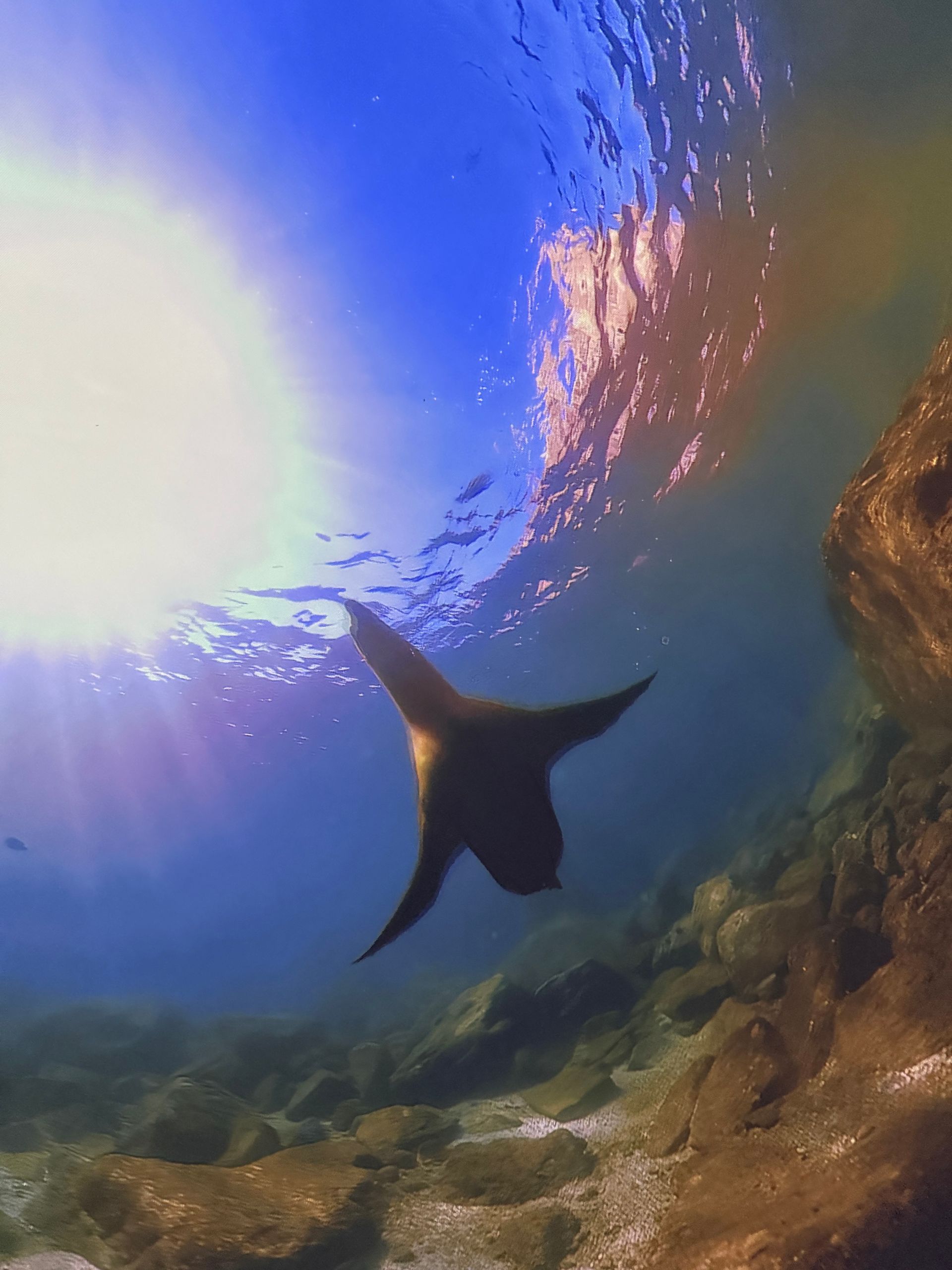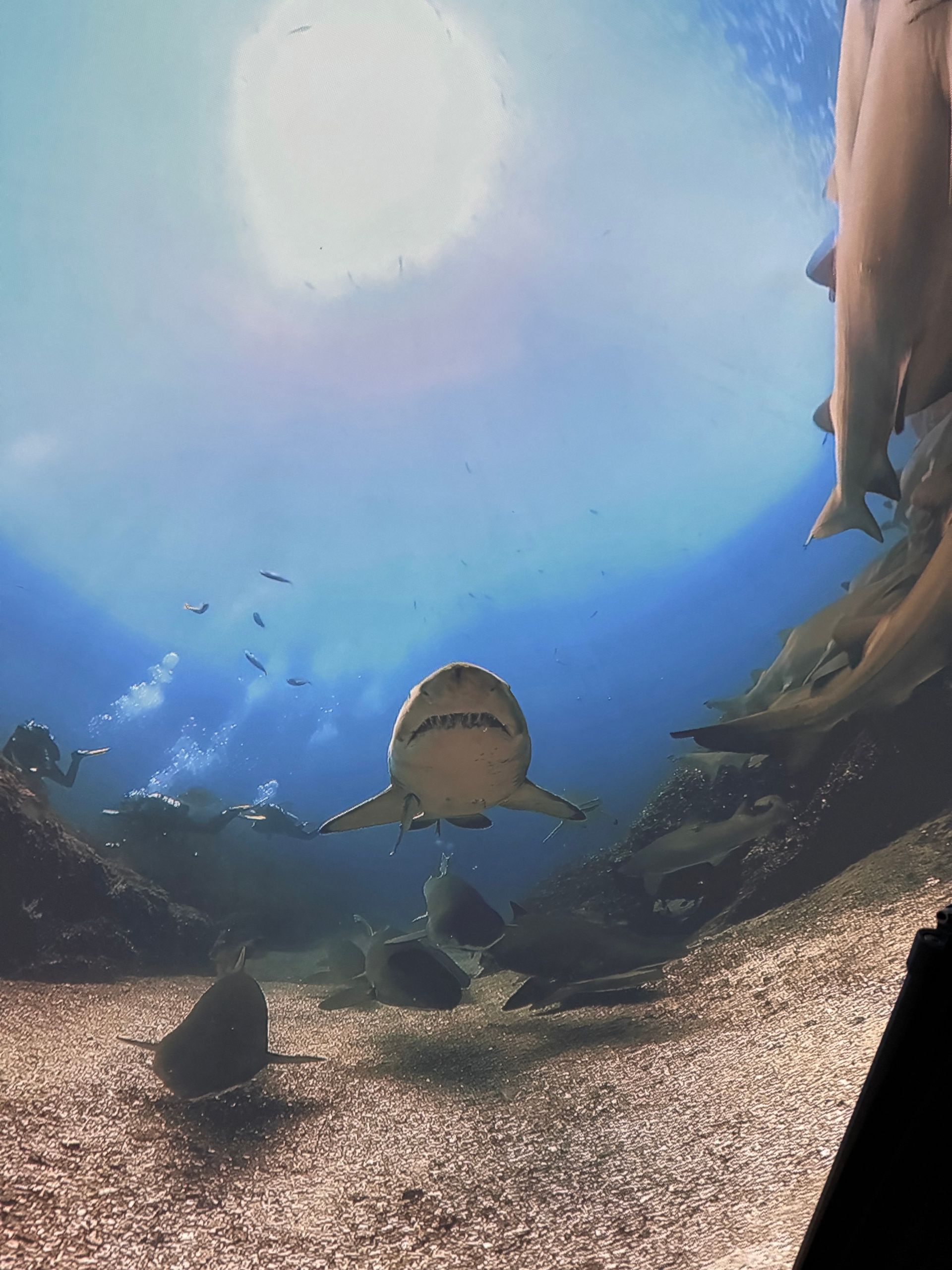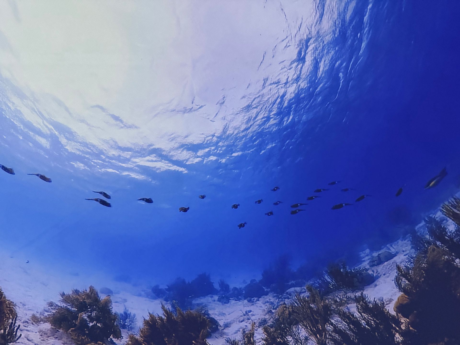 After Parasailing, I decided to skip lunch and indulge my curiosity in learning to Scuba Dive. There was a theater in town called IMMERSED and it was a dome shape. You laid on bean bag chairs and got immersed watching a 30 minute film with dive breathing sound effects, so you got the sensation you were diving in some of the greatest underwater spots through out the world! I loved it but also realized I didn't enjoy the dark cave dives. I never knew how stunning the surface of the water looks from deep below!