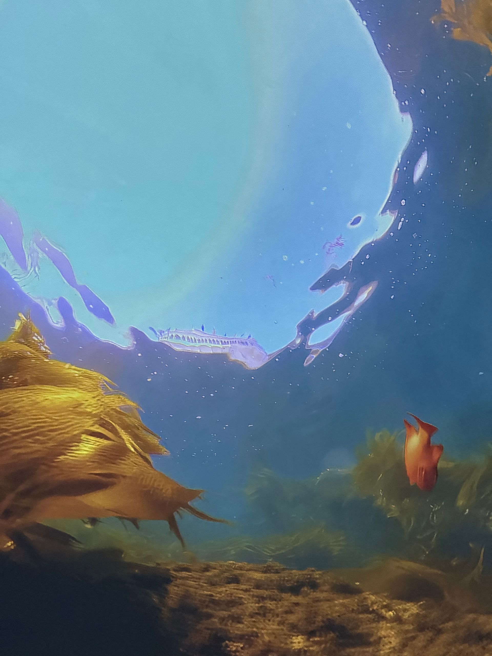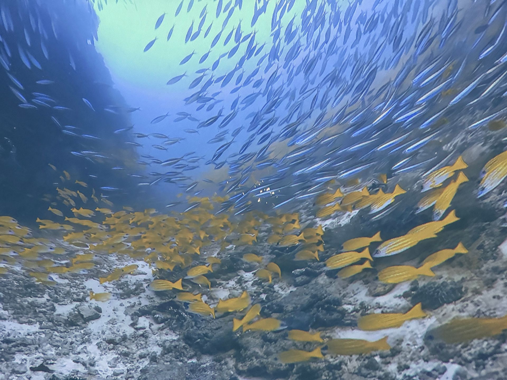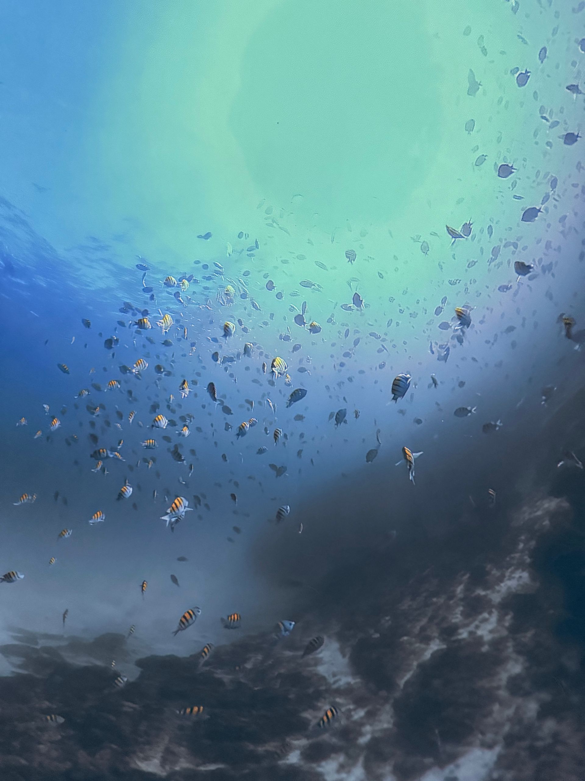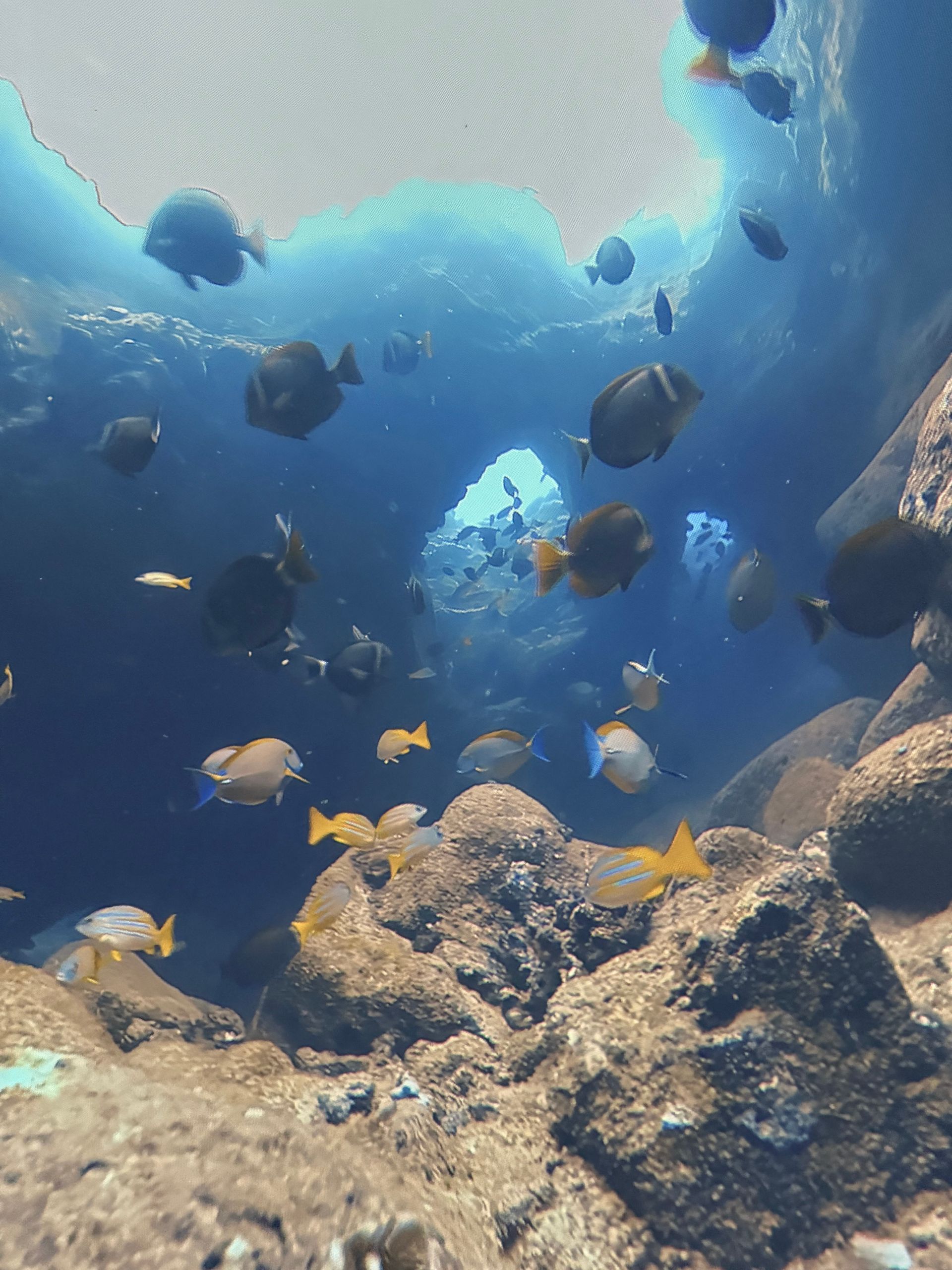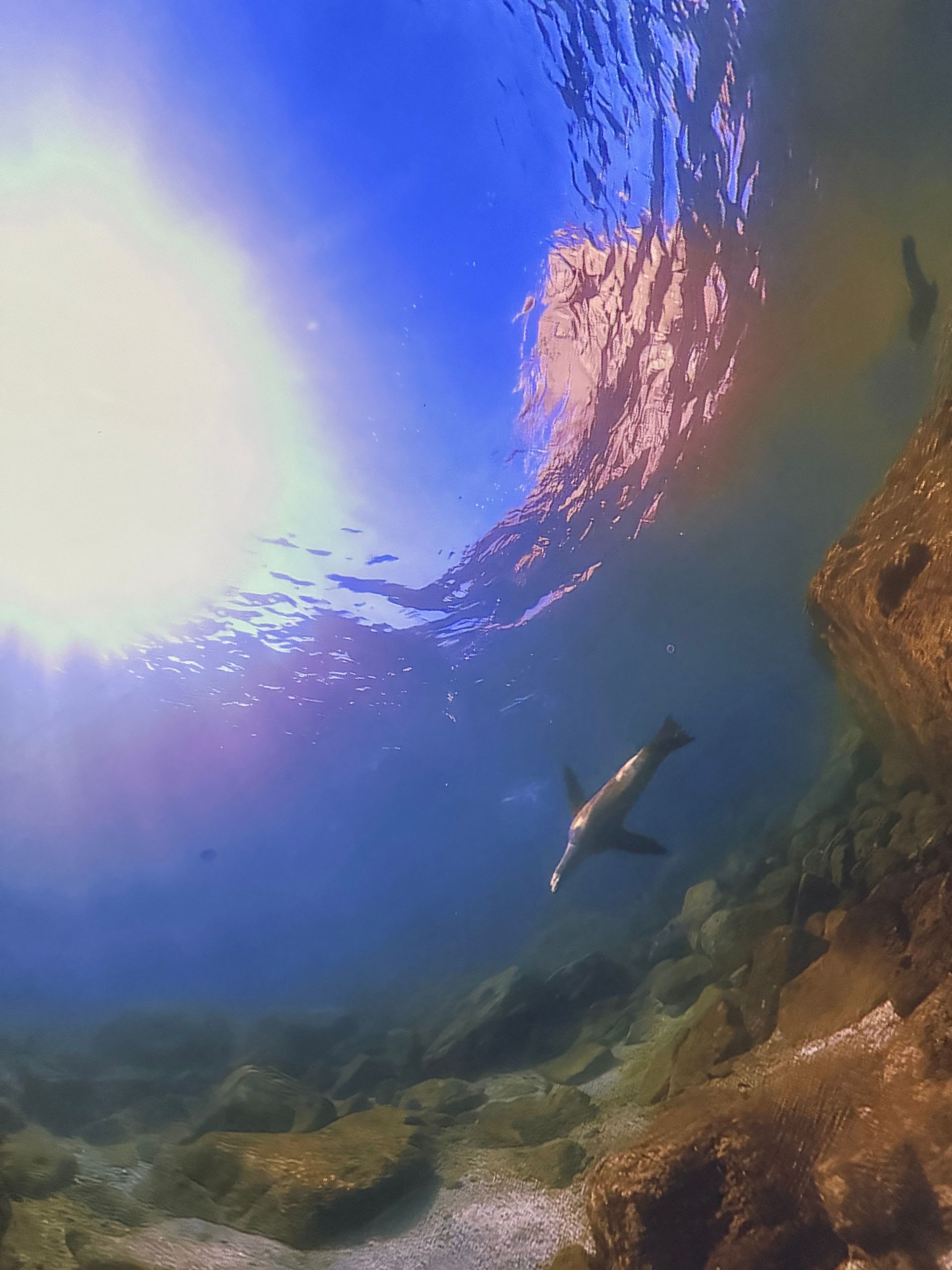 After Parasailing, I decided to skip lunch and indulge my curiosity in learning to Scuba Dive. There was a theater in town called IMMERSED and it was a dome shape. You laid on bean bag chairs and got immersed watching a 30 minute film with dive breathing sound effects, so you got the sensation you were diving in some of the greatest underwater spots through out the world! I loved it but also realized I didn't enjoy the dark cave dives. I never knew how stunning the surface of the water looks from deep below!