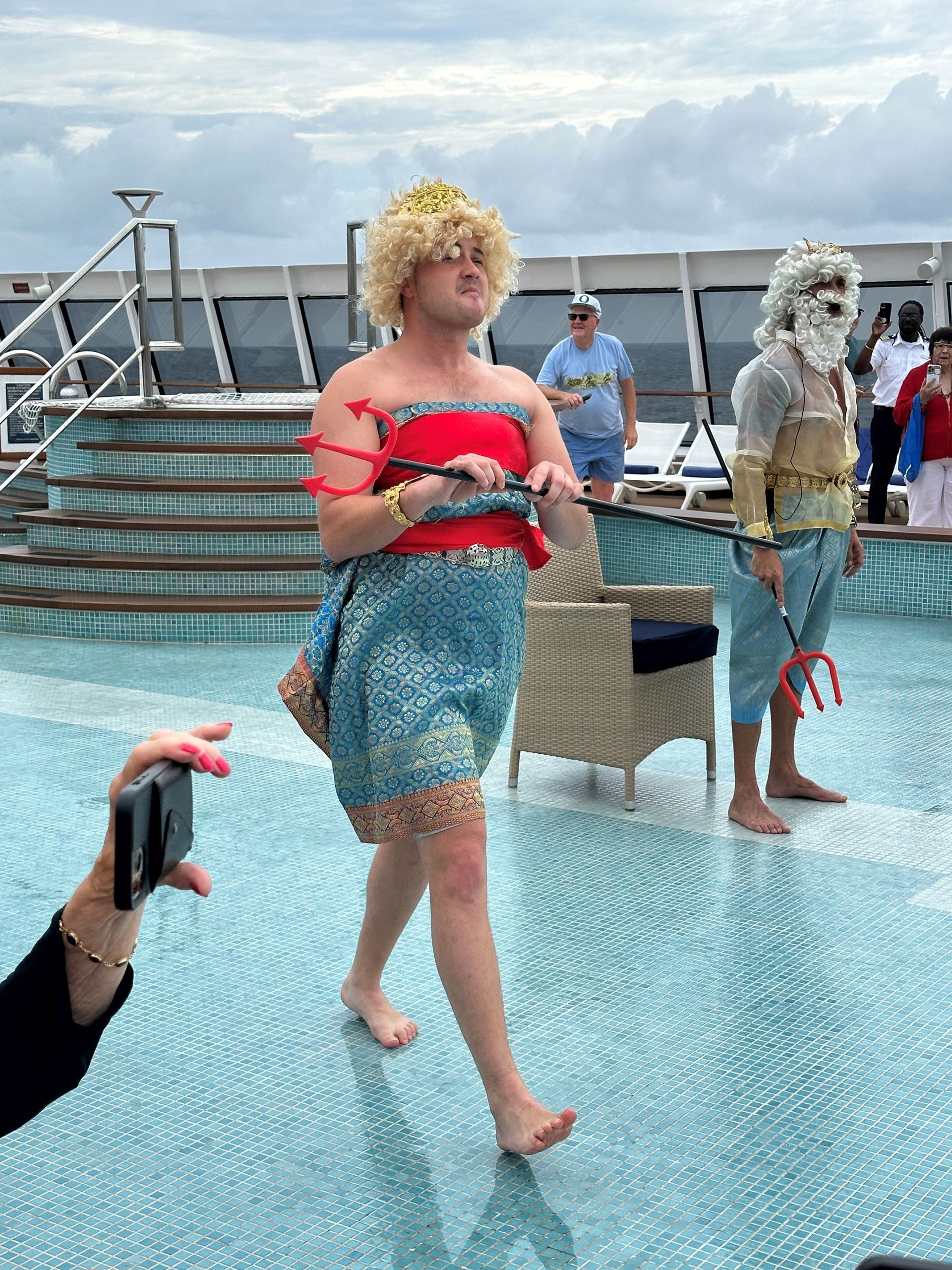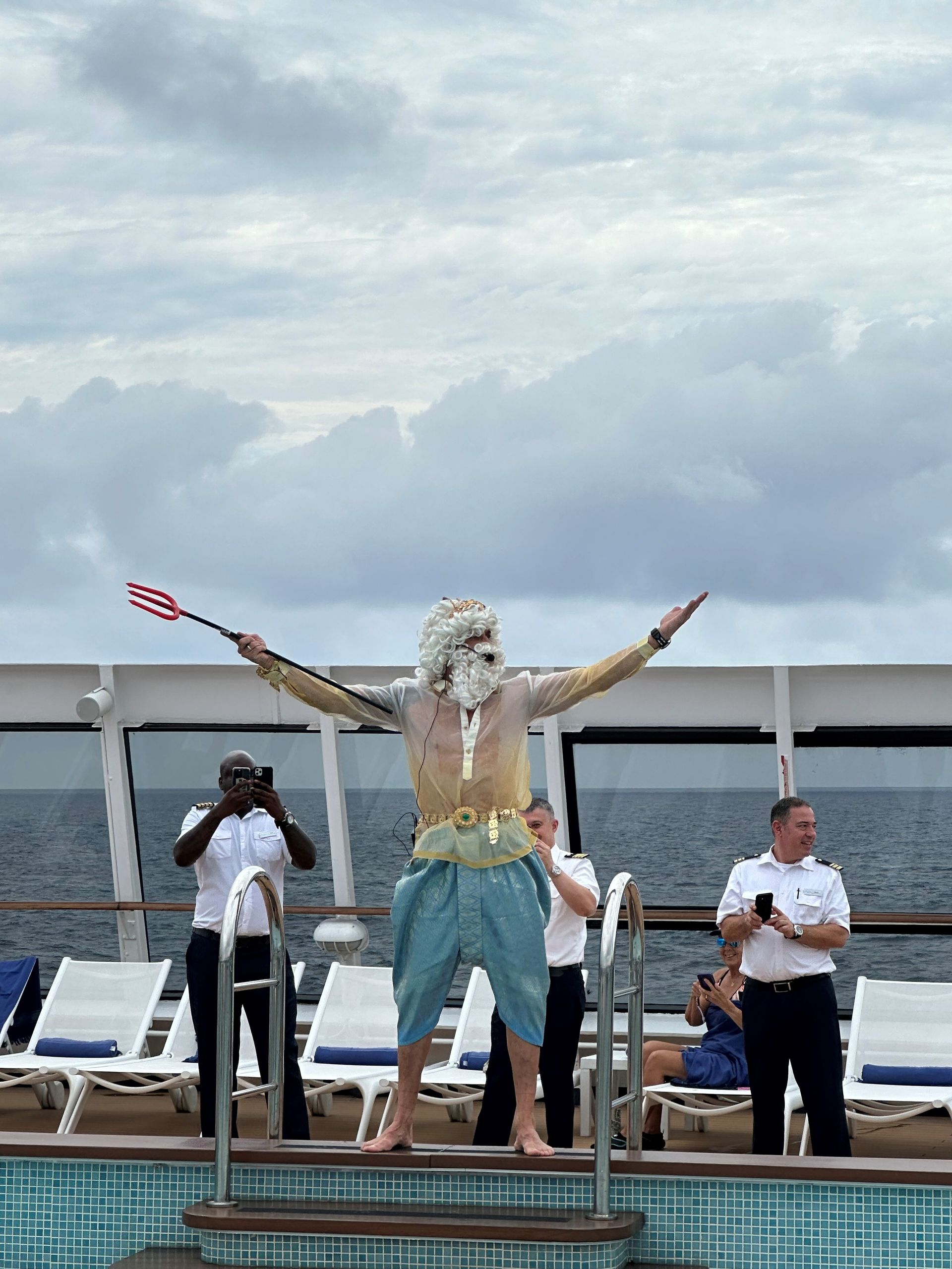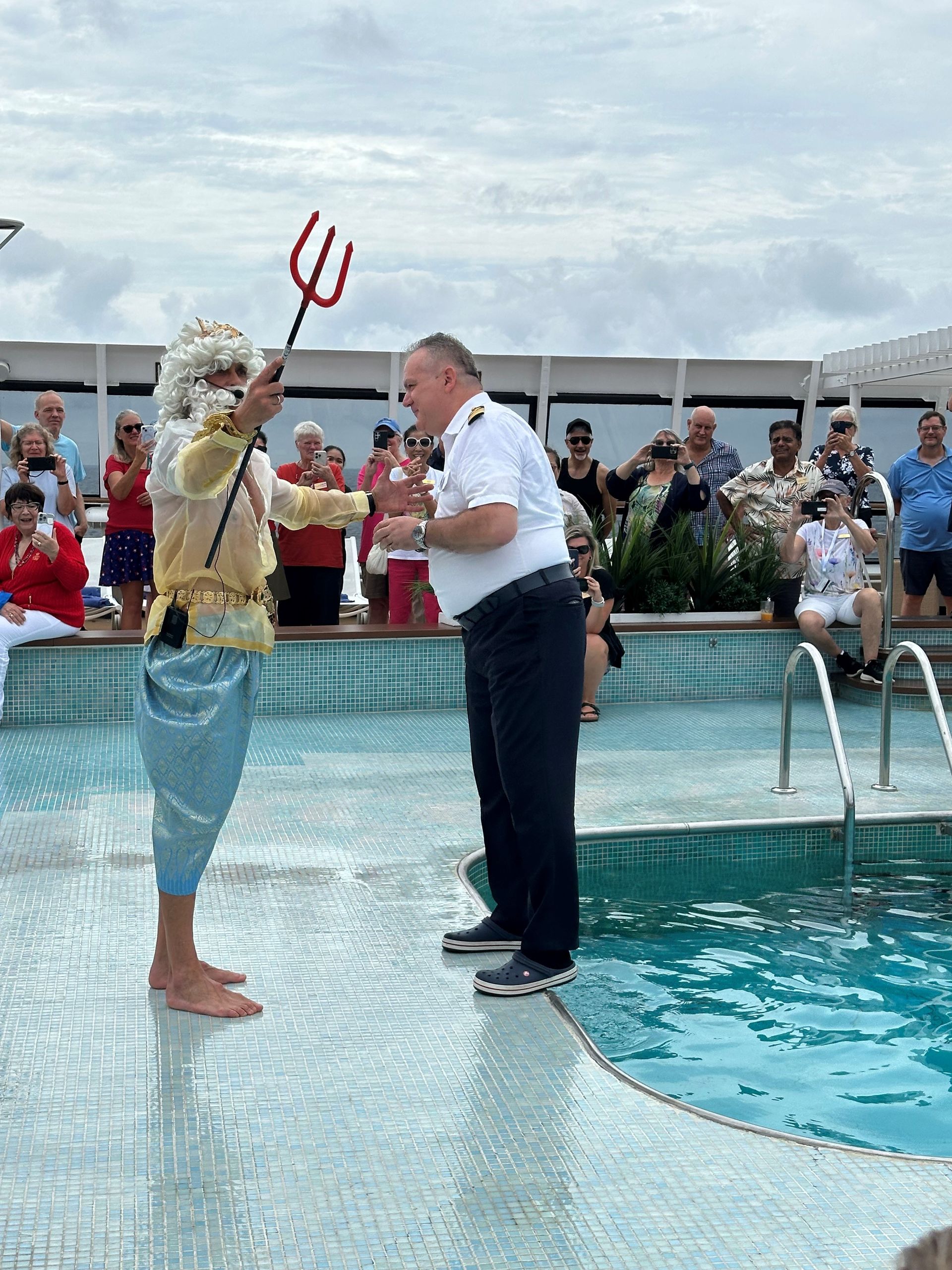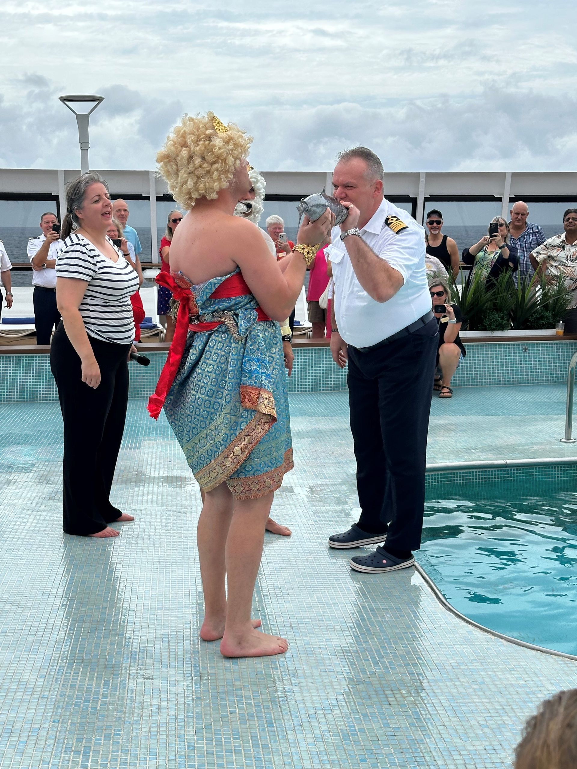 I never knew this Ship tradition, but passengers and crew who have never crossed the equator on a Ship need to participate in a Crossing the Line or Neptune Day Ceremony. It's an ancient naval tradition, involving a series of tests and pranks that prove you are worthy to change. Our test involved the Captain willing plunging into the pool and all of us Pollywogs kissing a fish, getting sprinkled with sea water and then presented with a flower lei, graduating to a Shellback! We technically crossed the equator at 5:29 a.m. but they let us sleep and have breakfast and did the ceremony at 10:00am! Must say the Welcome to the Equator signs were impressive!