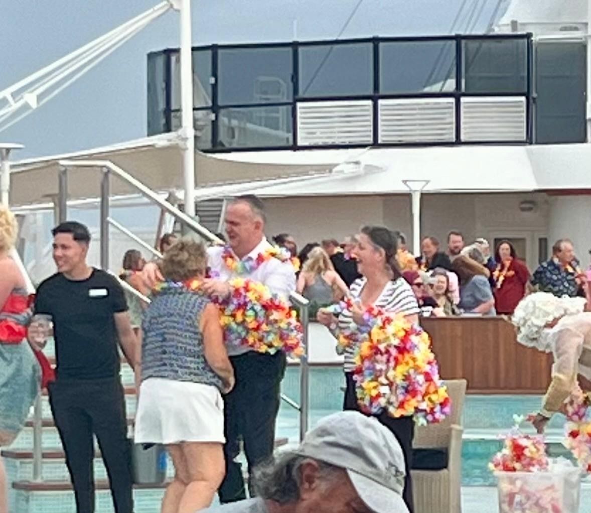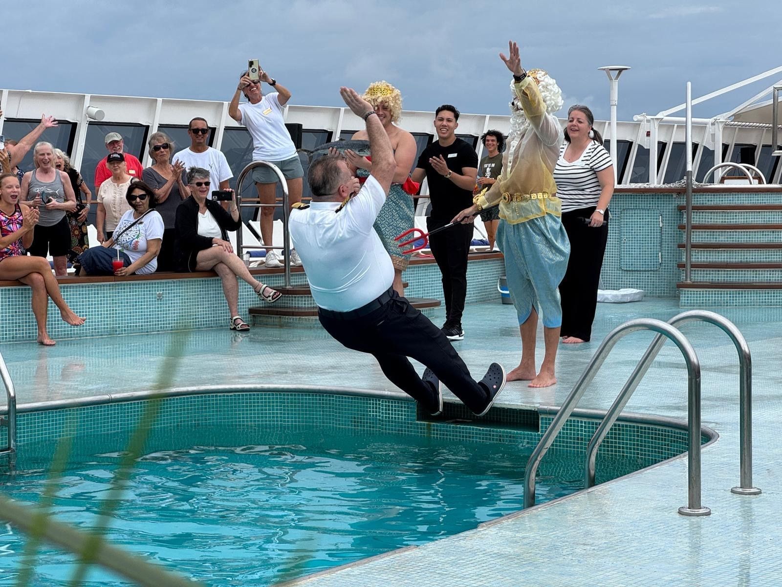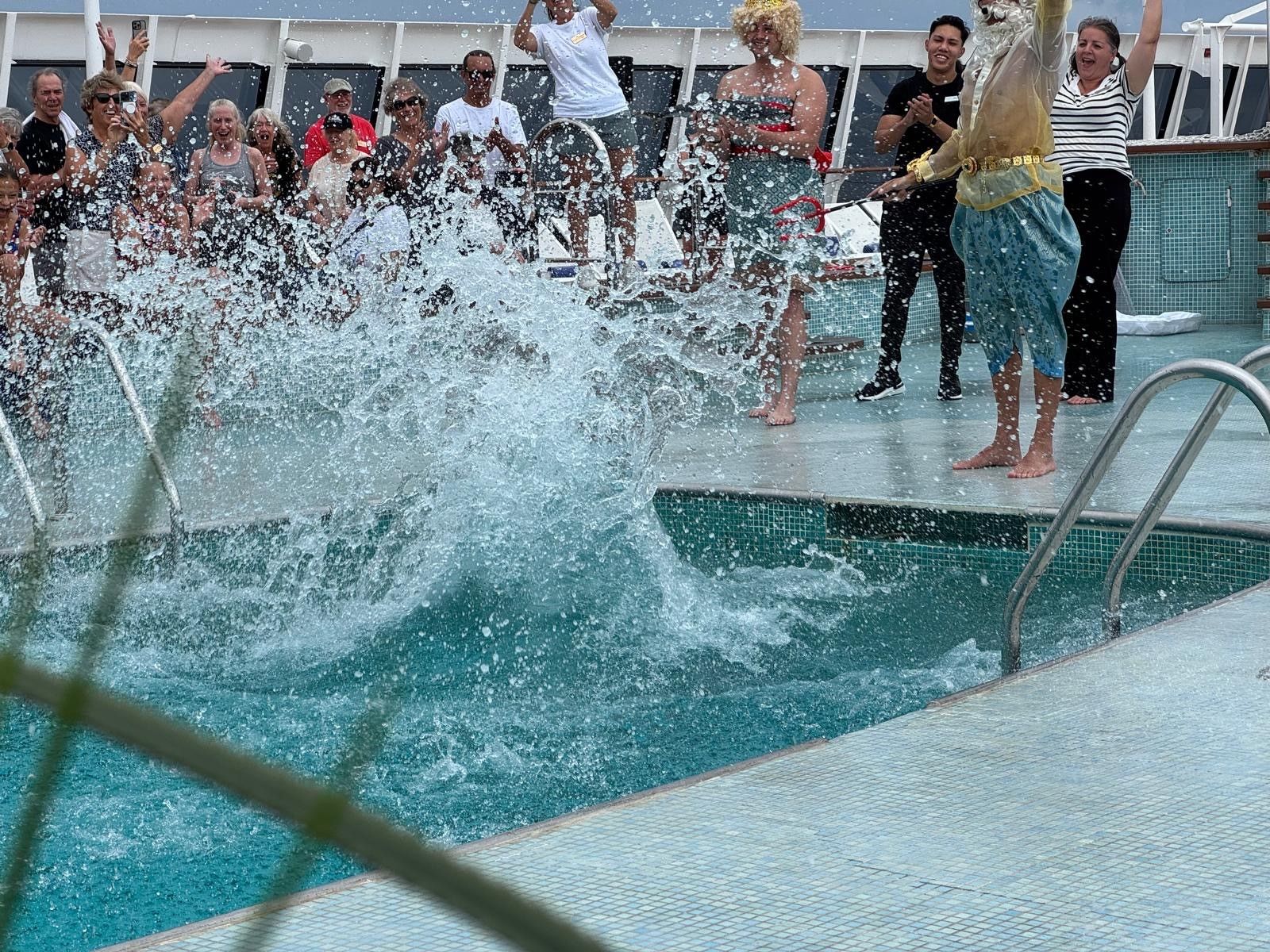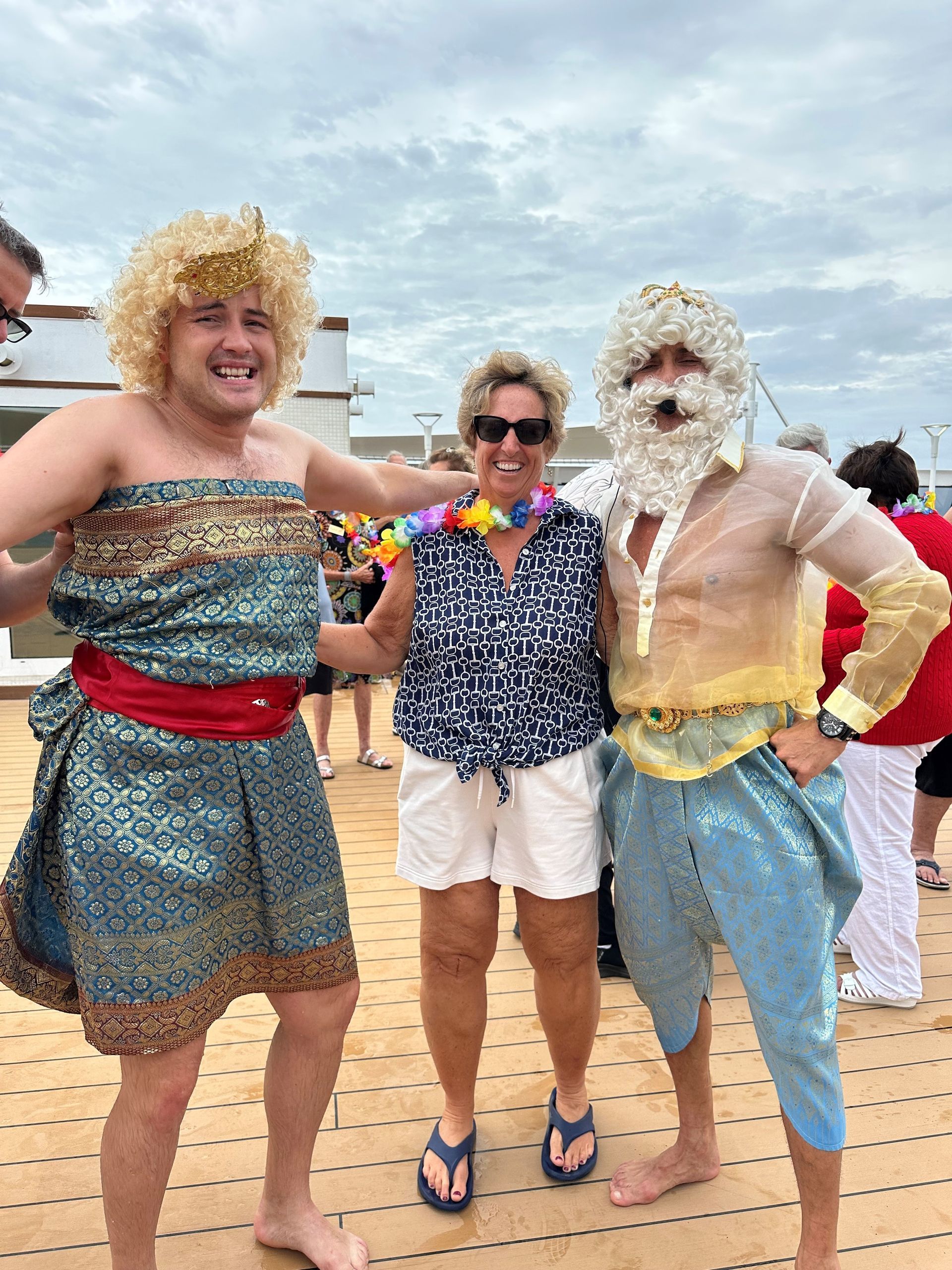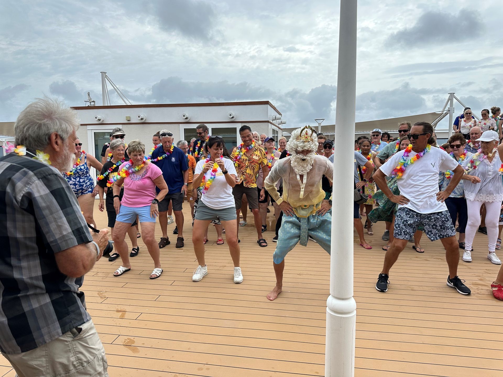 I never knew this Ship tradition, but passengers and crew who have never crossed the equator on a Ship need to participate in a Crossing the Line or Neptune Day Ceremony. It's an ancient naval tradition, involving a series of tests and pranks that prove you are worthy to change. Our test involved the Captain willing plunging into the pool and all of us Pollywogs kissing a fish, getting sprinkled with sea water and then presented with a flower lei, graduating to a Shellback! We technically crossed the equator at 5:29 a.m. but they let us sleep and have breakfast and did the ceremony at 10:00am! Must say the Welcome to the Equator signs were impressive!