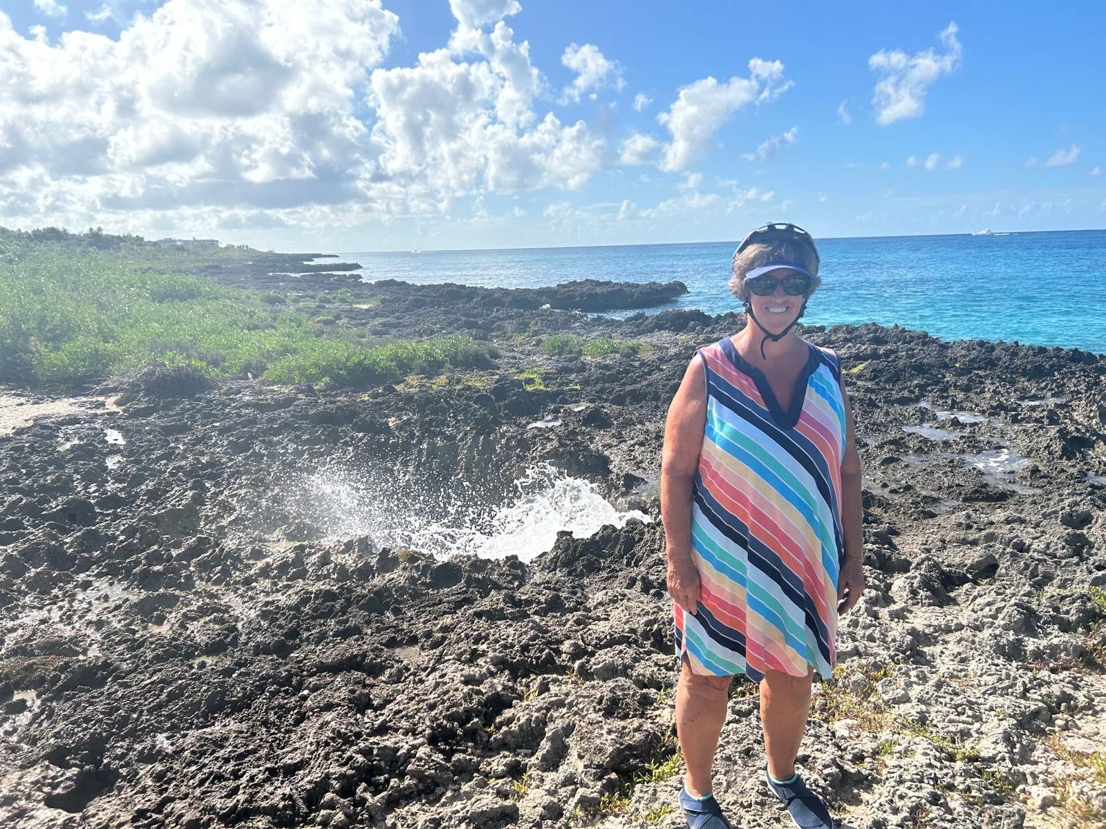 My neighbor David Austin and his visiting girlfriend, Suzanne, put together a bike tour of Cotubanama National Park , Bayahibe Beach and Chico Cave for six of us. Above Jim Maas is on the right and Jim Arsenault on left. Joe Wheeler,was also on excursion, but did not join in for picture. Bayahibe was a nice beach town, that we biked all around and then we hiked to Chico cave and went down for a dip in cool spring water. At the edge of beach, there were blow holes, that gave us some refreshing sprays.