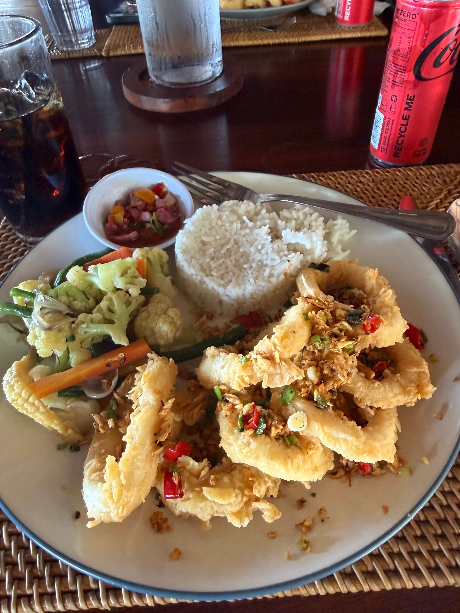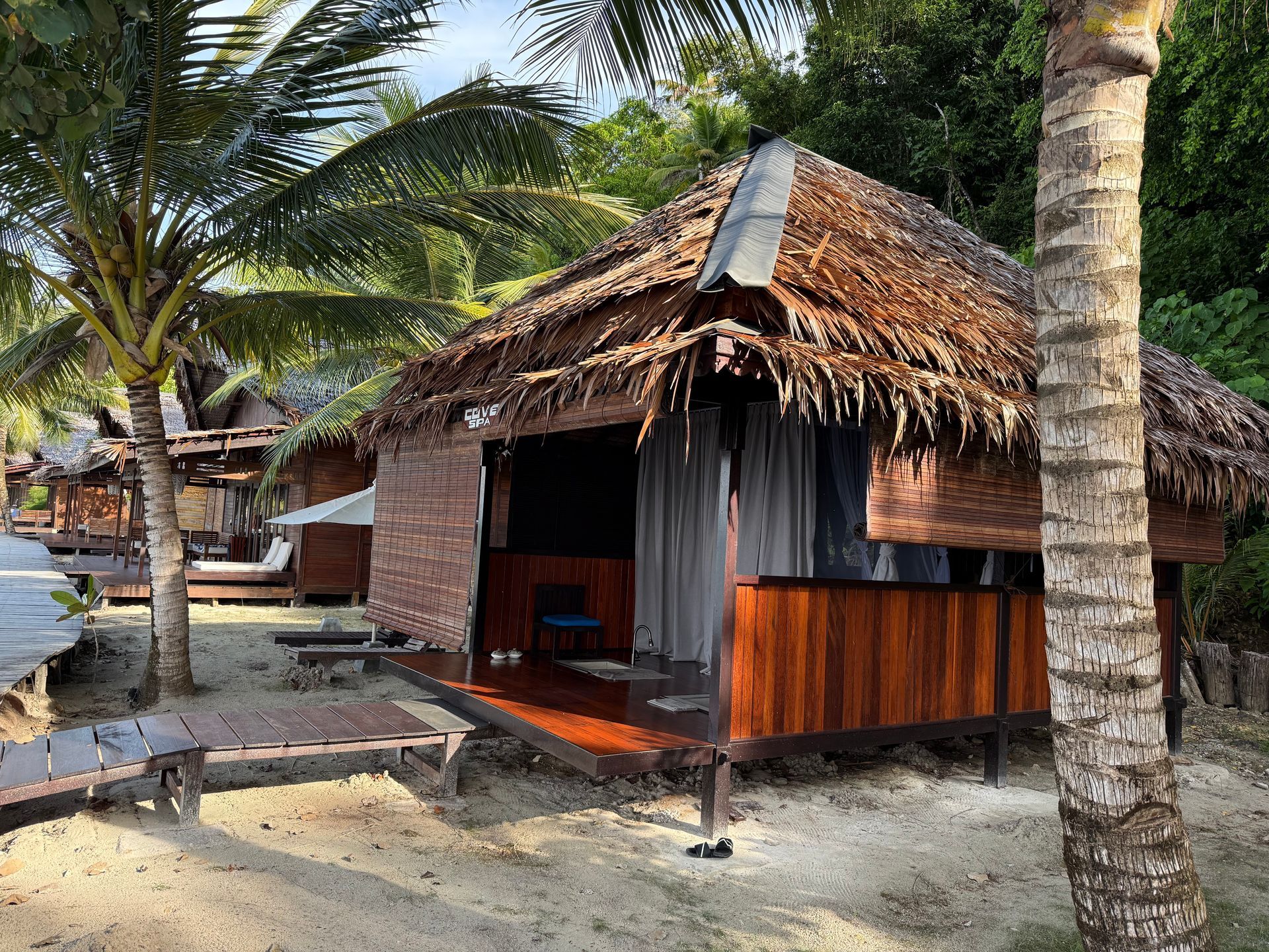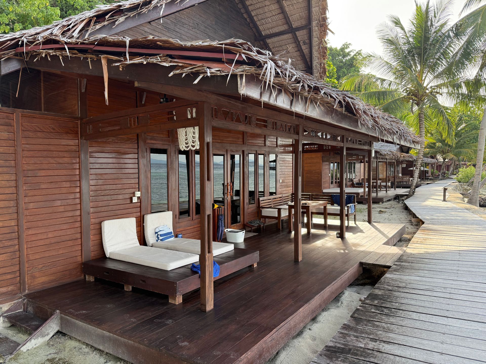 When Camie and Timothe got engaged I spoke to the Resort and arranged a special dinner on the dock for them and they also decorated their suite. It was lovely and Bosco and I also paid for their drinks that evening. The next day, the Manager of the Resort sought them out, after breakfast and said he also had a special treat for them. I was sitting with them and he has a thick Indonesian accent and what we heard was he was going to meet them at 8 pm and take them into jungle, behind our huts and take them to get coconuts, that come in many colors? We also heard him say they make a special treat, very sweet and we thought he said crepes? We were intrigued, but also curious why at 8pm in the dark and he also mentioned cholesterol?? The rest of the day, we joked about the great coconut adventure they were about to get! Special newly engaged package!