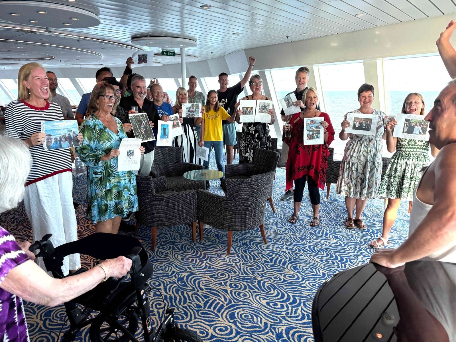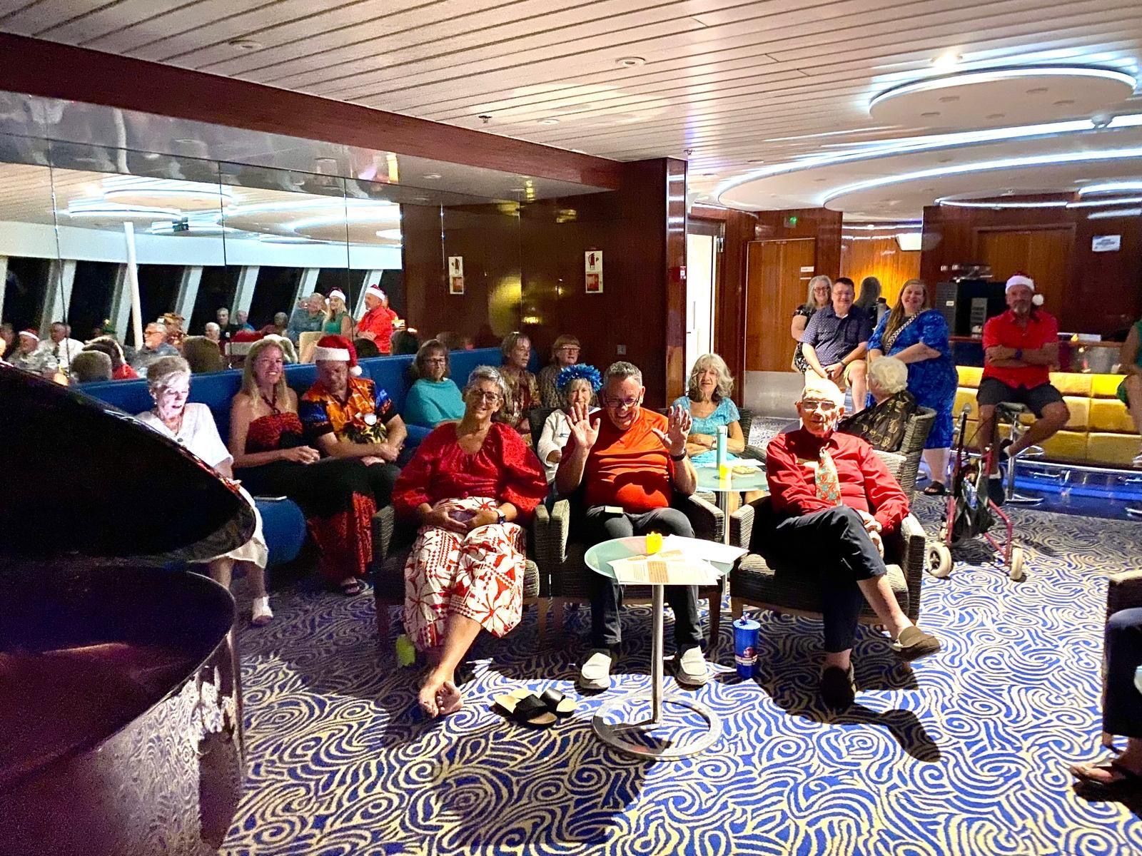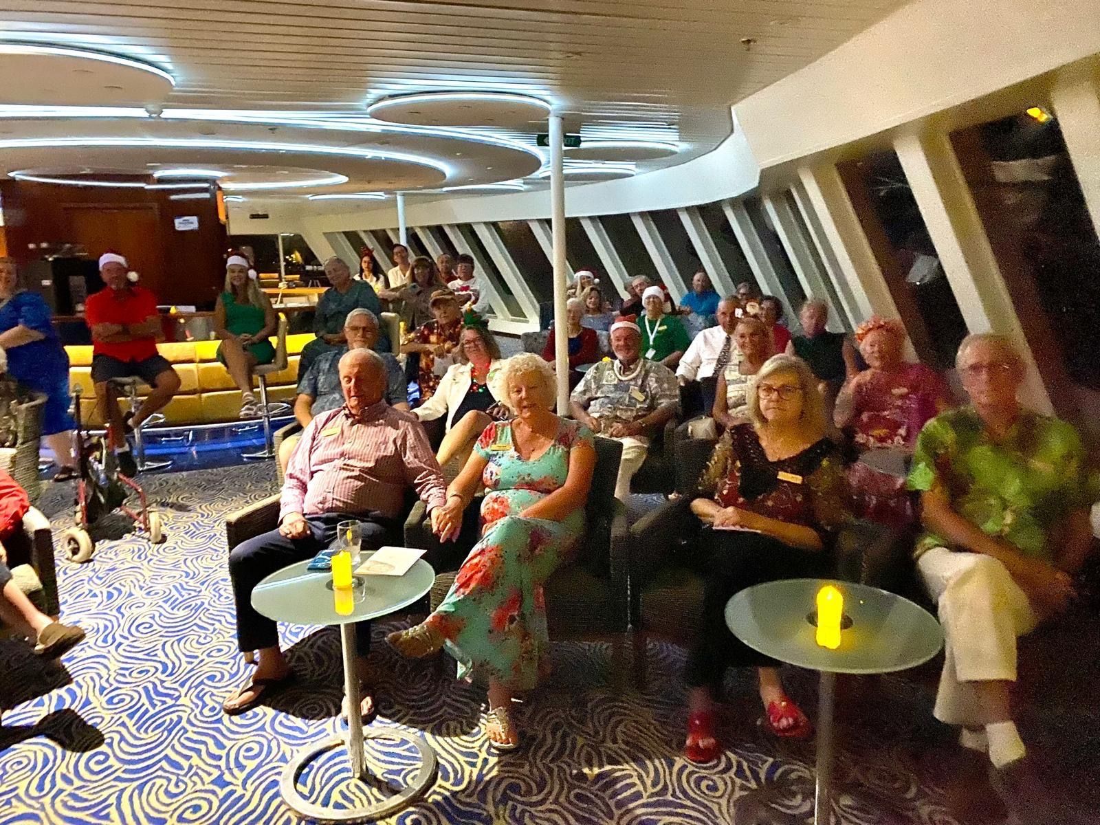 Another night, 30 of us surprised a good friend with a night of recognition for all his time, efforts and talent in organizing excursions for us! Ben, a retired Harvard lawyer whose career was notable as an AIDS activist and then later as an outspoken drag queen, is one of my favorites on board. Of course, he grew up in the suburbs of Philadelphia! We each printed a photo of ourself with Ben, on an outing and wrote him a note about why we appreciate him so much. His 99 year old mom was there and it was so touching and deserved!