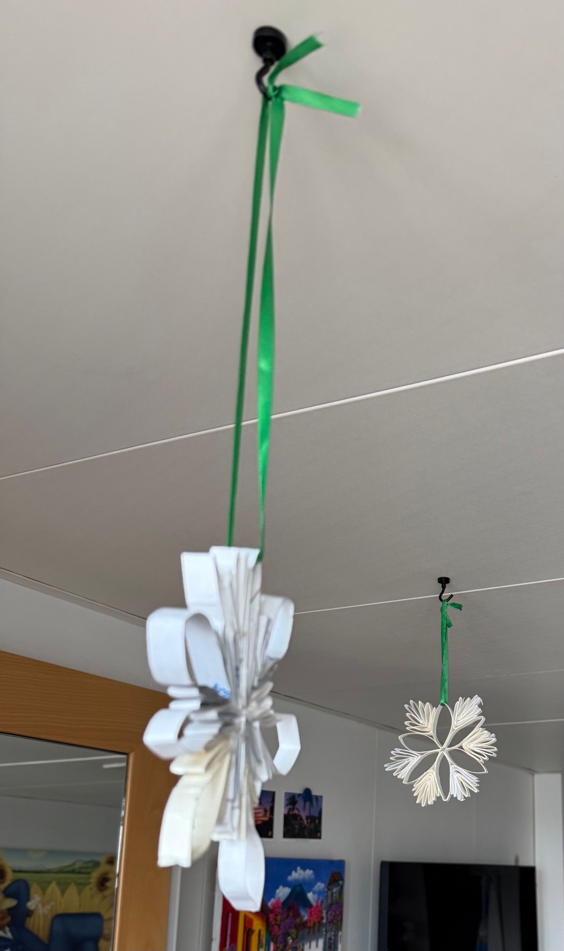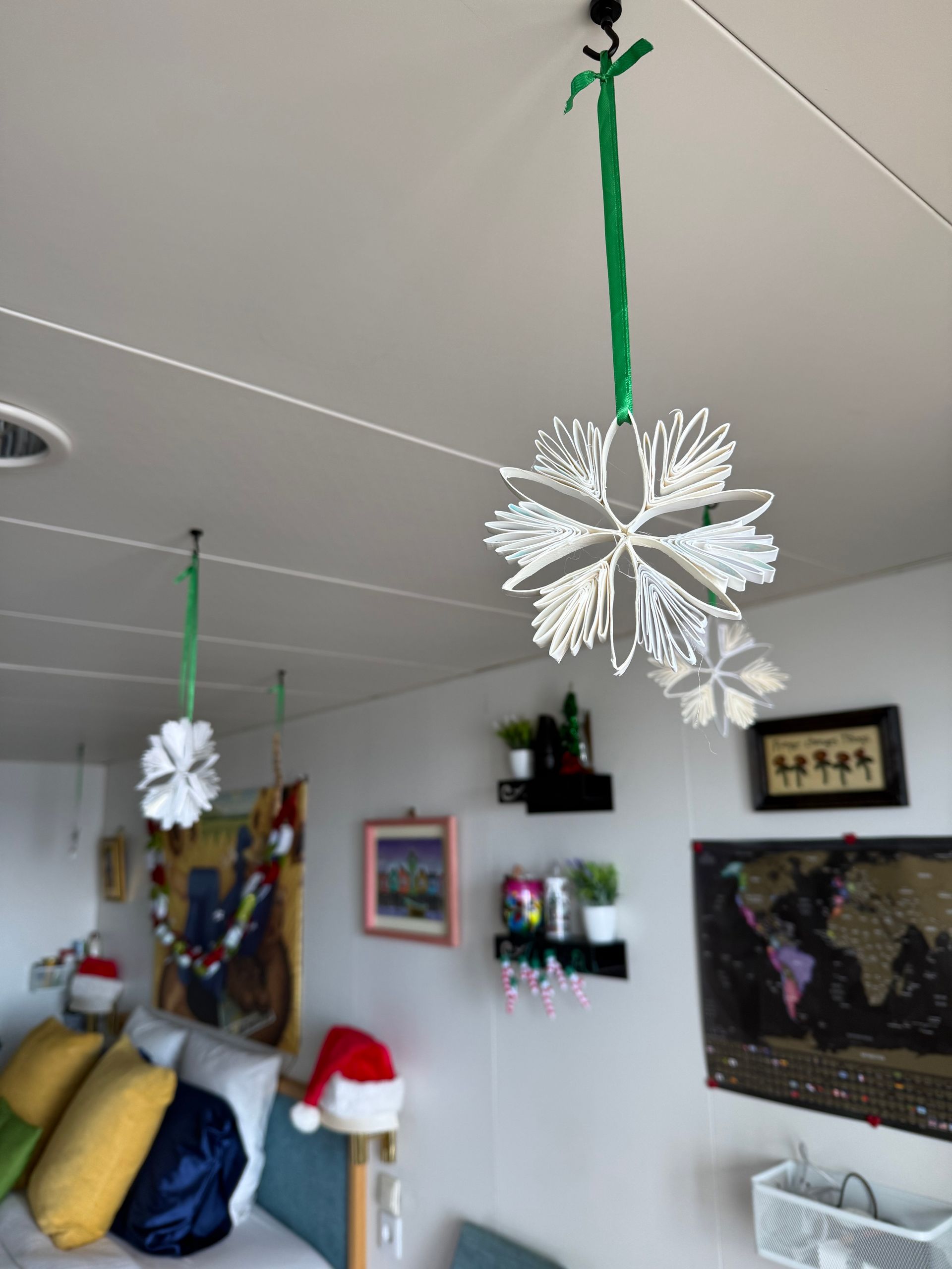 Who doesn't love a good Holiday Craft ?!? This year I made some shell art, courteous of great clam shells in Las Pas, Mexico and an excellent partner in crime, who helped me smuggle them off an excursion ( THANKS Doc!). I also collected toilet paper rolls for weeks and made these cool snow flakes to make my room a winter wonderland! Was going to paint them, but liked better au natural!