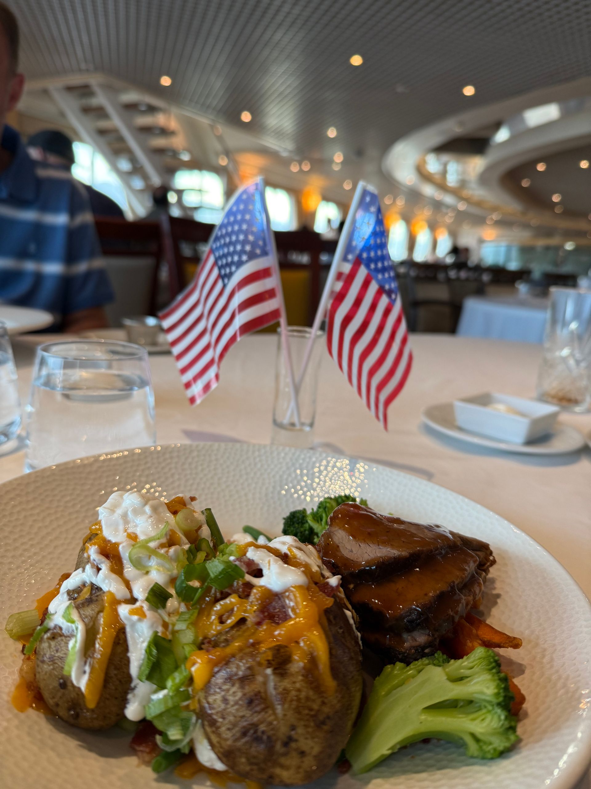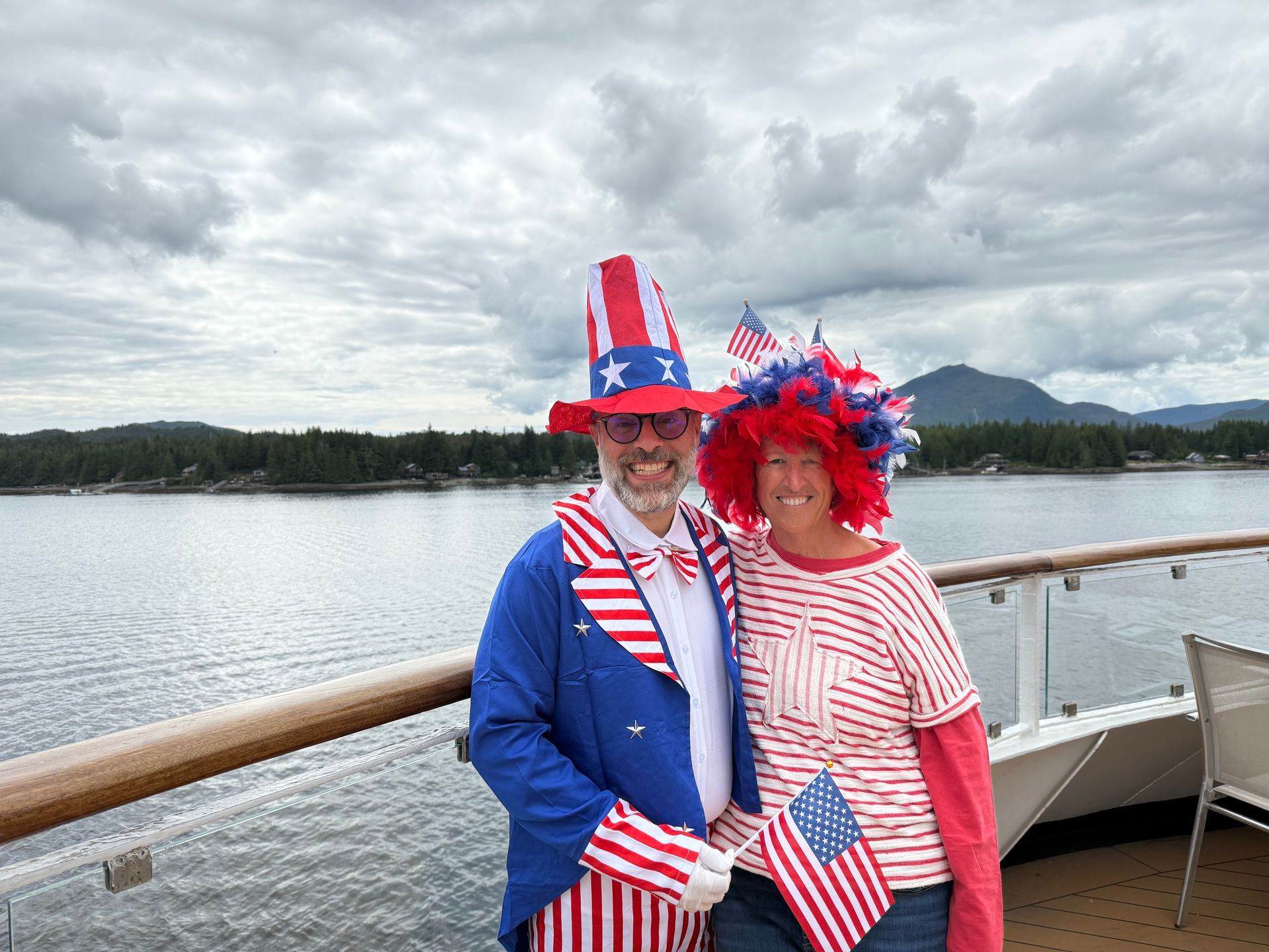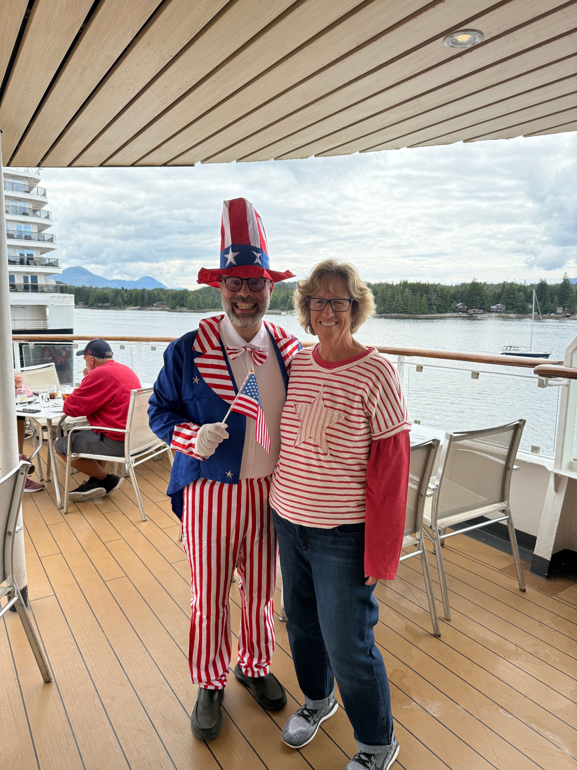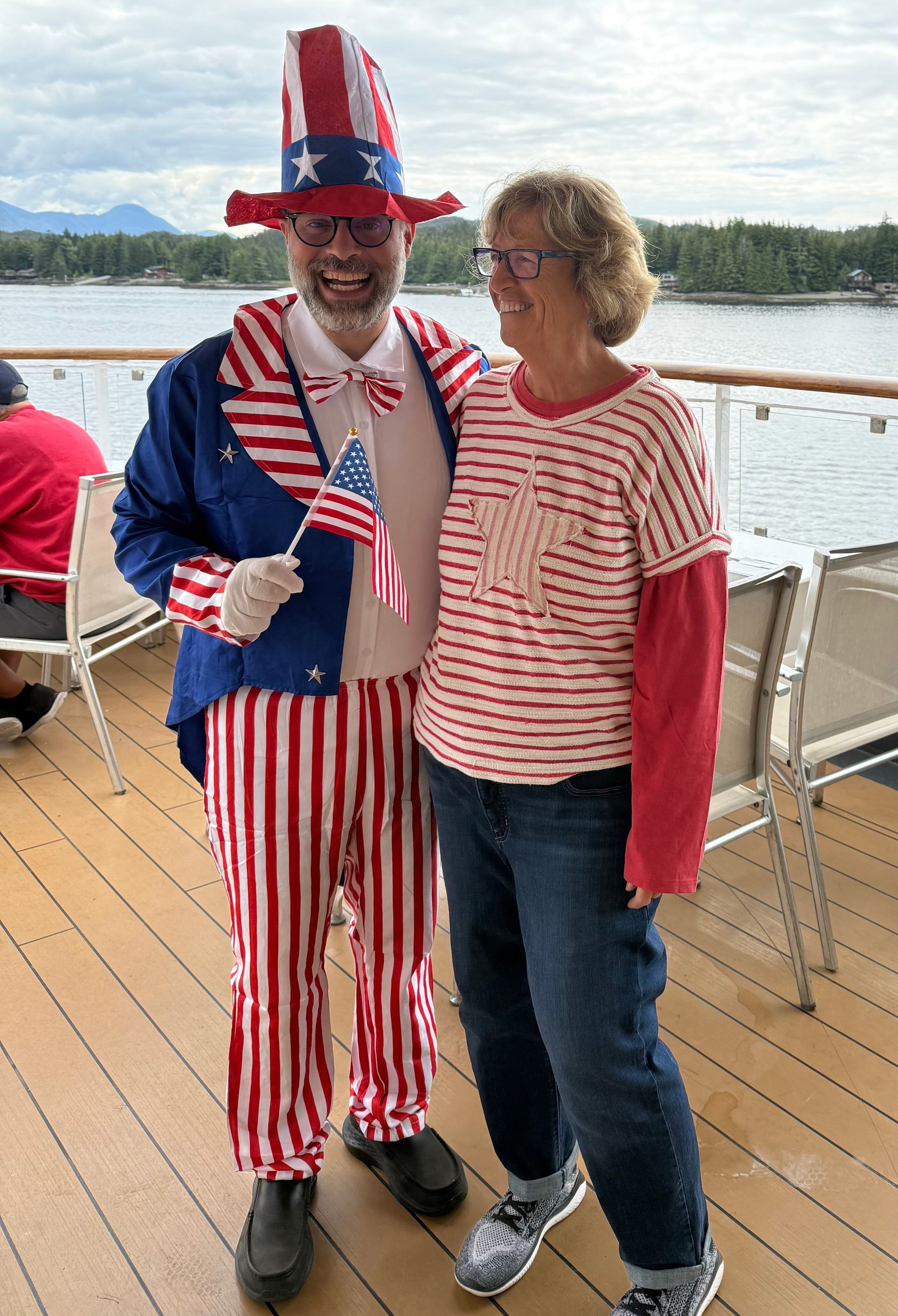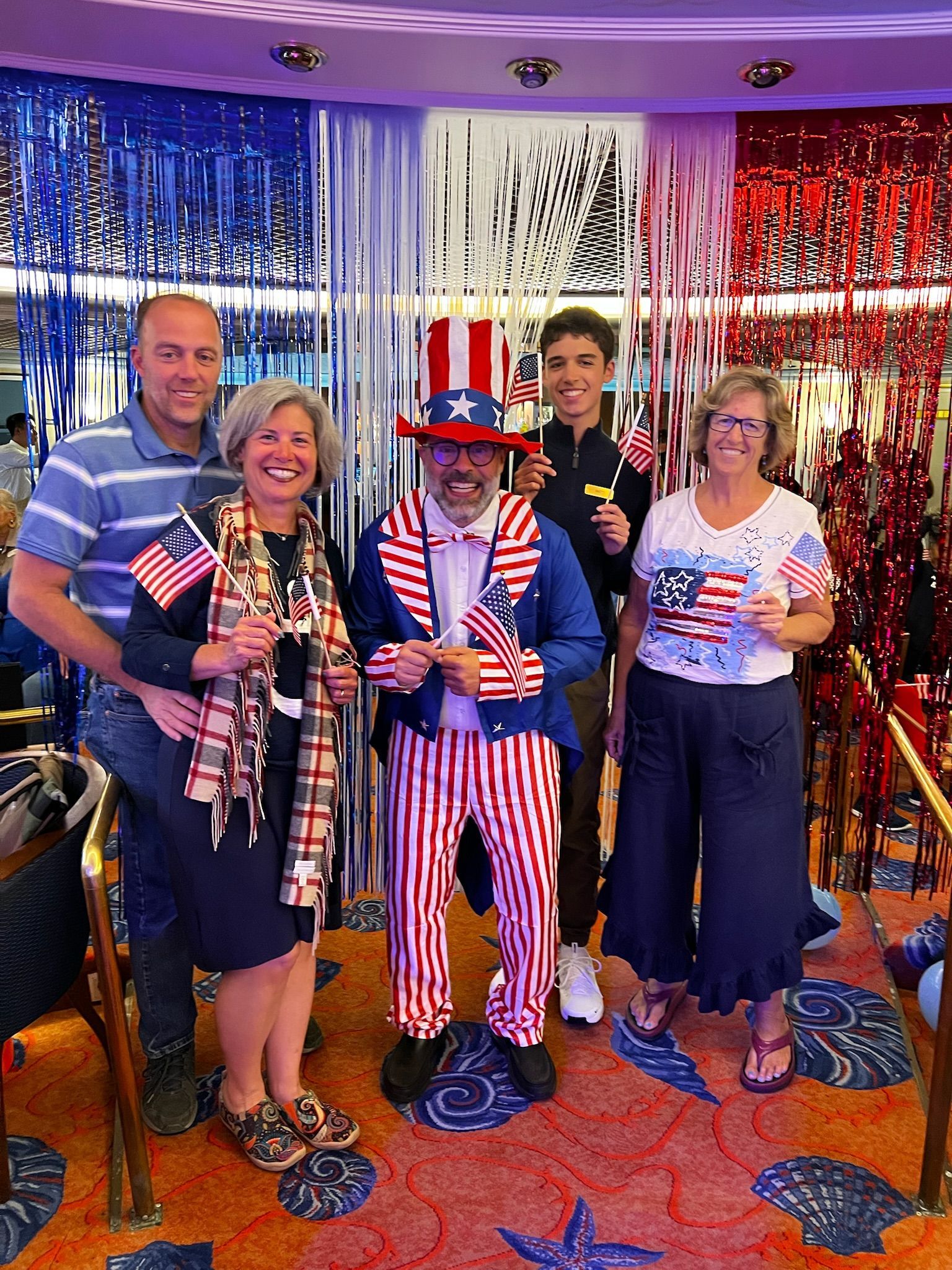 We had lunch on the ship and then went to my balcony to watch the parade go by. It started with a helicopter flying in a large American Flag. There were about 10 floats with the bulk graduating high school classes, 1985 my favorite with fun t-shirts and a porta potty right on the front of their float - very practical1! We ran into Uncle Sam aka Bosco at Lunch.