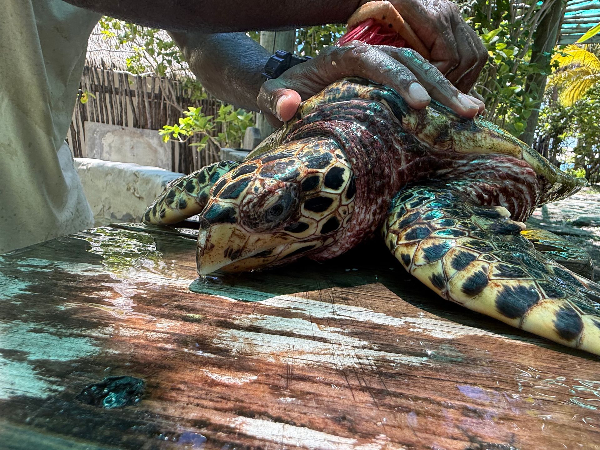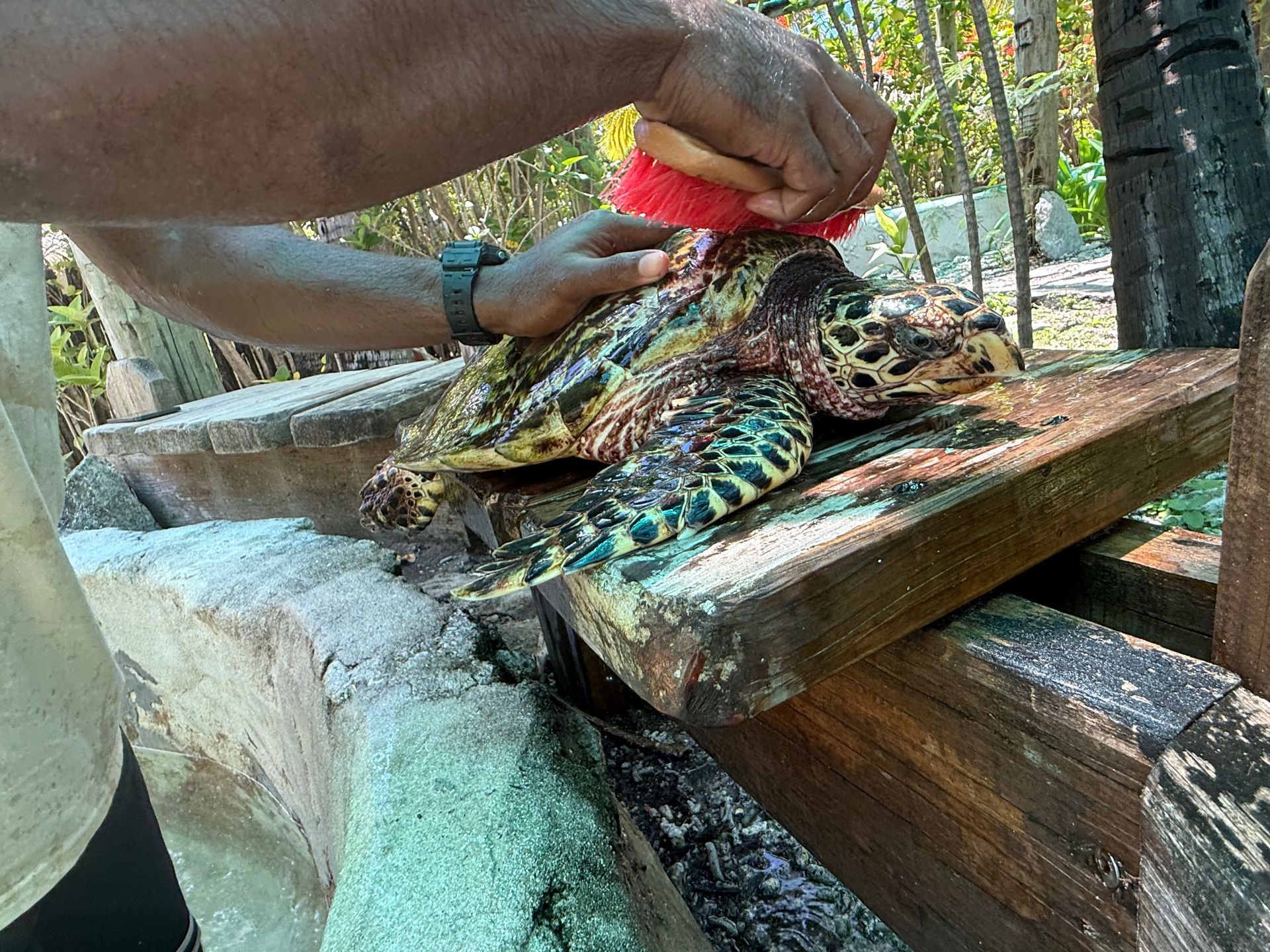 These turtles are endangered so resort keeps them safe in their tanks. We watched guide scrub algae off them and got to touch and feel them. These large Turtles were 6 to 8 years old and their shells are still not completely hard - takes over 10 years.