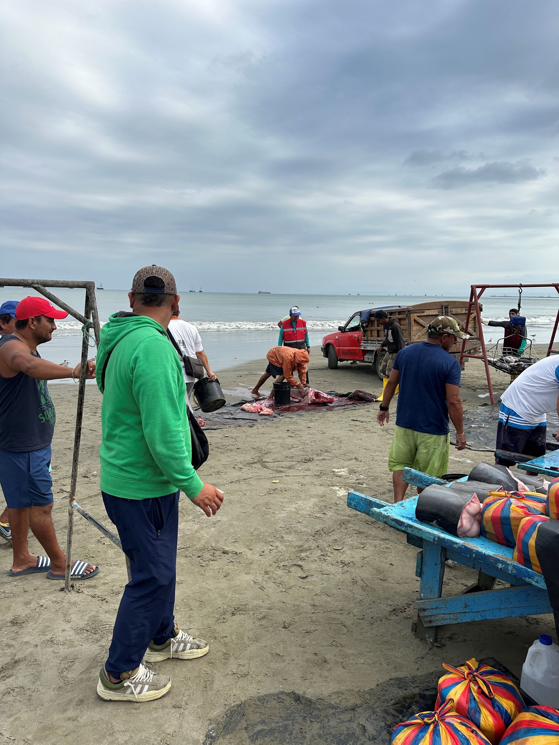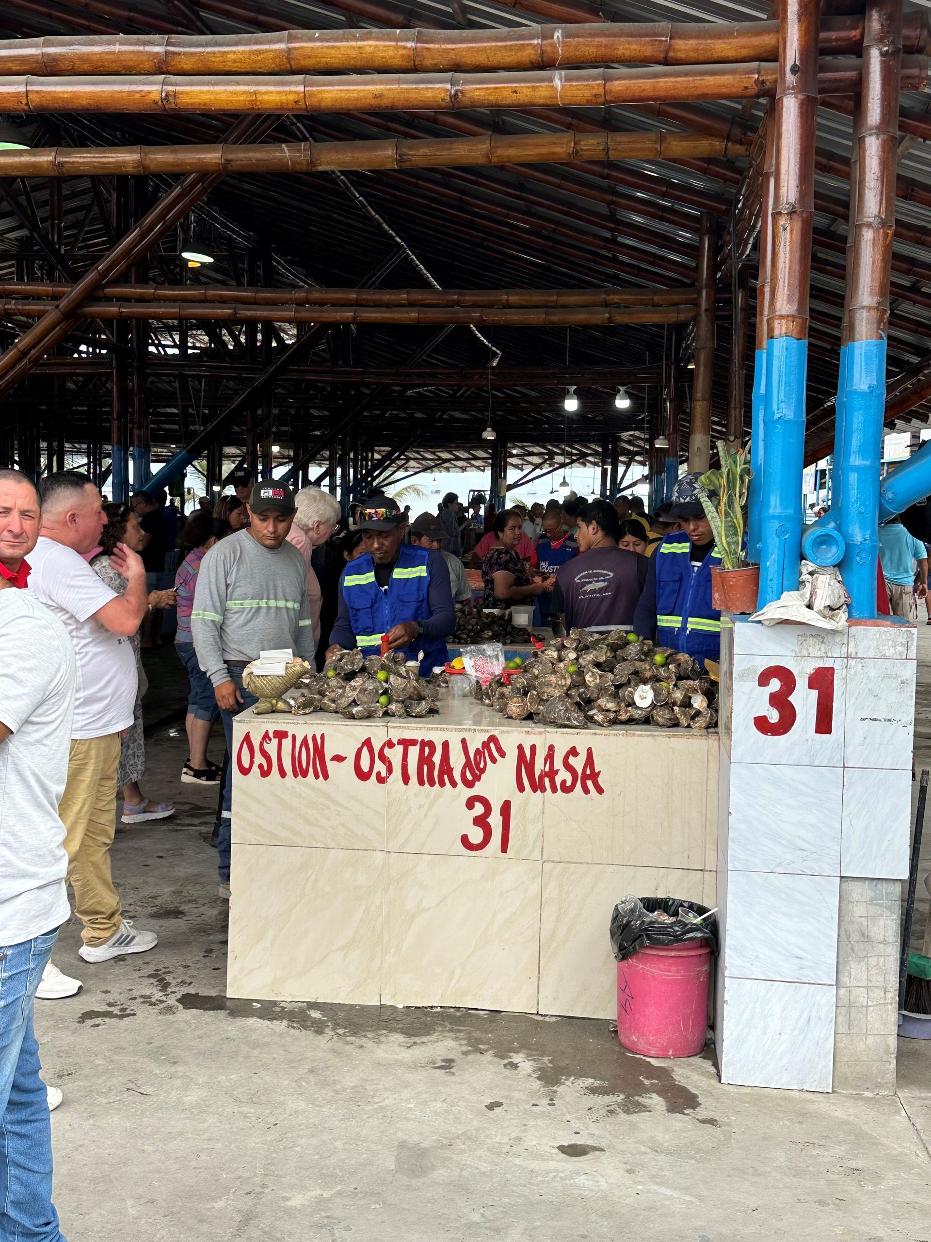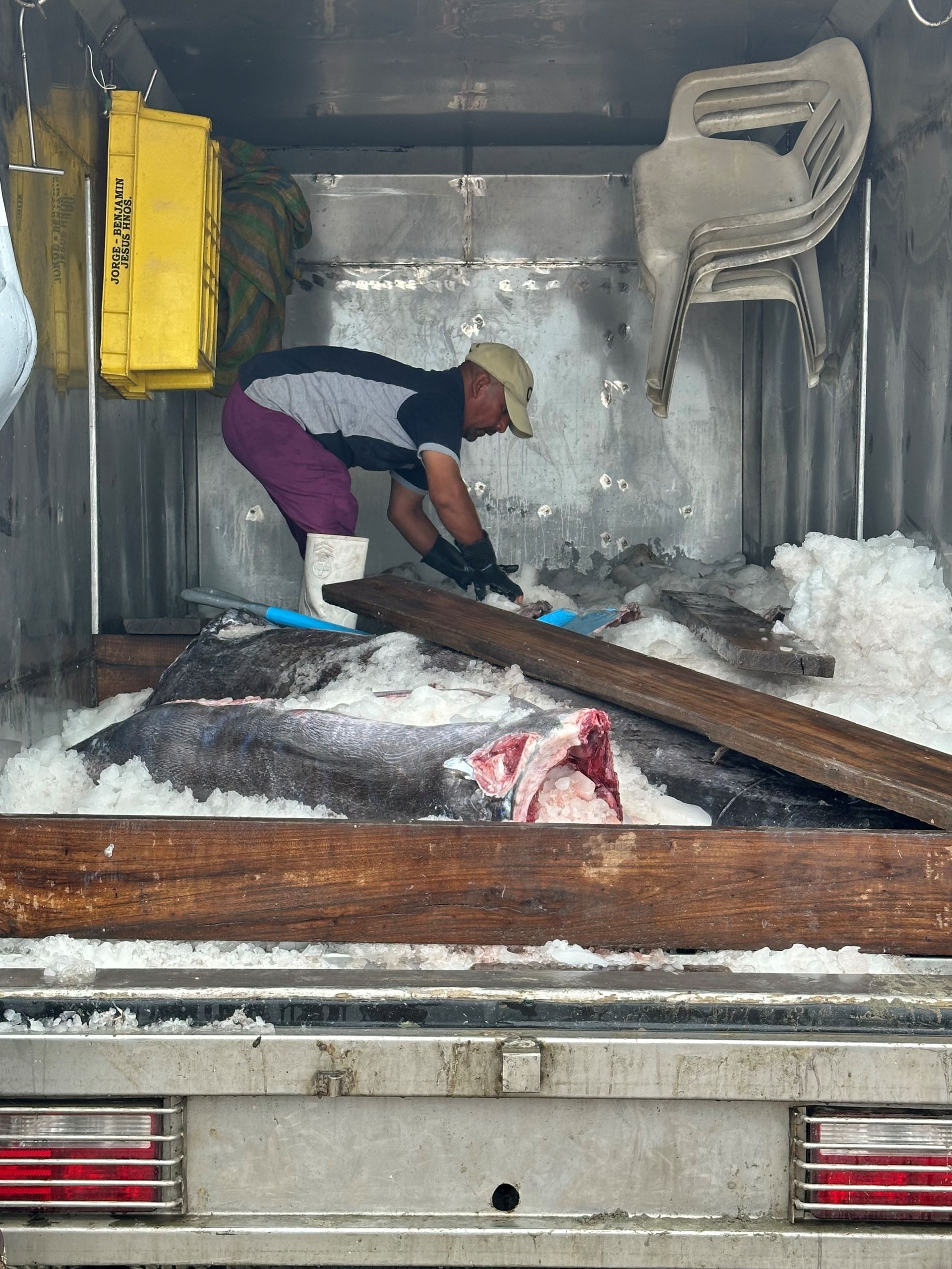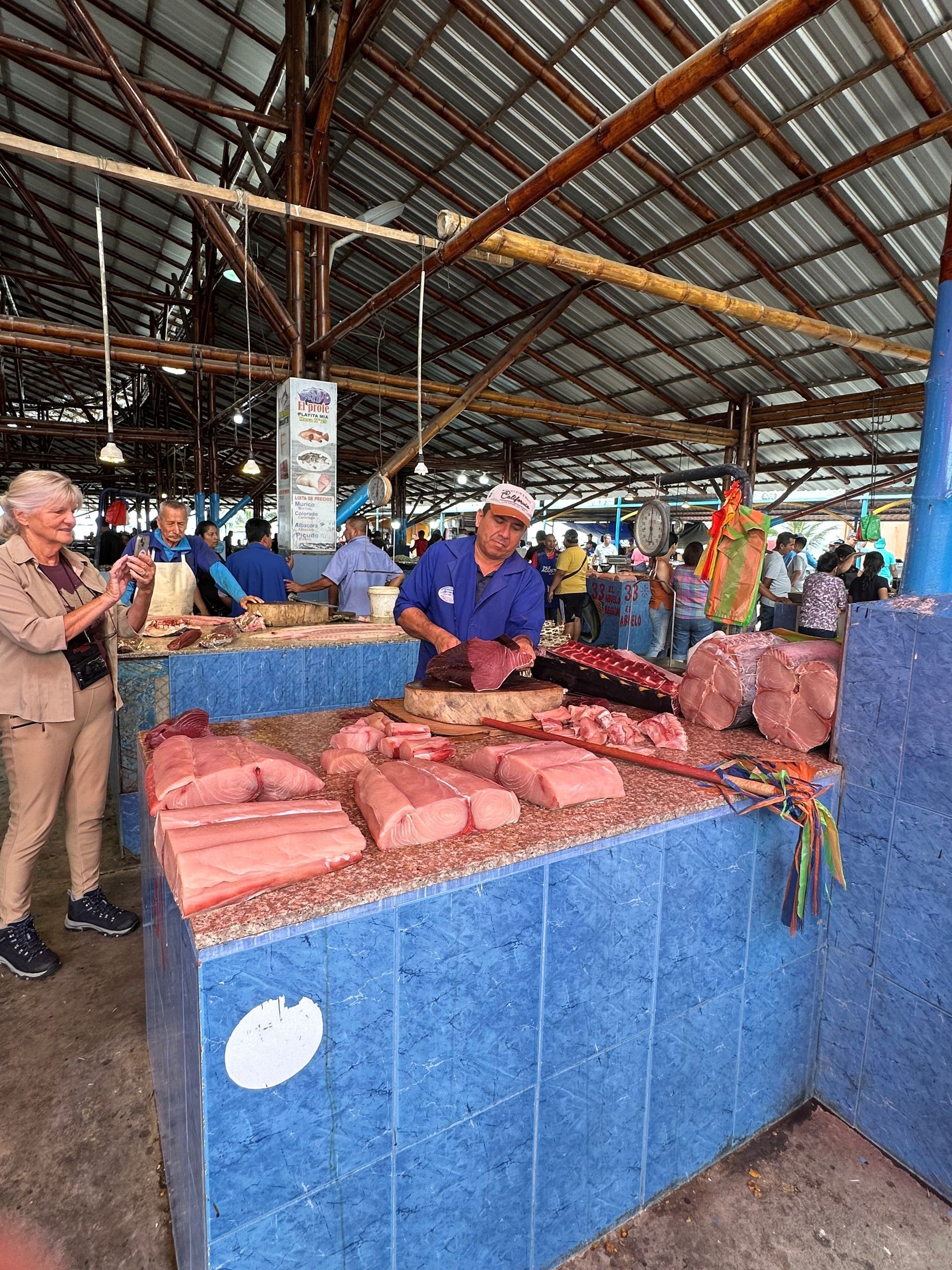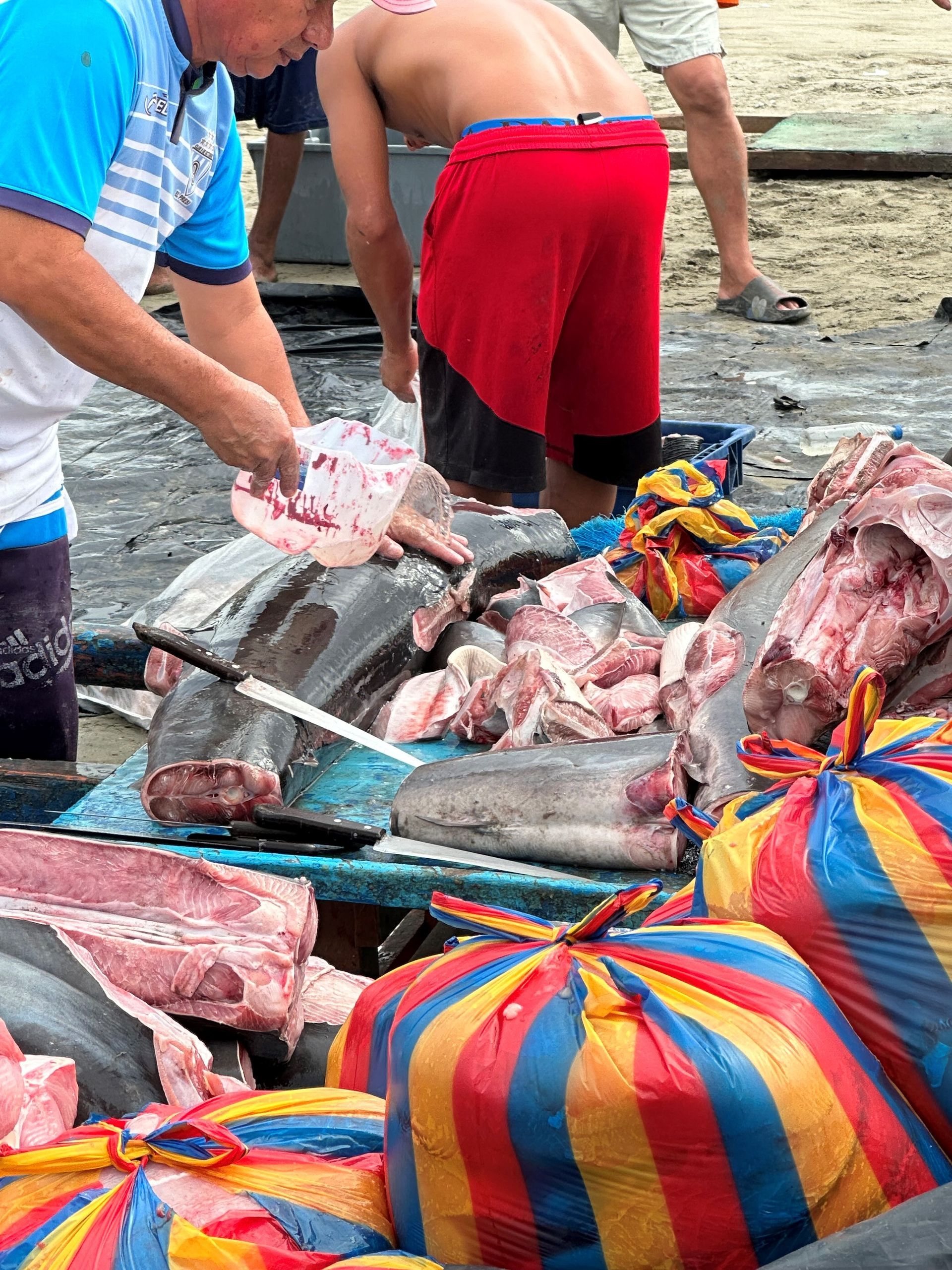 Today we had 2 busloads of residents doing this tour, very popular. The first stop for us was the Manta Port Fish Market. Fisherman had just brought in their catches of the day - mainly tuna and sadly sharks caught in process of tuna haul. This area is the TUNA capital of the world and there is a cannery right in town. Ironically the local people don't like to eat tuna, they view it as an inferior fish because of it's dark color, they pay more for white flaky fishes, brought in from other regions. I was itching for some amazing sushi grade tuna!