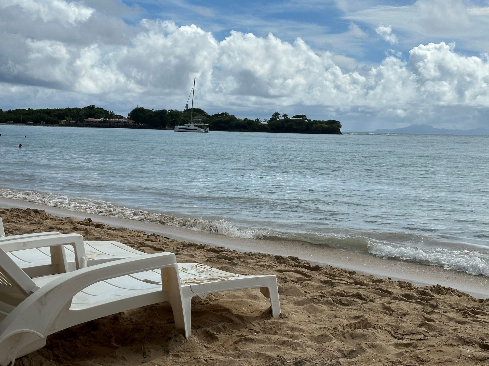 View of harbor and Cathedral from the SHIP. We were docked at capital city, Fort de France and rented a car from nearby Airport to explore the island. The nicest beach was stated to be at far southern end of island called Pointe des Salines, from which you can see St Lucia. Drive took a little over an hour - windy roads with not much to see on the island interior - 3 McDonalds, 1 Burger King, 2 Carrefours, etc., a lot of albino cows / steer and alot of cars on the road. Southern end of island has much fancier resort type homes. A lot of French families at beach, was topless and had good number of vendors for clothing and food. We relaxed here for couple of hours. Sand was super soft and could walk right into water. The water was not as clear as St Lucia, a lot of sea grass floating in water.