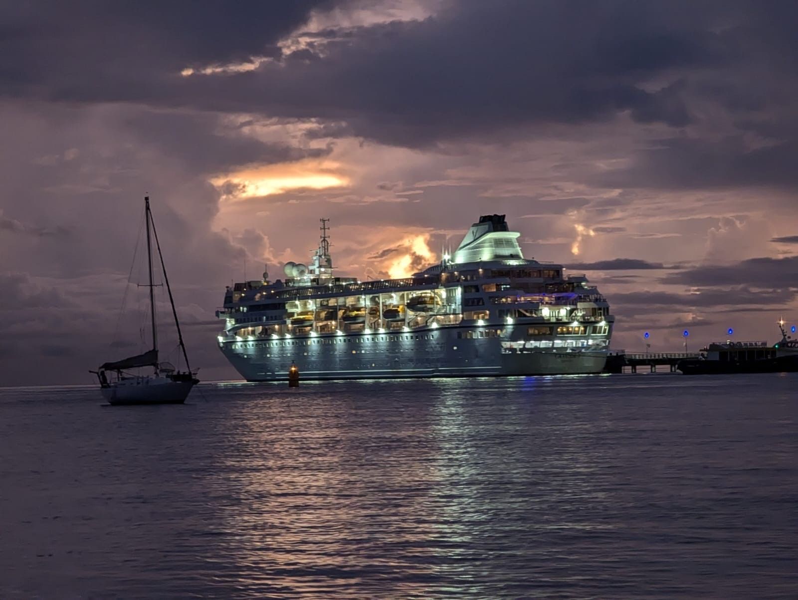 Last ferry had already stopped at by 5pm, and we had another hour plus drive back to airport, then a car rental shuttle to airport grounds to a taxicab cue and then finally a ride back to Ship. We got back to port after dark, got quick showers and made dinner by a little after 7pm! Lovely day and evening, Ship looked so nice in harbor & there was a nice breeze too. Ahhhh!
