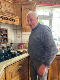 performing one of his favorite retirement duties - heating up feed for the cats; Anne