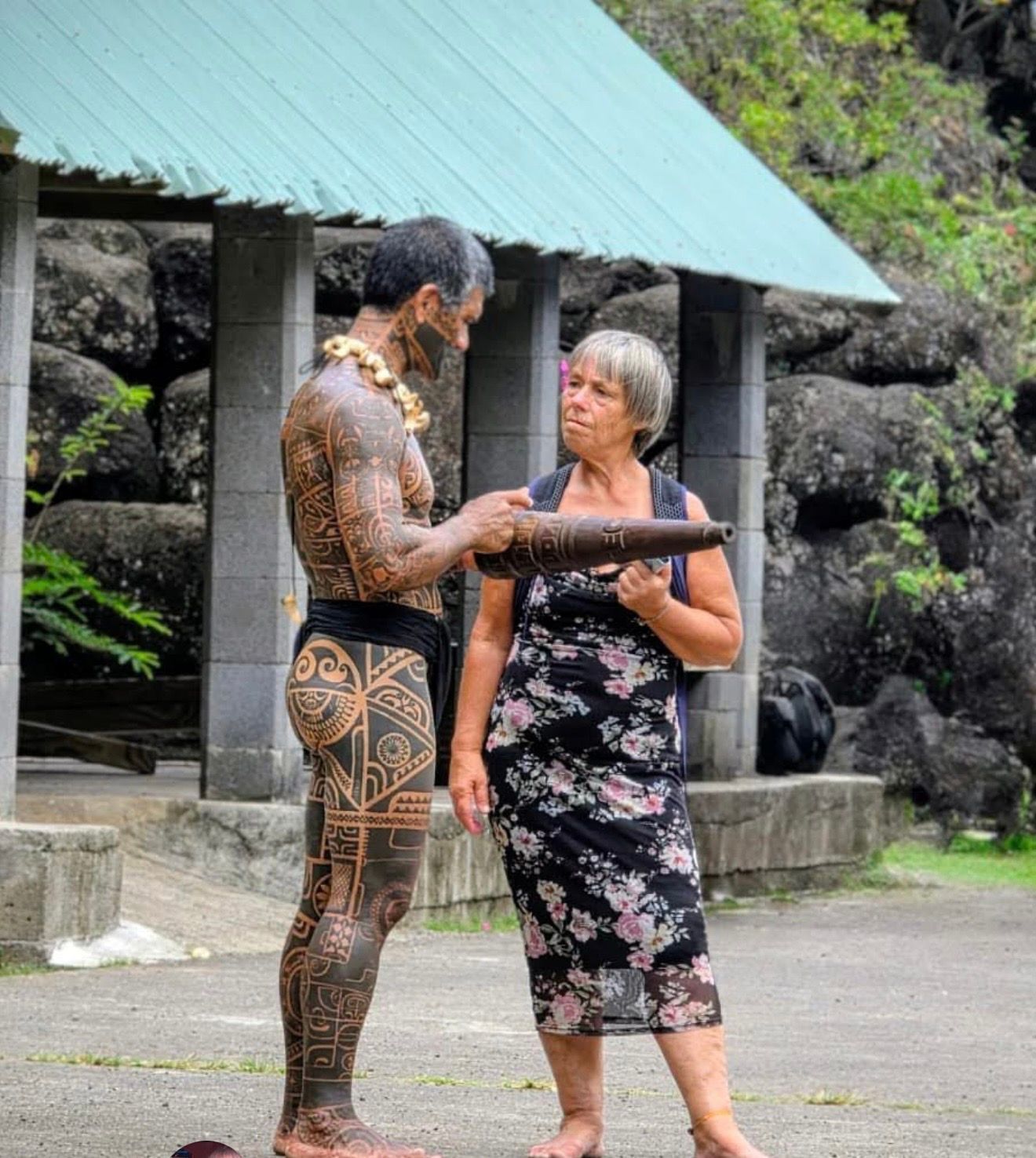 Tahuata Chief and Viv ( one of our New Zealand Residents) discussing language similarities, after his greeting with horn.