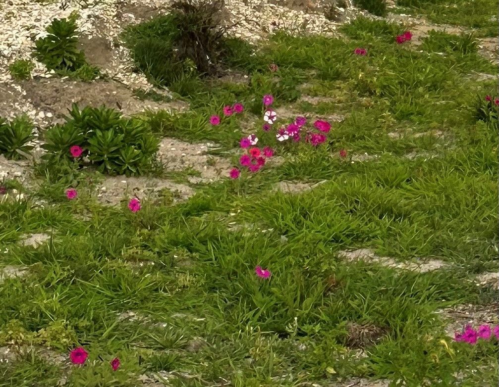 On Thursday night after dinner, Bonnie and I went for a walk down to my old neighborhood. As we came up to the block, a huge rainbow lit up the sky and when we walked to my old house lot - I saw pansy flowers randomly popping up all among the plowed lot!