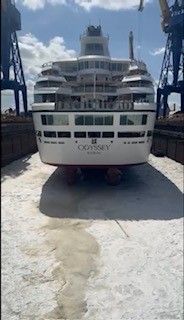 Finally the new rudder stocks have been approved by DNV and both rudder assemblies reinstalled. I was so excited Tuesday to get the video of the dry dock finally filling up with sea water! On Wednesday saw they were floating and reloading the life boats. The next hurdle is passing all the agency inspections and testing, now that we are finally floating. DNV has signed off on 2 generators and 2 more need to get reviewed over weekend. Then they have to do critical test for Transitional Power. Everything needs to go off and switch over perfectly to pass! Anything that goes amiss, will have to tweak to get perfect. PSSC and MCA are the agencies for all the technical testing. From the Hotel perspective we are all good to go. The PNI Insurance Policy has been approved and to be in place for 7/31, allowing embarkation of residents. YAHOO! We got these updates this afternoon and Sunday we are to going to get more insights. Based on today's zoom call, I changed my Aer Lingus return flight to Dublin, from Sunday night to Tuesday night arriving on 7/31. I have learned to always buy fully refundable, no change fee tickets!