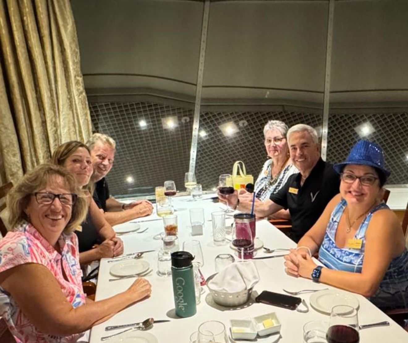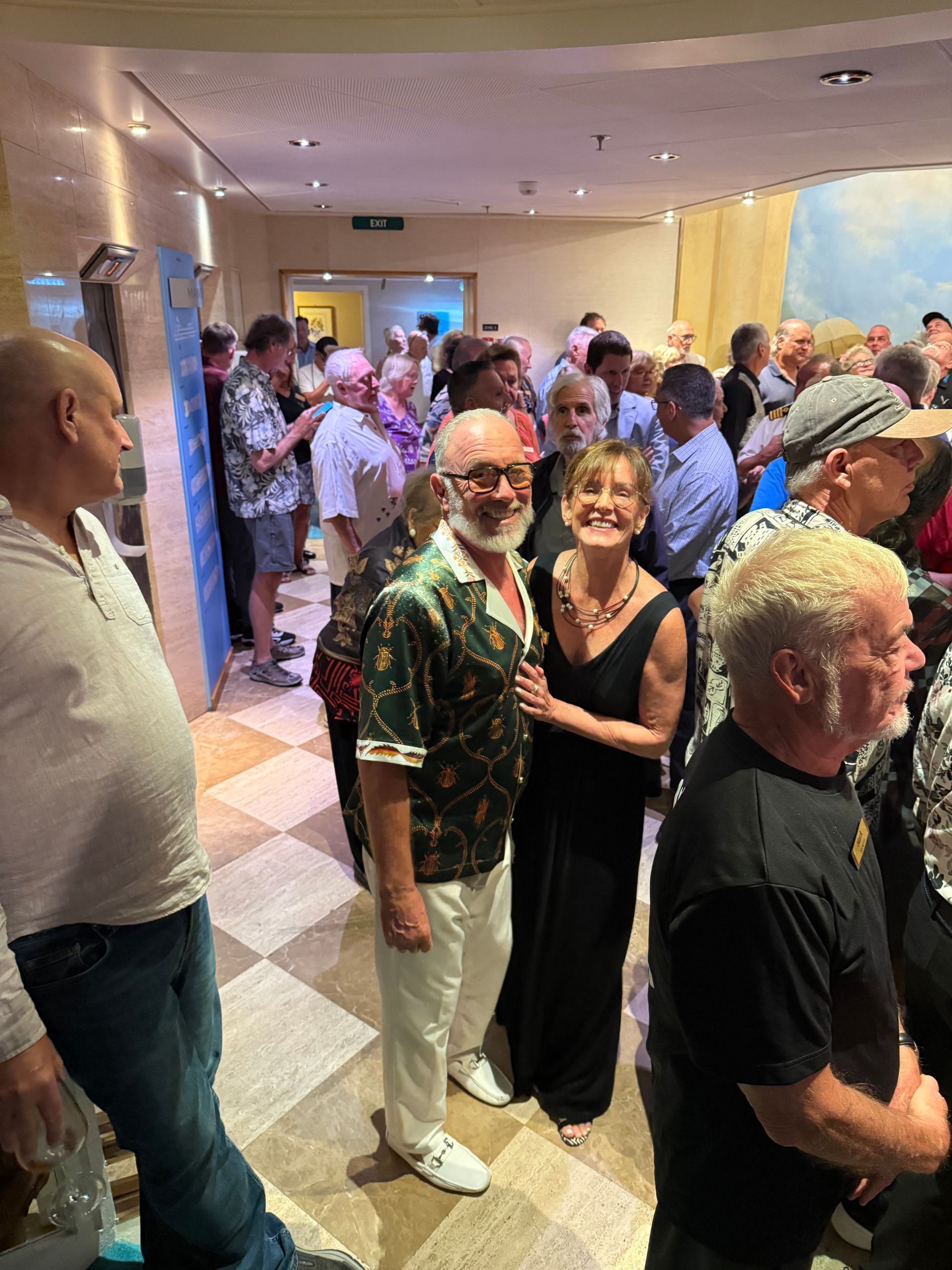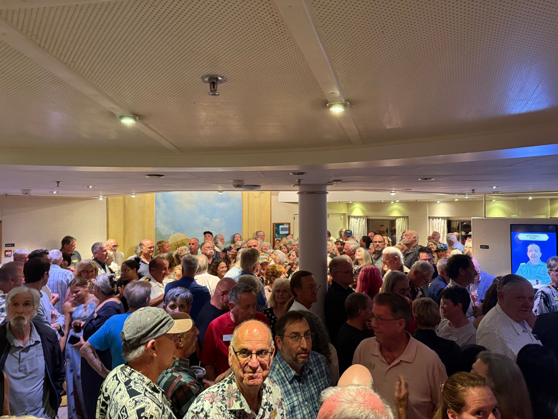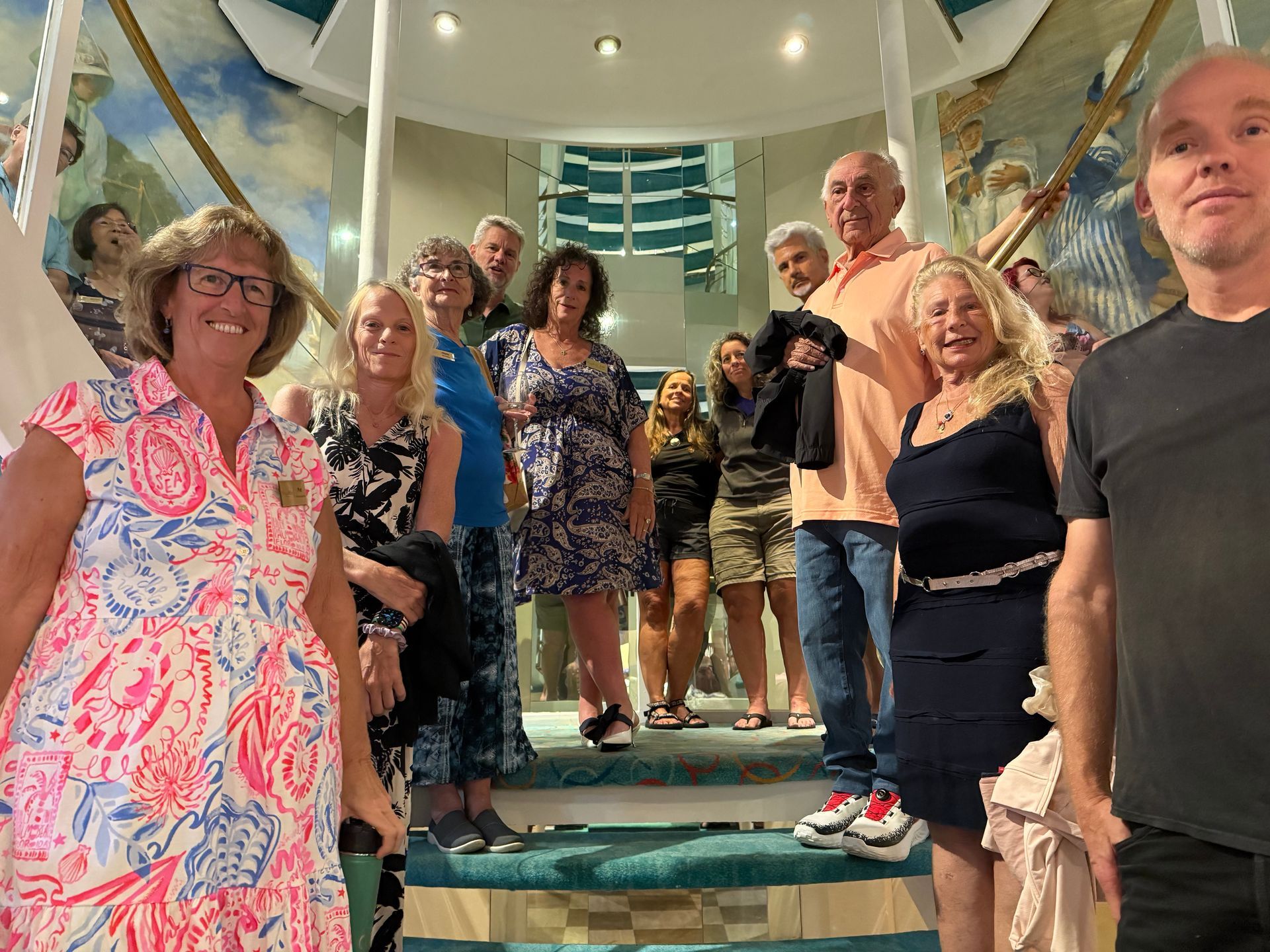 There were a lot of festivities on Board the ship, on this Sea Day. They started at 10 am with a trivia contest with our COO Mike & CEO Kathy, on Ship and Resident Facts, over the last year. They were playing against each other and Kathy's memory was by far better and luckier in her guesses, than Mike. Then their was a mural painting and numerous cocktail parties of various groups, all coming together at Dinner time, for one giant seating of 350 Residents in the Thistle Restaurant for a special gala dinner, complete with cake. This was then followed by a fantastic pool party, on the upper deck, with the music again by DJ Shanti. The Residents and CREW all got to party, dance and drink together in a fantastic harmony until Midnight and the party even continued much later for some into the wee hours of morning! It was a FUN day with a great group of people, I so wish you could all experience!