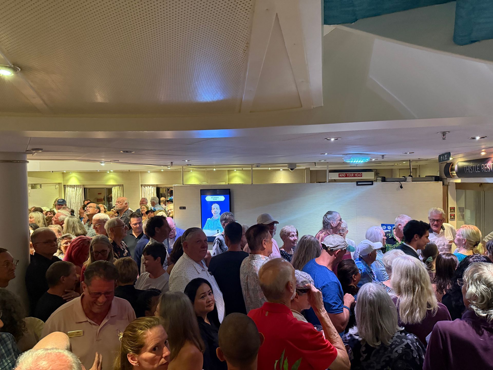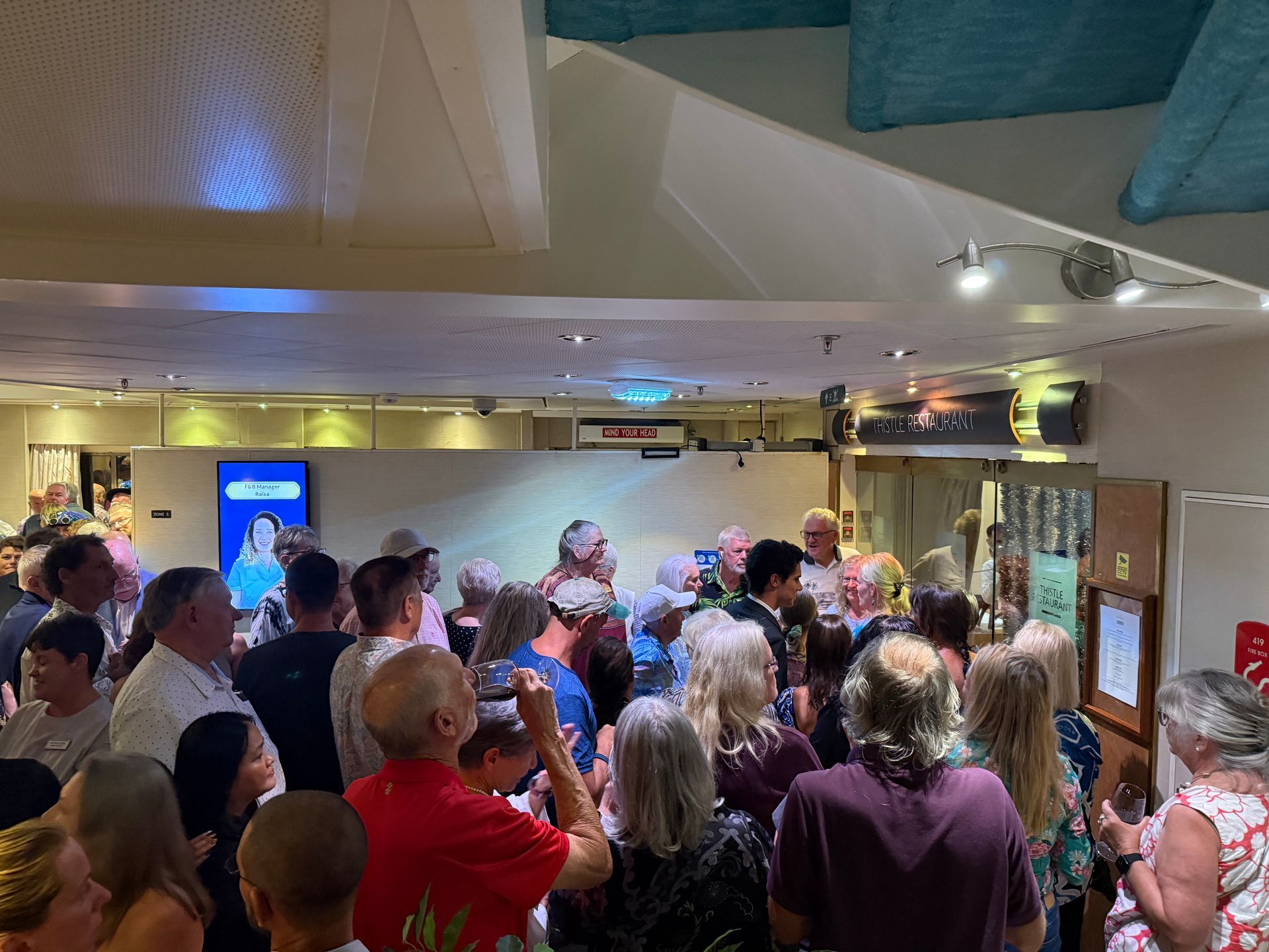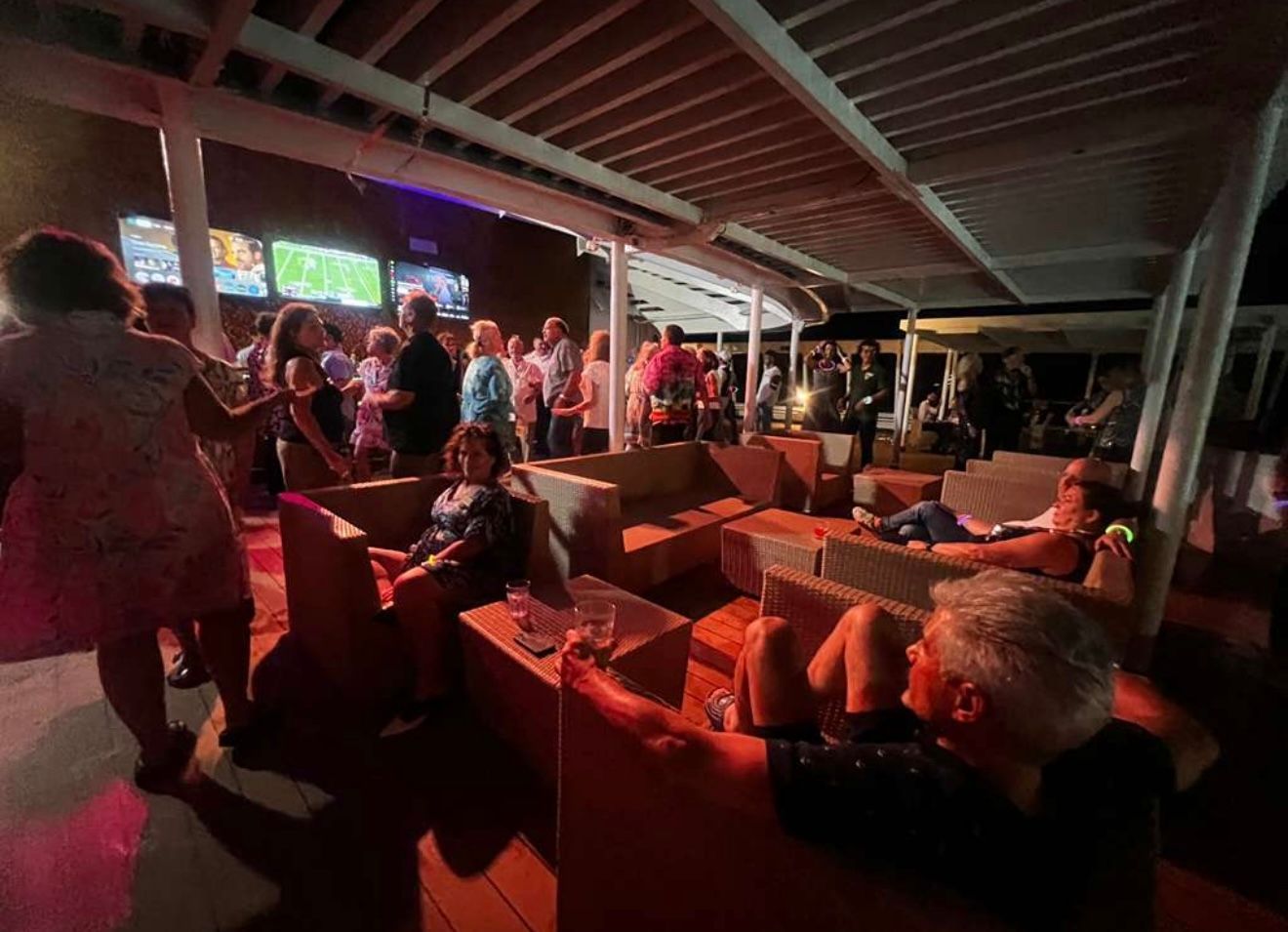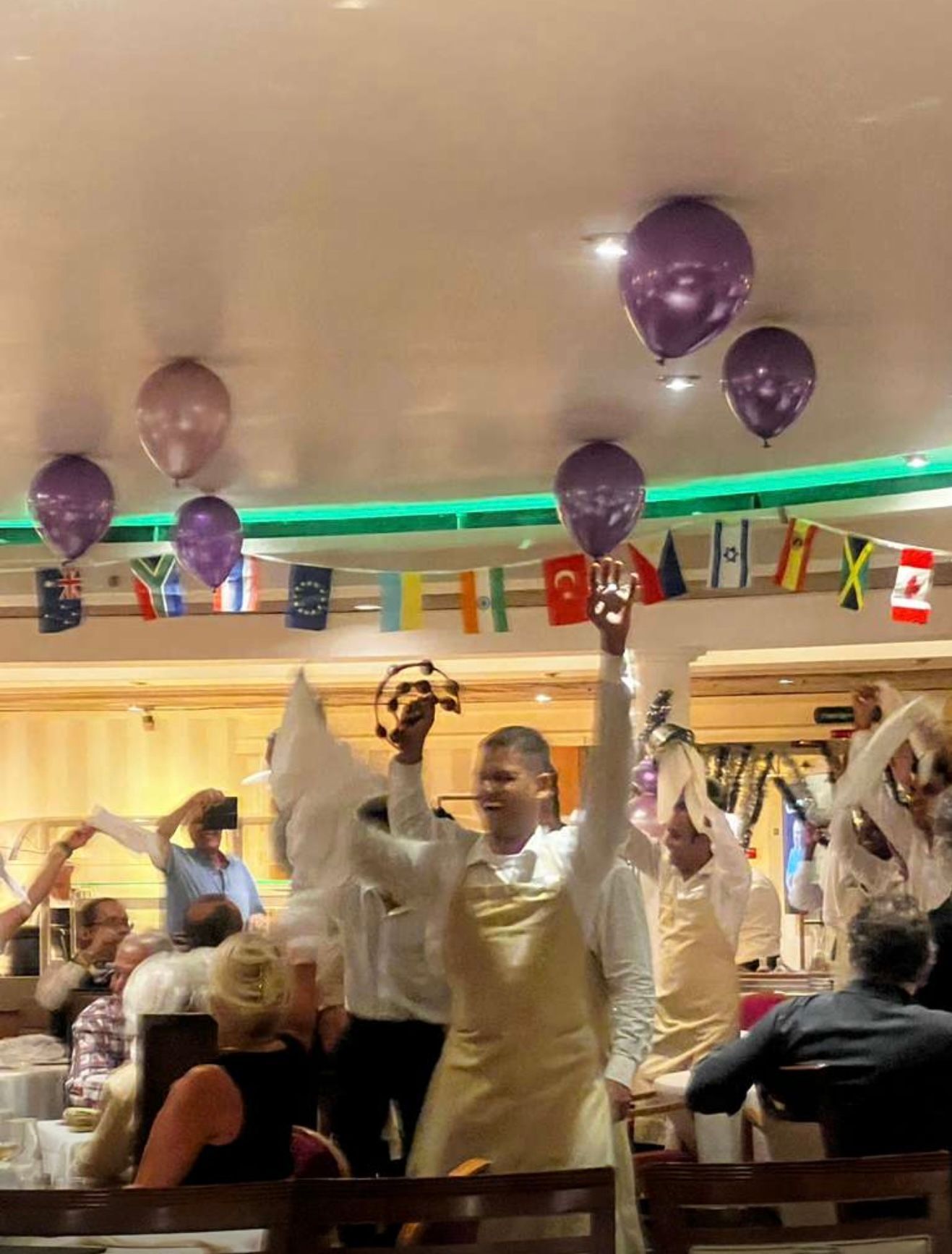 There were a lot of festivities on Board the ship, on this Sea Day. They started at 10 am with a trivia contest with our COO Mike & CEO Kathy, on Ship and Resident Facts, over the last year. They were playing against each other and Kathy's memory was by far better and luckier in her guesses, than Mike. Then their was a mural painting and numerous cocktail parties of various groups, all coming together at Dinner time, for one giant seating of 350 Residents in the Thistle Restaurant for a special gala dinner, complete with cake. This was then followed by a fantastic pool party, on the upper deck, with the music again by DJ Shanti. The Residents and CREW all got to party, dance and drink together in a fantastic harmony until Midnight and the party even continued much later for some into the wee hours of morning! It was a FUN day with a great group of people, I so wish you could all experience!
