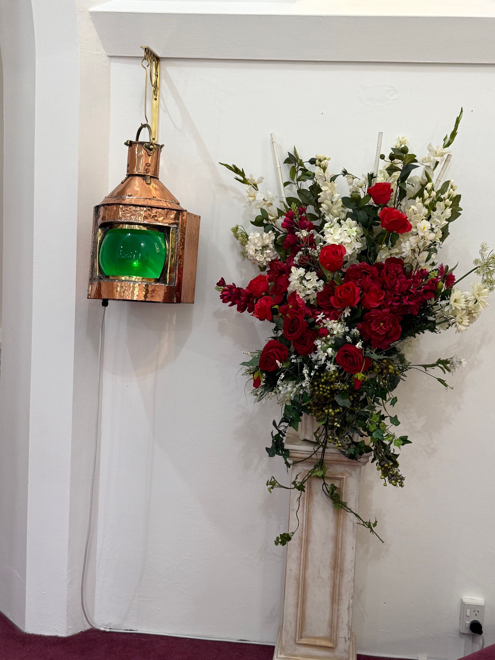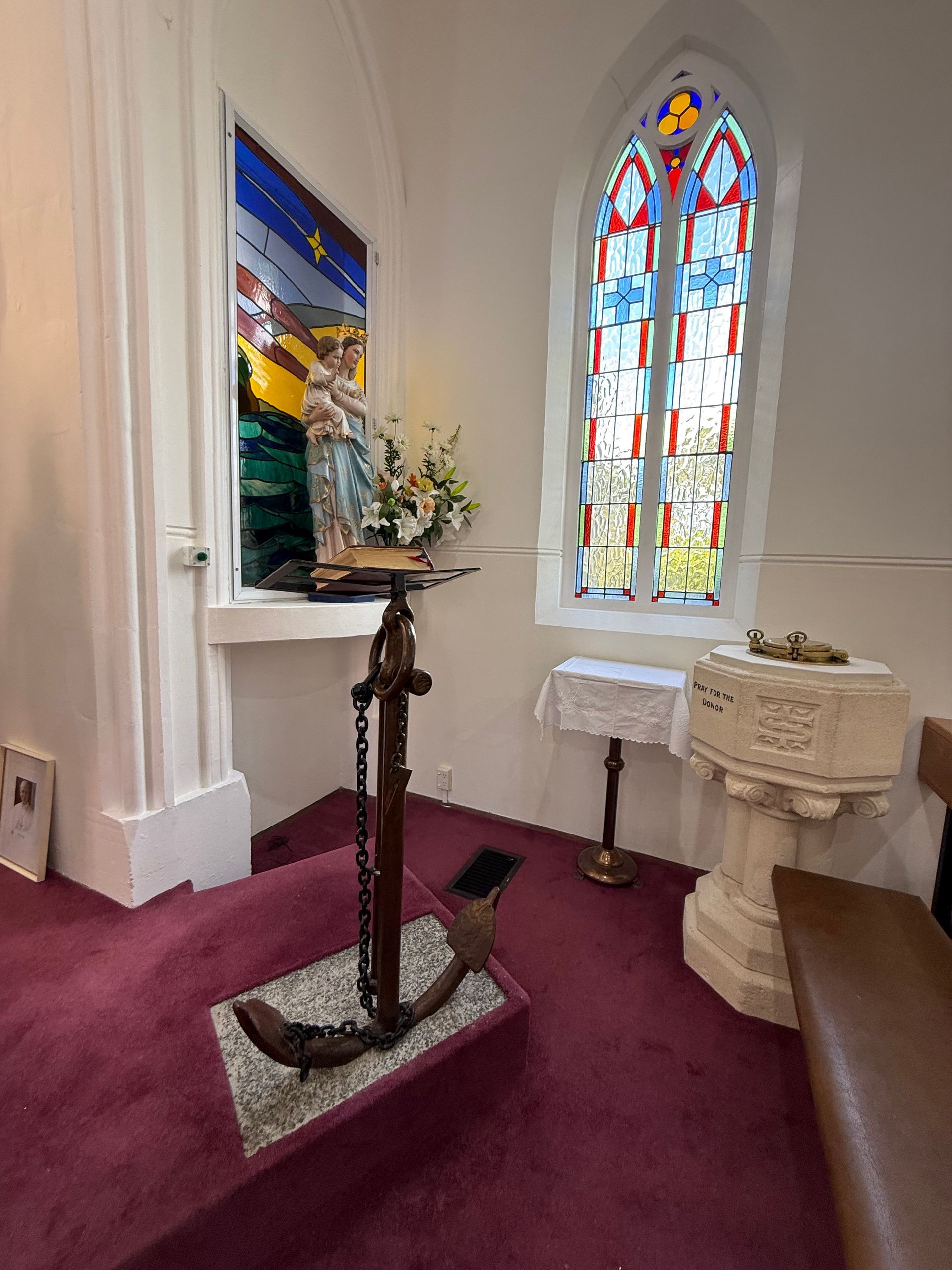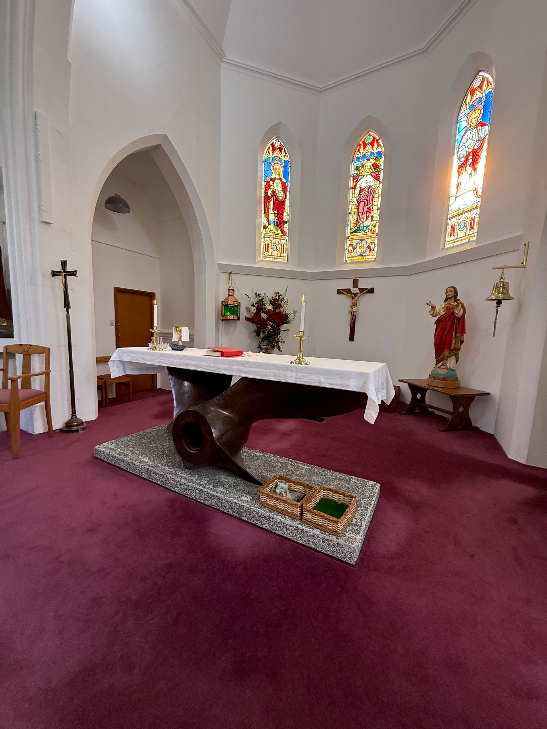 We cleared customs by 4:30 pm and a small group of us, made our way off the ship and into a taxi to make the one and only Catholic mass in town at 5 pm, Saturday night, at St. Mary Star of the Sea. The parish only has 25 to 30 members and the priest travels in once a week from over 40 minutes away. The church has just been freshly renovated, we could still smell fresh paint. The interior decor is all taken from a shipwreck that happened in the harbor of the S.S. Tyrone ( previously named Drayton Grange) in 1913. The altar uses the propeller, the baptismal fount, a port hole and I loved the copper lights! The whole decor is so tasteful and endearing and the people could not have been kinder or more welcoming. It was a real treat to get such a warm welcome. The head of renovations, Mary, gave us a tour of the property, after Mass and shared the history of the shipwreck and story of Sister Mary, who came there years ago, for missionary work and started the parish. The communion dish was beautiful Paua shell.