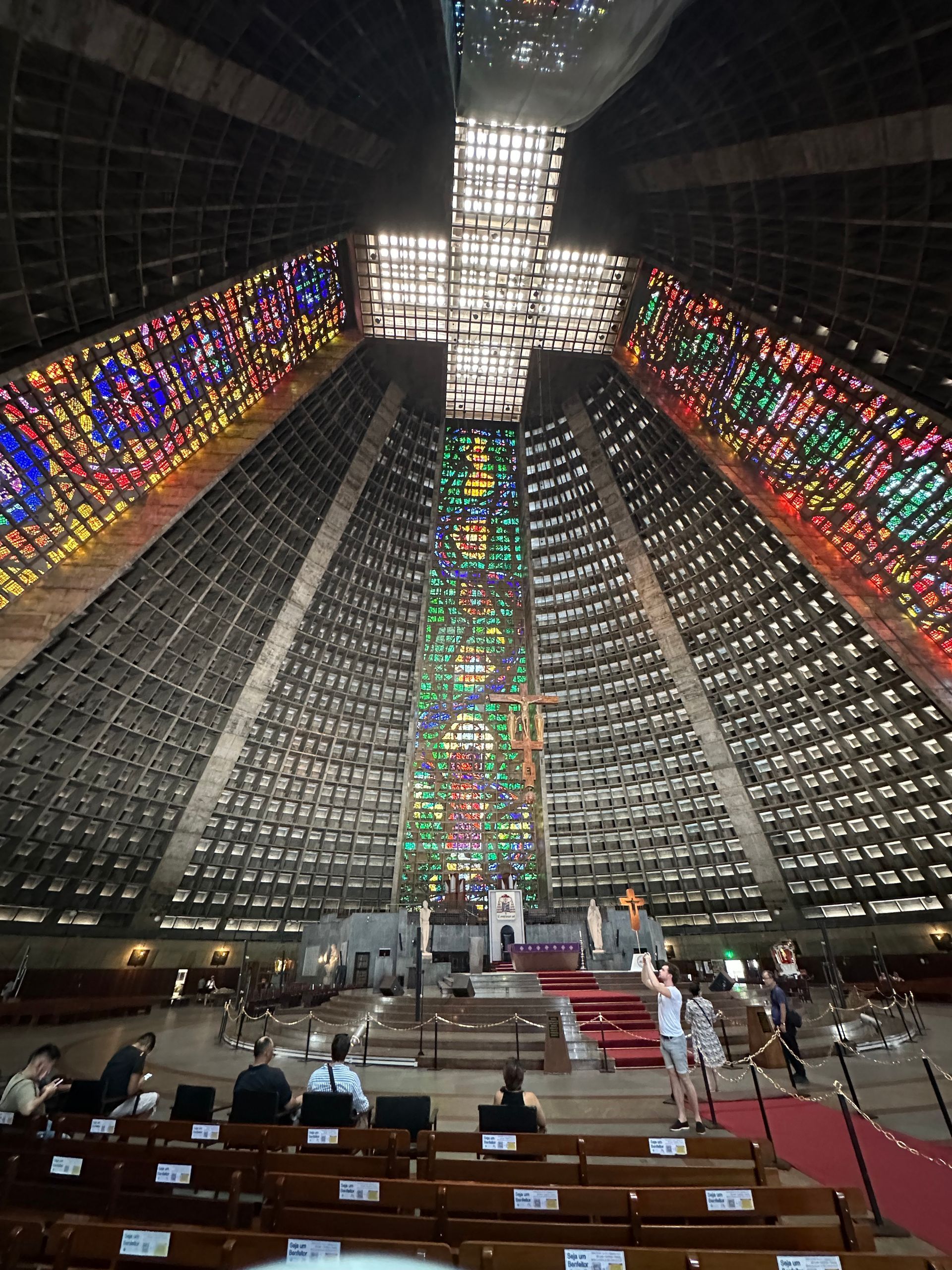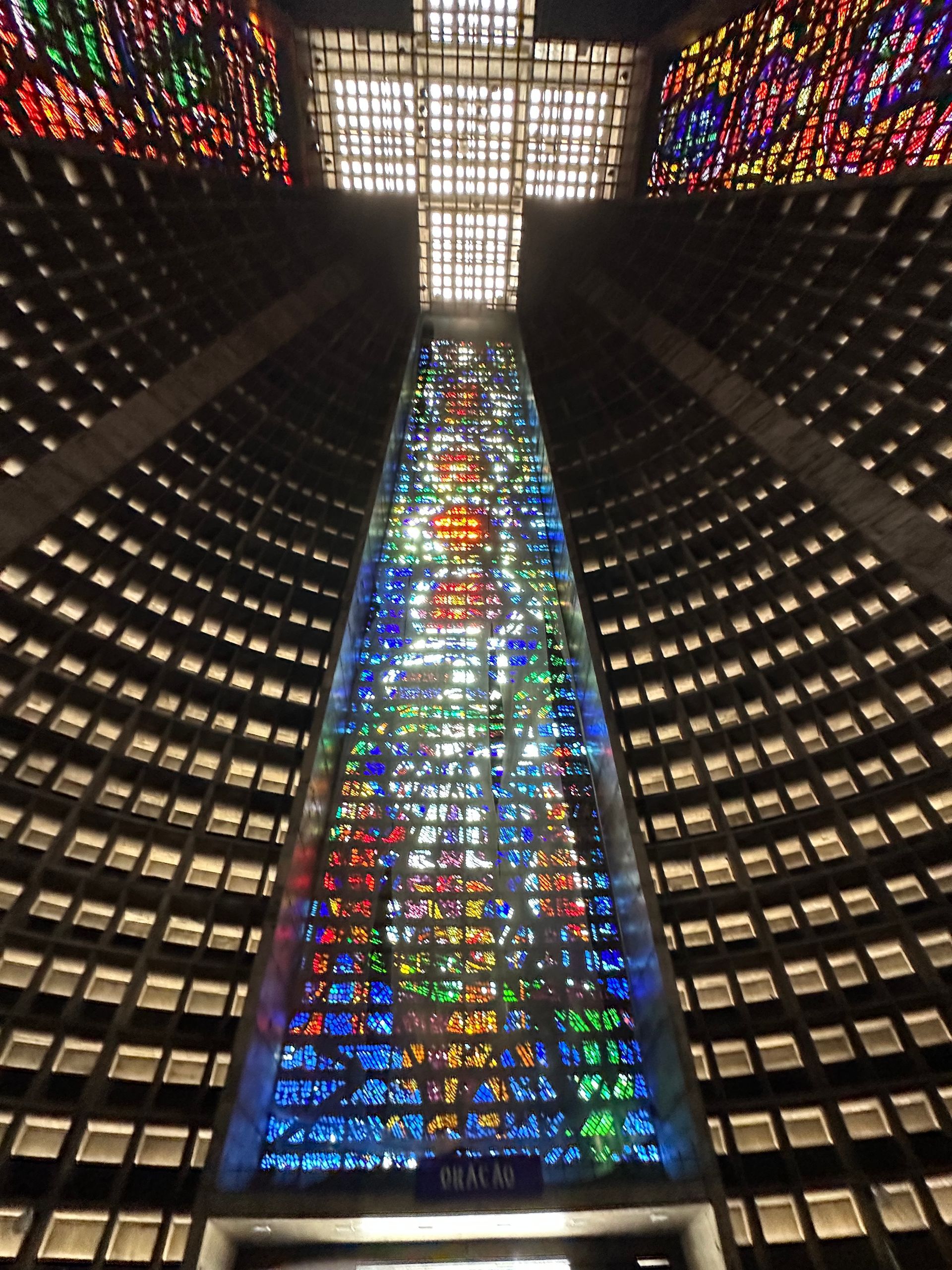 We then went back into the City, as I was trying to find a church giving out ashes at noon, which seemed a popular time for masses, per the web. We went to the City's Metropolitan Cathedral de Sao Sebastiao but alas, it was quiet. Saint Sebastian is the patron saint of Rio de Janeiro and this church is the seat of the Rio's Archdiocese. It was perfect to add to our tour of unique architecture. The outside of building resembles a mayan temple or pyramid. It's considered Modernist architecture, and was built from 1964 to 1979 by Architect Edgar Fonseca. While I didn't find it very attractive on the outside, the stain glass inside and hanging crucifix was impressive.
