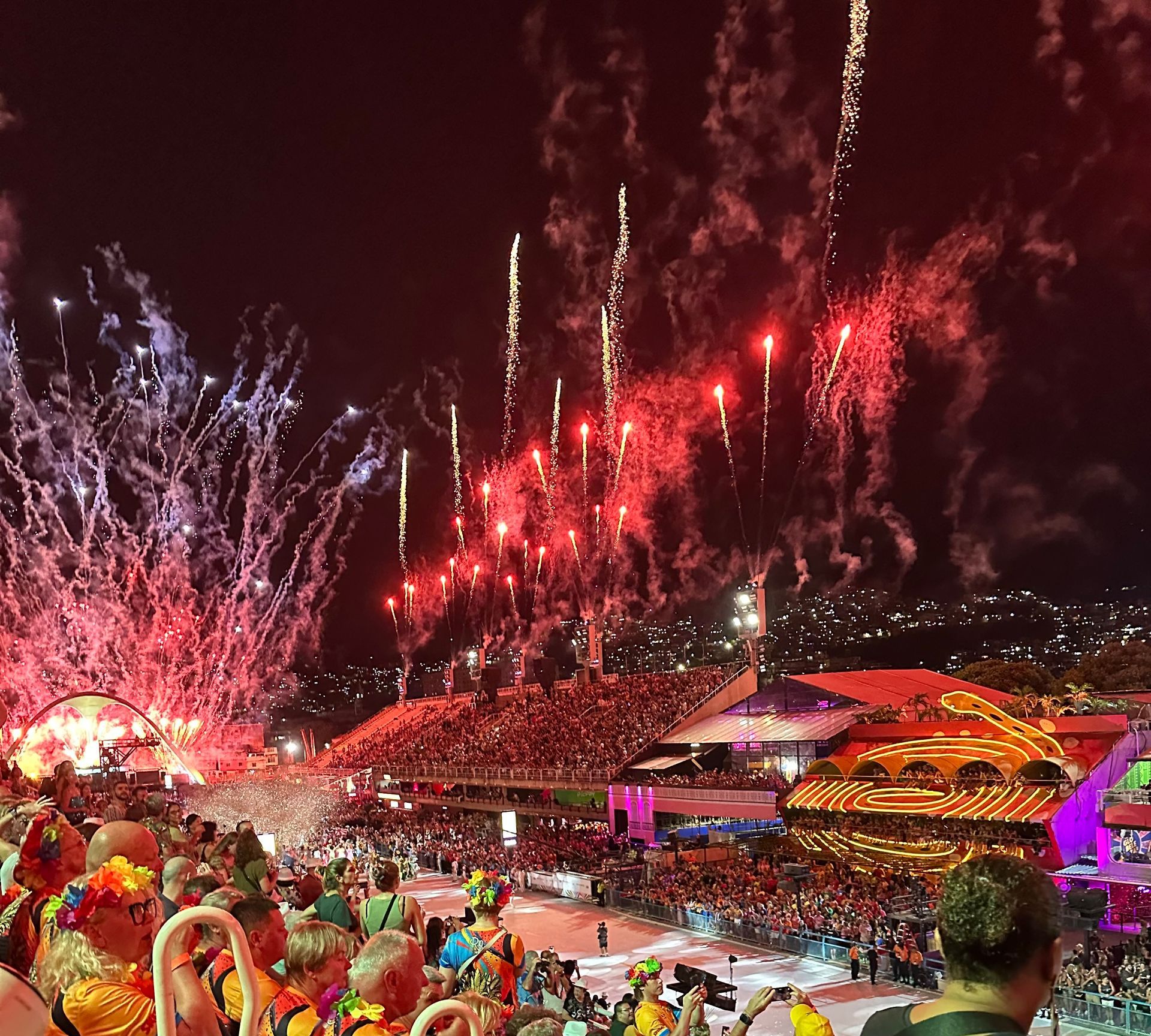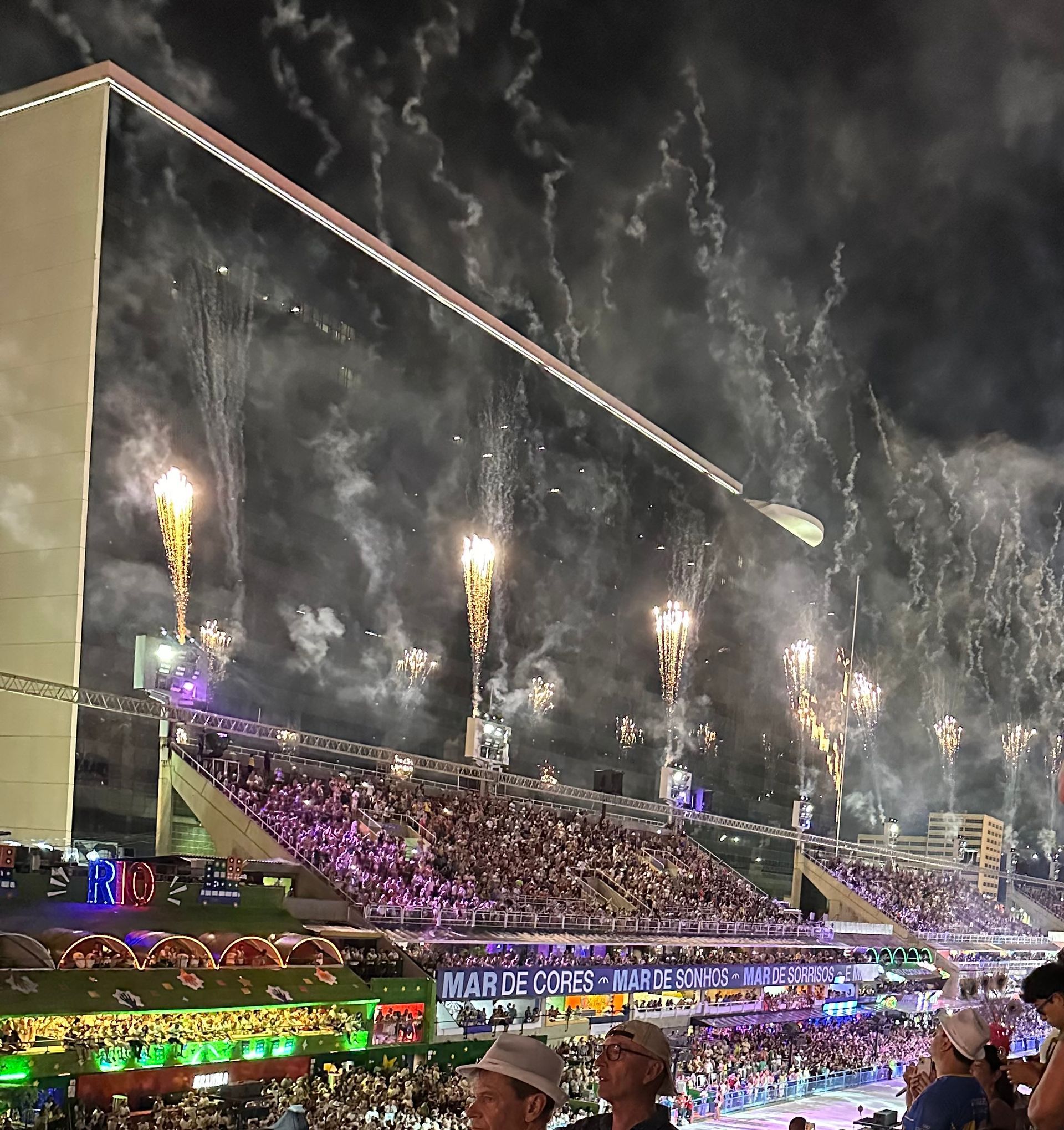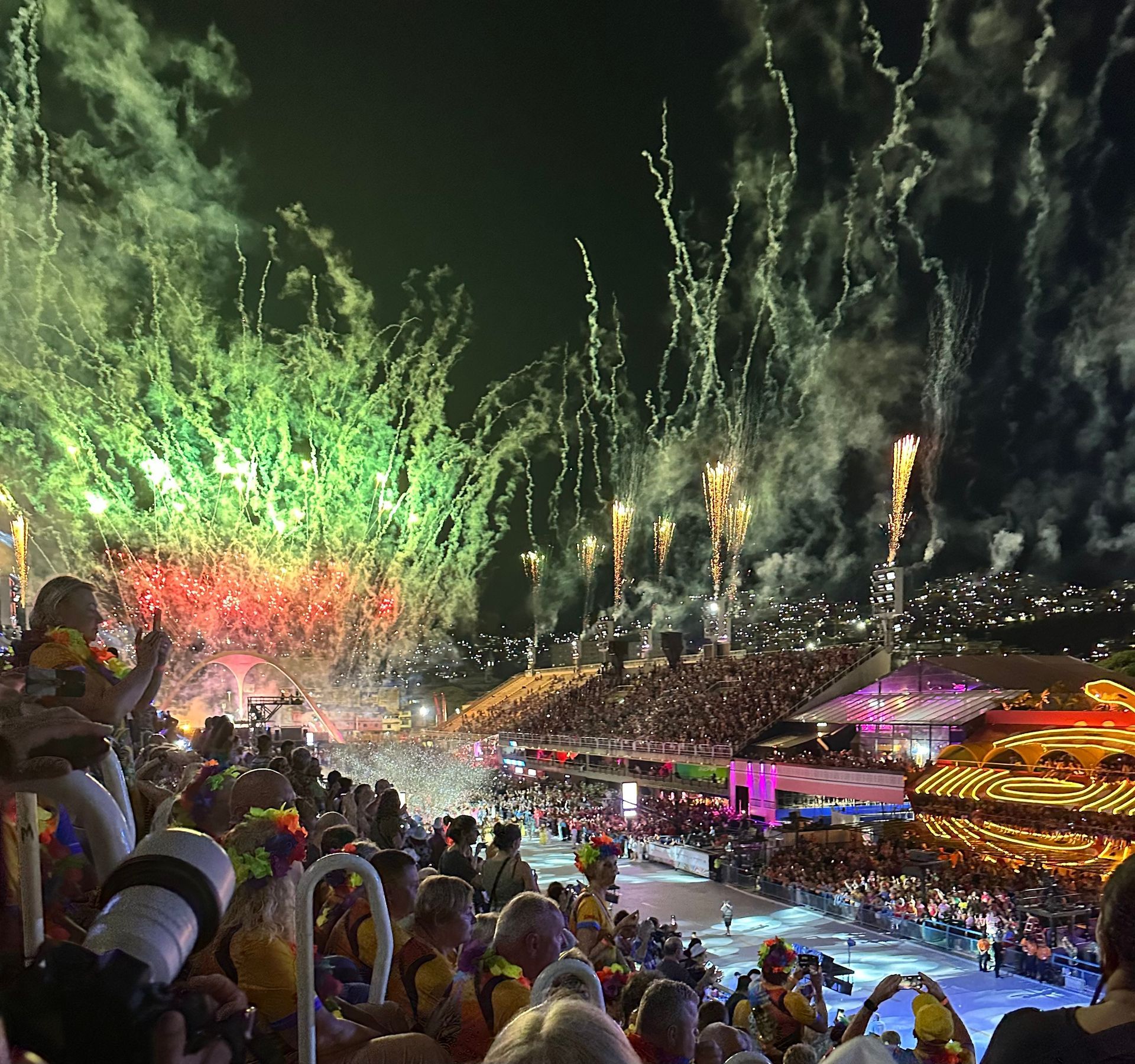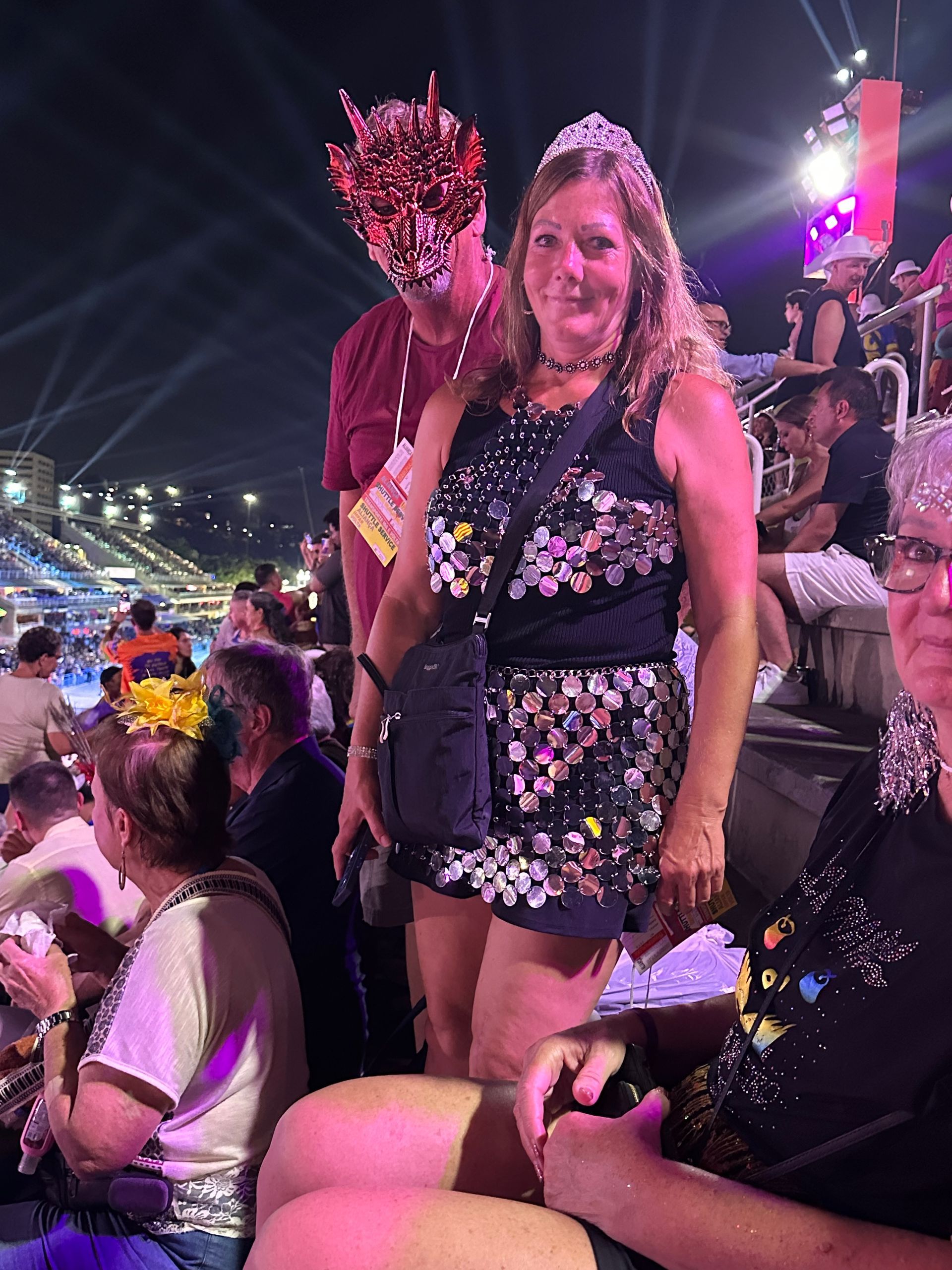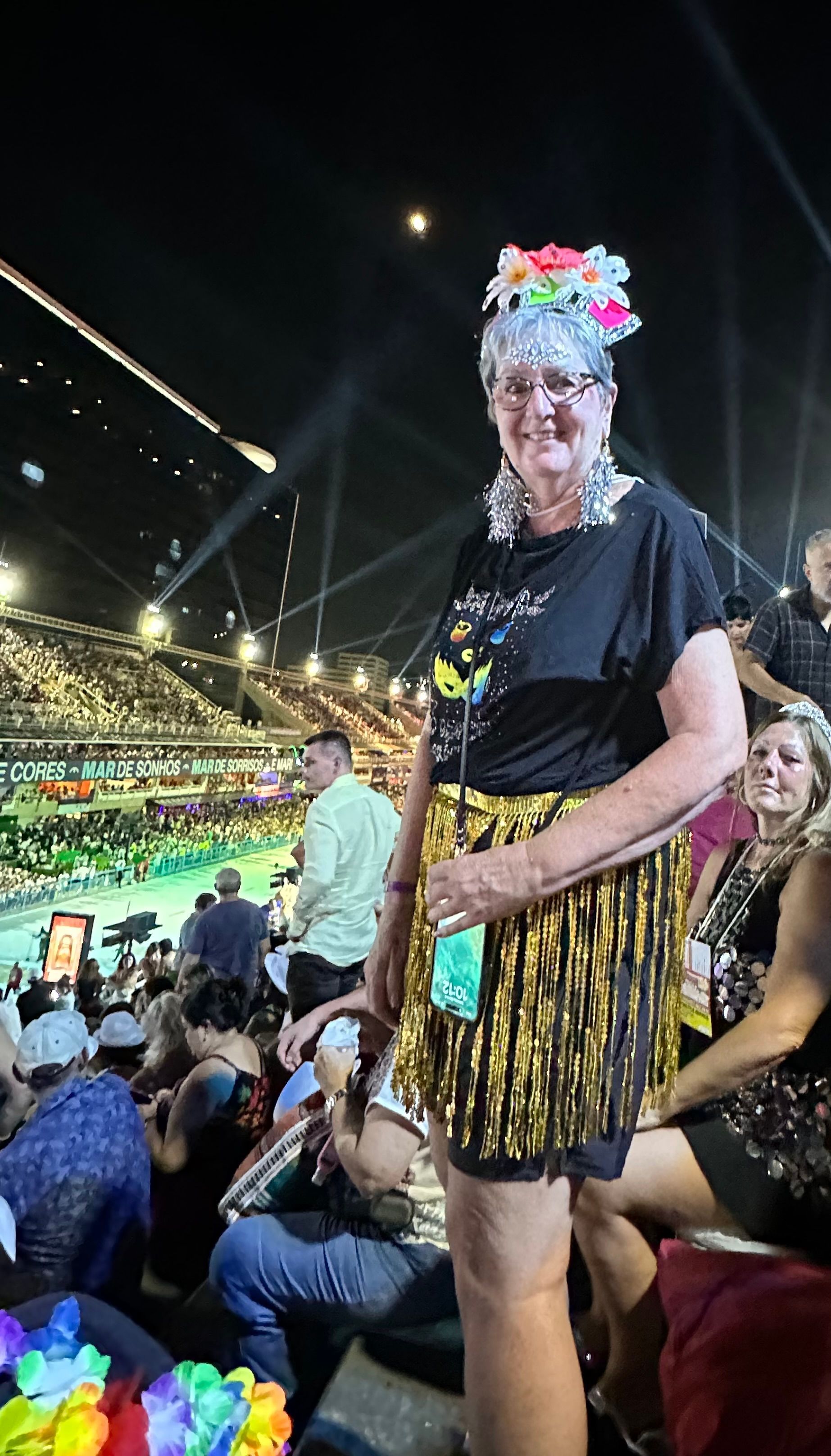 Above is partial gang of residents that took part in celebrating the end of Carnival in Rio, going to the Parade of Champions at the Sambadrome (holds 90,000 people in stands). From L to R - Scott, Gary, Delia, ?,Christy, Me and Lori. Almost everyone in the crowd dresses up in some fashion - it's the hugest party I have ever been too, and it doesn't even get started till 10 Pm at night!! Twelve Samba schools compete all week and this parade celebrates the top 6 schools. Each school (which has to have a minimum of 3,500 members)gets to perform for about an hour with full fireworks at the start of each performance and a break of about 20 to 40 minutes in between, to clean up and clear the street, for the next performance. The 6th best school starts their performance at 10 p.m. and the winners are supposed to be on by 3 a.m. However they started late, the breaks in between schools were much longer, and therefore the best teams #1 BEIJA FLOR & #2 GRANDE RIO performed in the daylight hours, finishing at roughly 8 a.m!! Only Callie (Scott's friend who is visiting) and Gary and myself made it all the way through! Shown below some more or our crowd Sheri, Bob & Sarah - our crazy section and the 3 of us, who stayed to the very end! We then had to get through the crowds and make it back to the ship - had breakfast and then the ship sailed away from port, and we slept all afternoon!