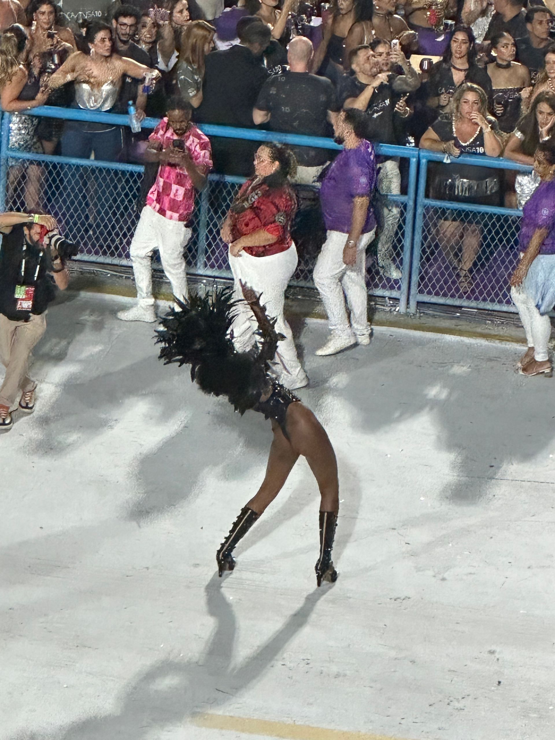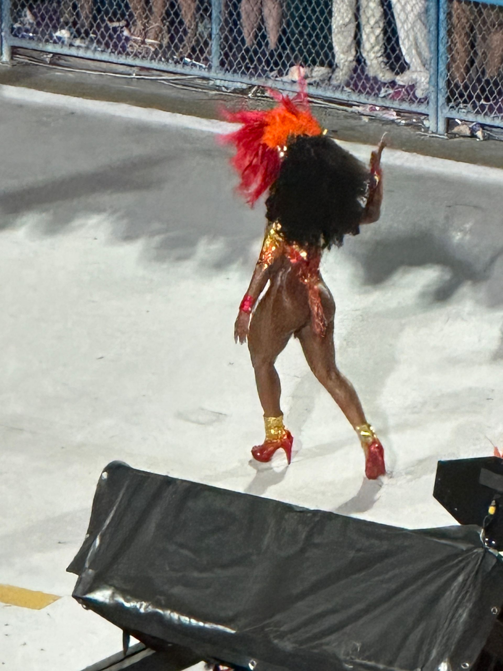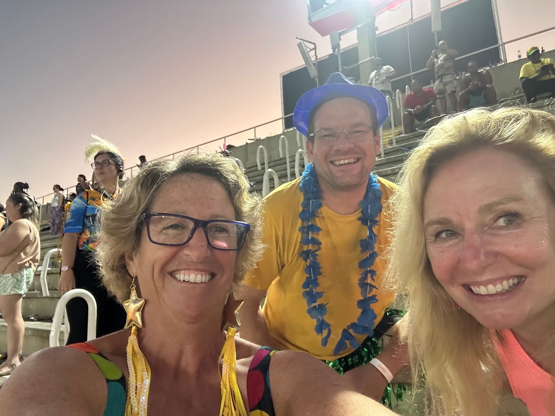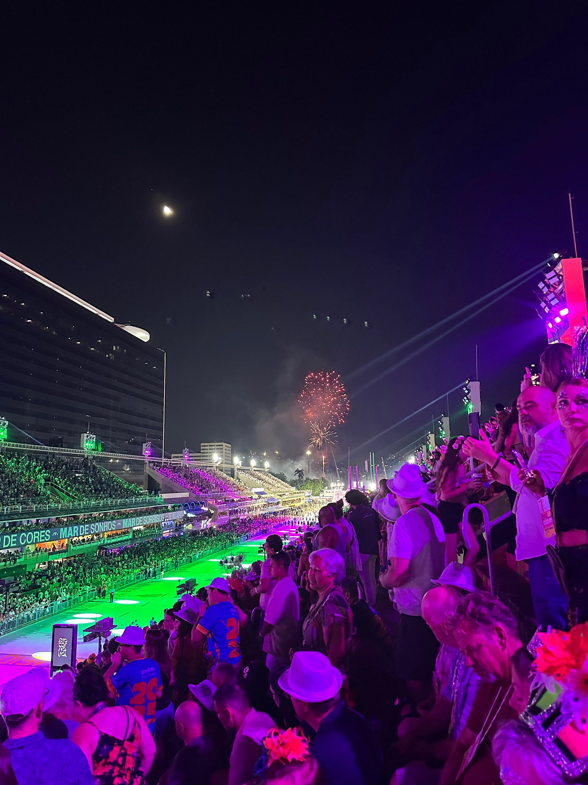 Above is partial gang of residents that took part in celebrating the end of Carnival in Rio, going to the Parade of Champions at the Sambadrome (holds 90,000 people in stands). From L to R - Scott, Gary, Delia, ?,Christy, Me and Lori. Almost everyone in the crowd dresses up in some fashion - it's the hugest party I have ever been too, and it doesn't even get started till 10 Pm at night!! Twelve Samba schools compete all week and this parade celebrates the top 6 schools. Each school (which has to have a minimum of 3,500 members)gets to perform for about an hour with full fireworks at the start of each performance and a break of about 20 to 40 minutes in between, to clean up and clear the street, for the next performance. The 6th best school starts their performance at 10 p.m. and the winners are supposed to be on by 3 a.m. However they started late, the breaks in between schools were much longer, and therefore the best teams #1 BEIJA FLOR & #2 GRANDE RIO performed in the daylight hours, finishing at roughly 8 a.m!! Only Callie (Scott's friend who is visiting) and Gary and myself made it all the way through! Shown below some more or our crowd Sheri, Bob & Sarah - our crazy section and the 3 of us, who stayed to the very end! We then had to get through the crowds and make it back to the ship - had breakfast and then the ship sailed away from port, and we slept all afternoon!