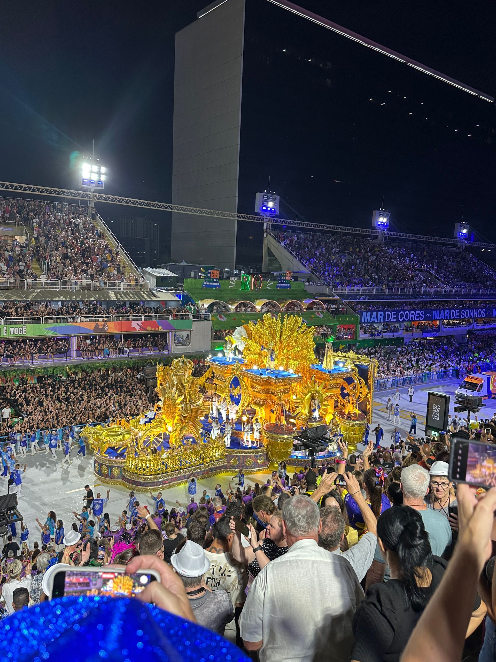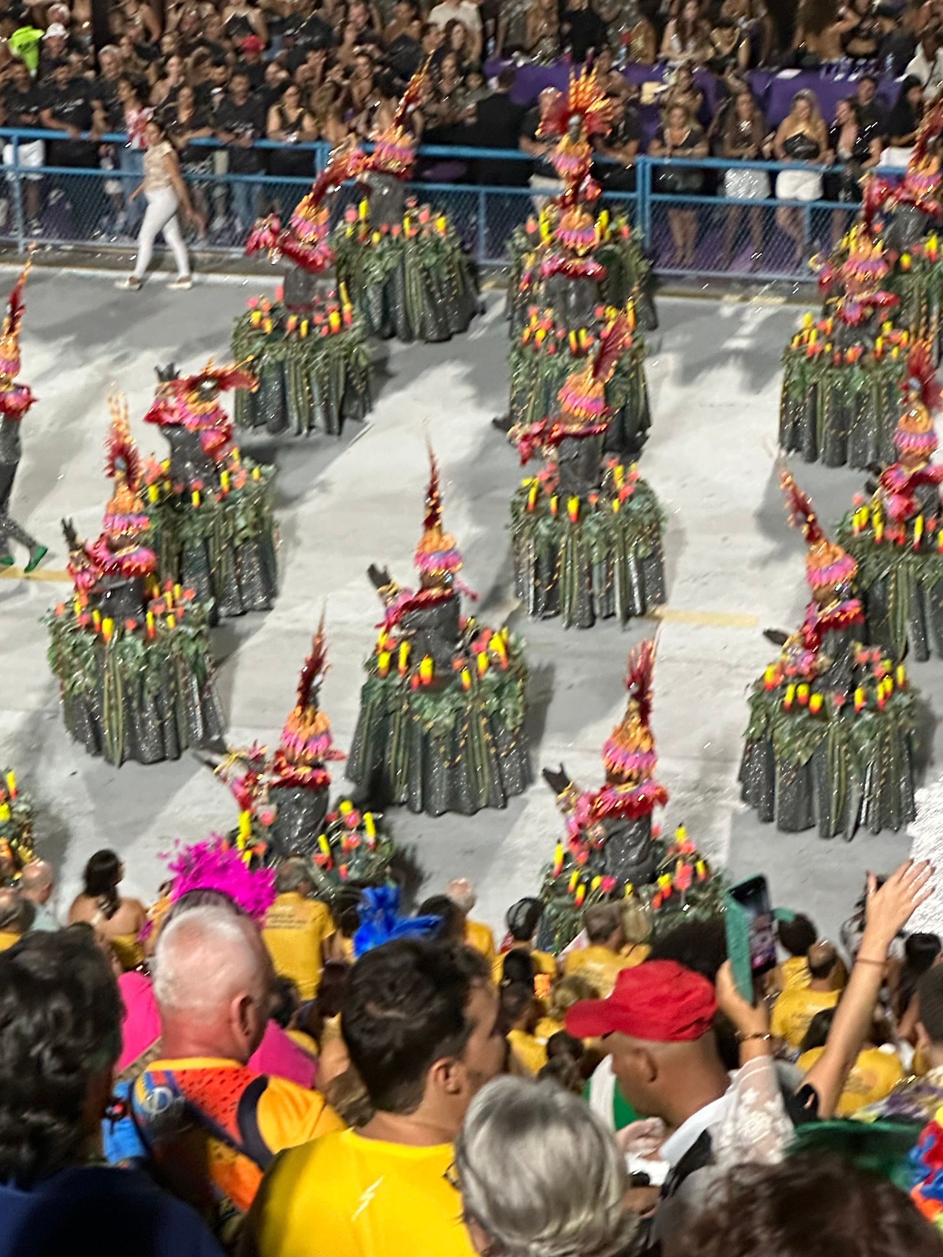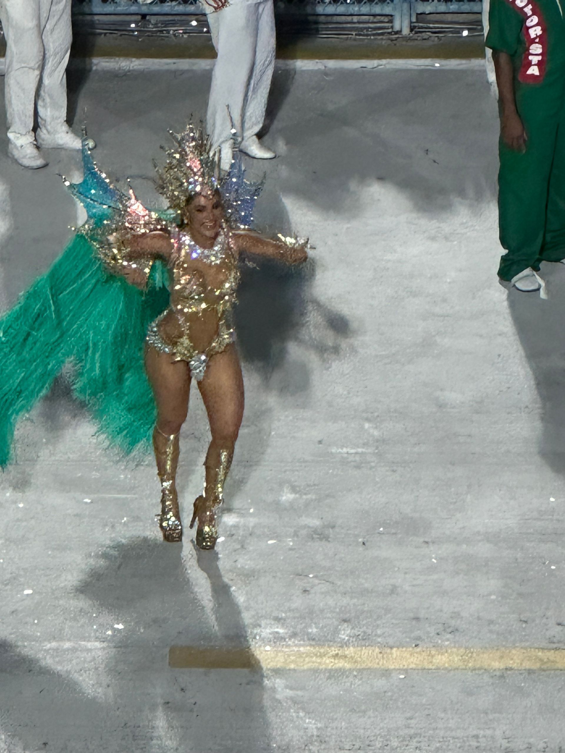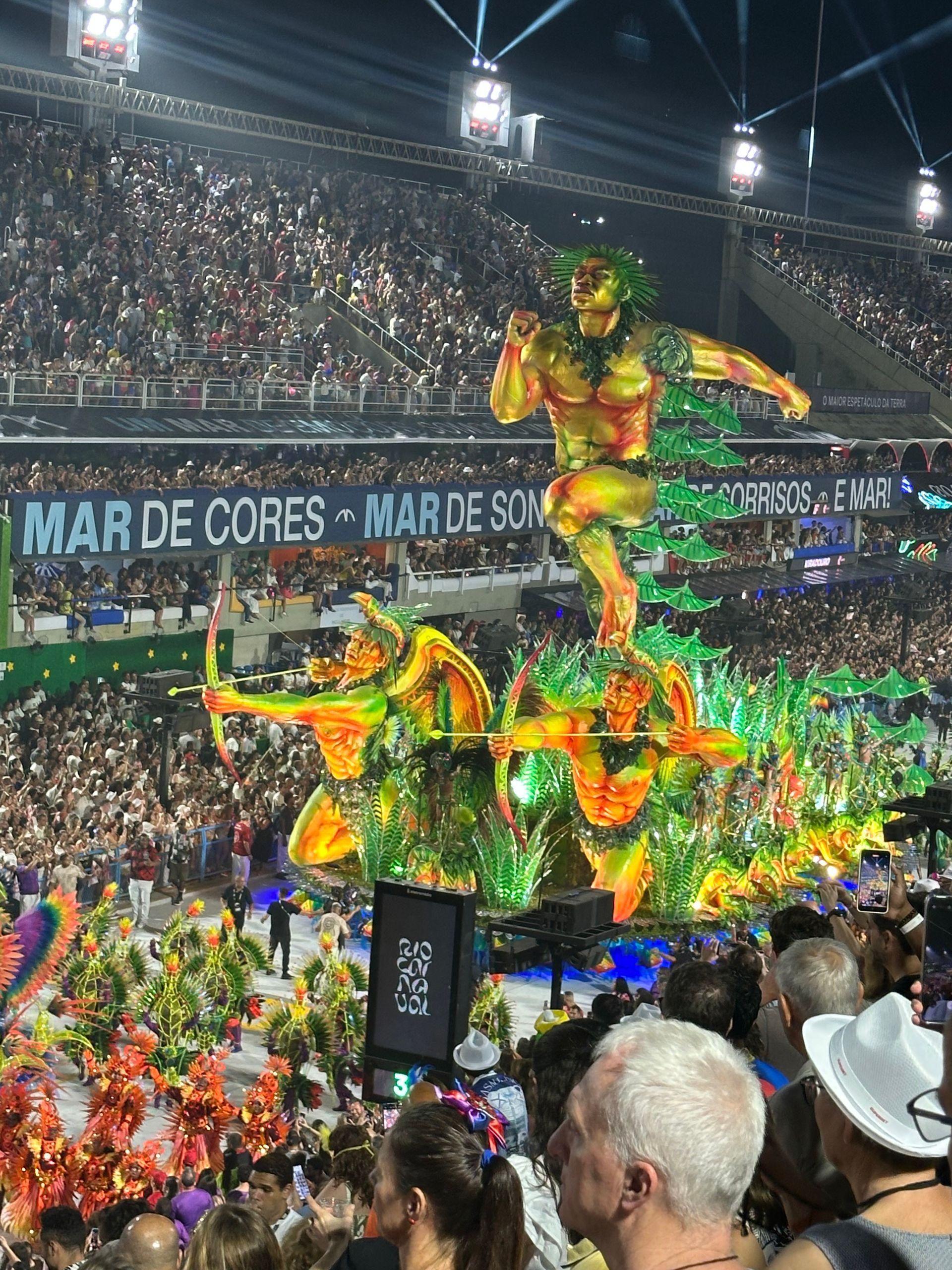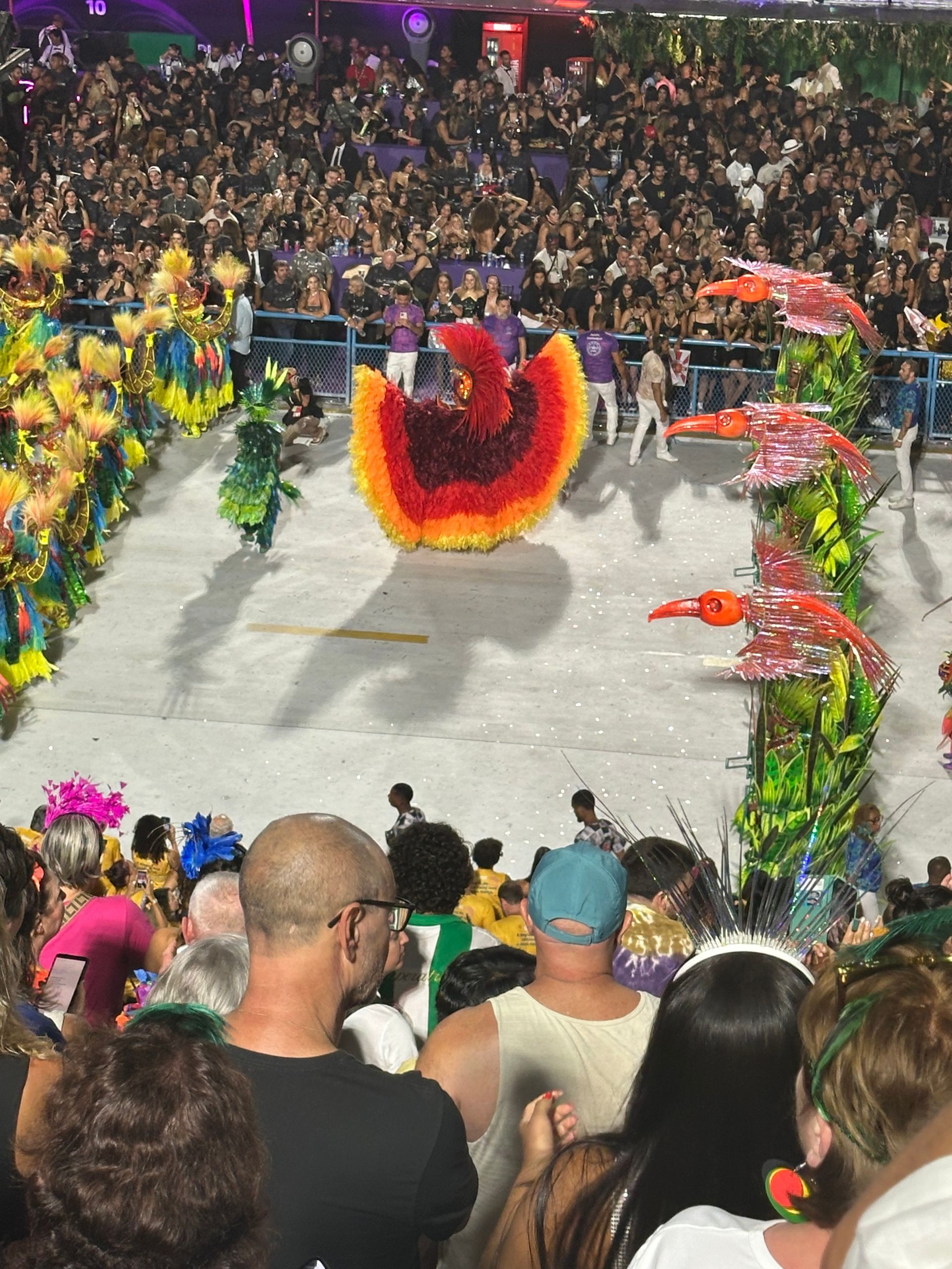 Above is partial gang of residents that took part in celebrating the end of Carnival in Rio, going to the Parade of Champions at the Sambadrome (holds 90,000 people in stands). From L to R - Scott, Gary, Delia, ?,Christy, Me and Lori. Almost everyone in the crowd dresses up in some fashion - it's the hugest party I have ever been too, and it doesn't even get started till 10 Pm at night!! Twelve Samba schools compete all week and this parade celebrates the top 6 schools. Each school (which has to have a minimum of 3,500 members)gets to perform for about an hour with full fireworks at the start of each performance and a break of about 20 to 40 minutes in between, to clean up and clear the street, for the next performance. The 6th best school starts their performance at 10 p.m. and the winners are supposed to be on by 3 a.m. However they started late, the breaks in between schools were much longer, and therefore the best teams #1 BEIJA FLOR & #2 GRANDE RIO performed in the daylight hours, finishing at roughly 8 a.m!! Only Callie (Scott's friend who is visiting) and Gary and myself made it all the way through! Shown below some more or our crowd Sheri, Bob & Sarah - our crazy section and the 3 of us, who stayed to the very end! We then had to get through the crowds and make it back to the ship - had breakfast and then the ship sailed away from port, and we slept all afternoon!