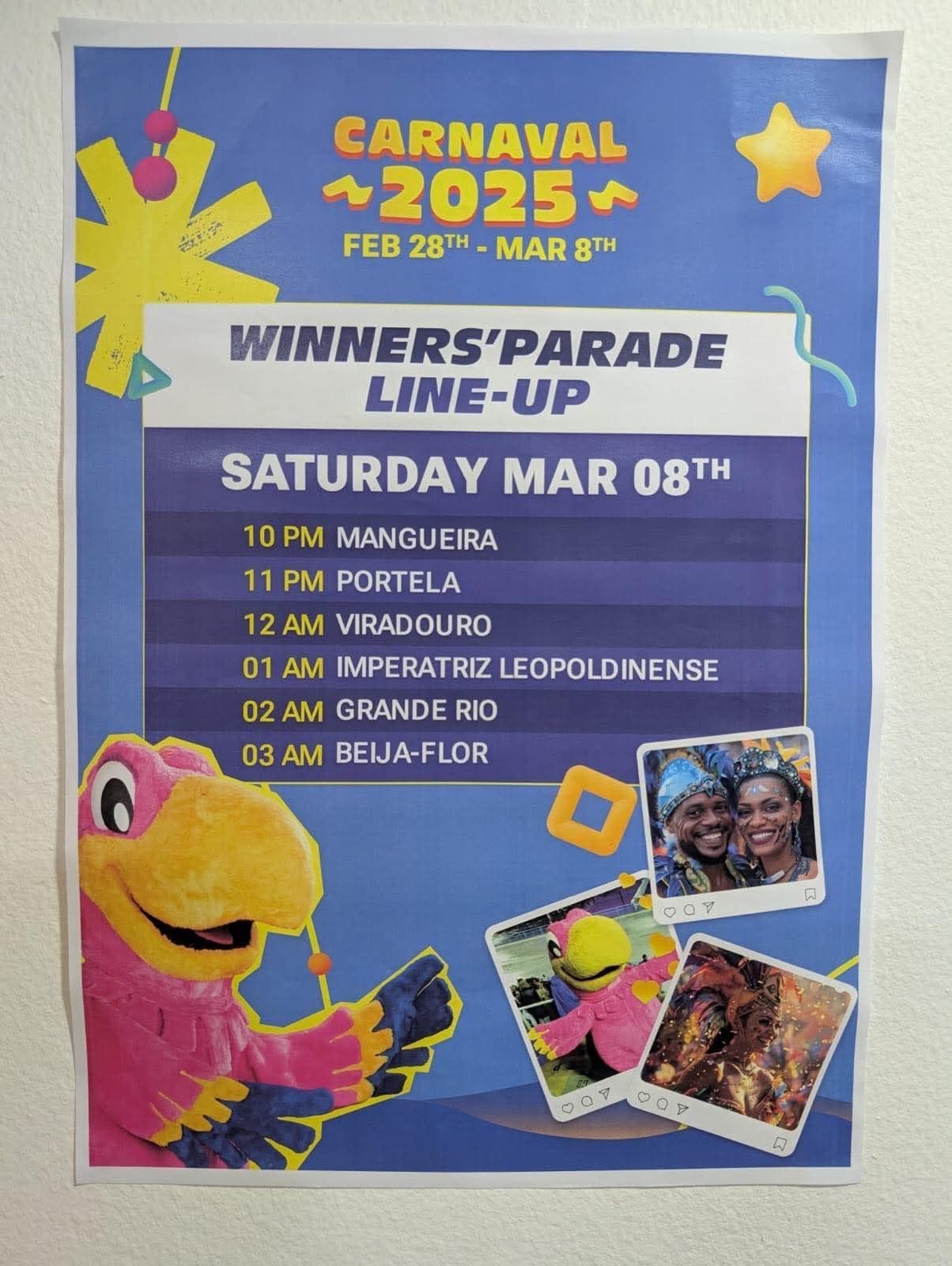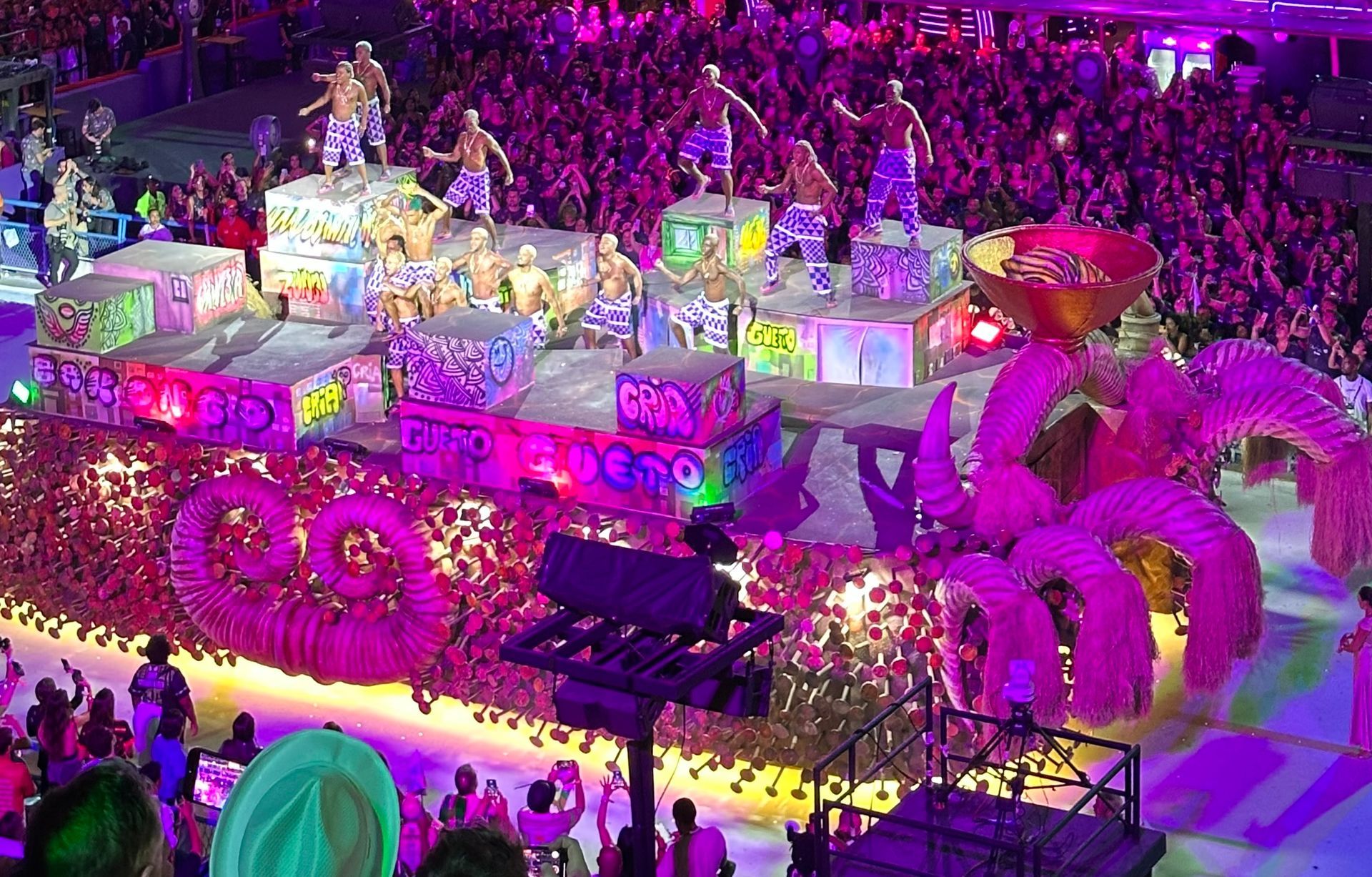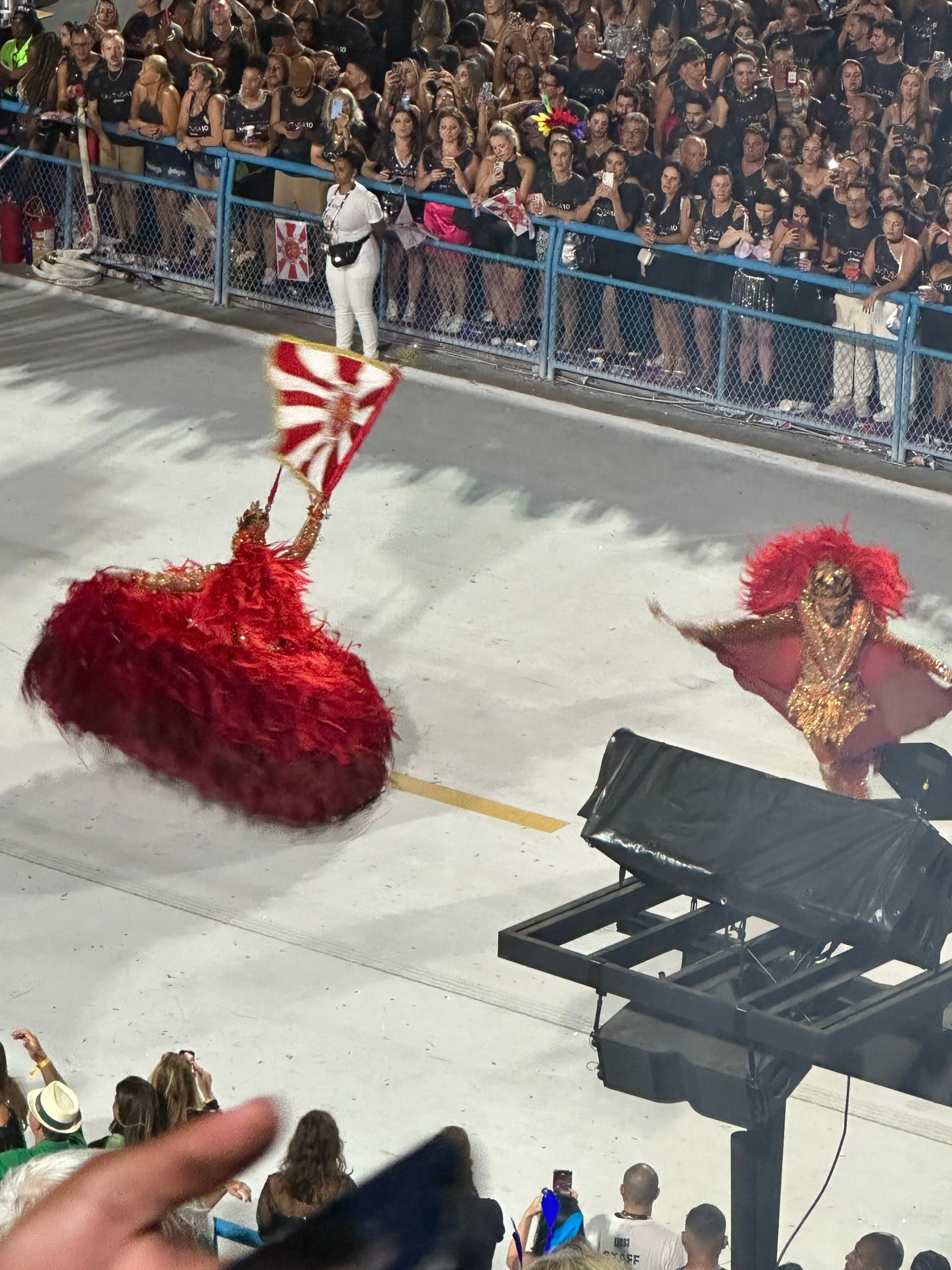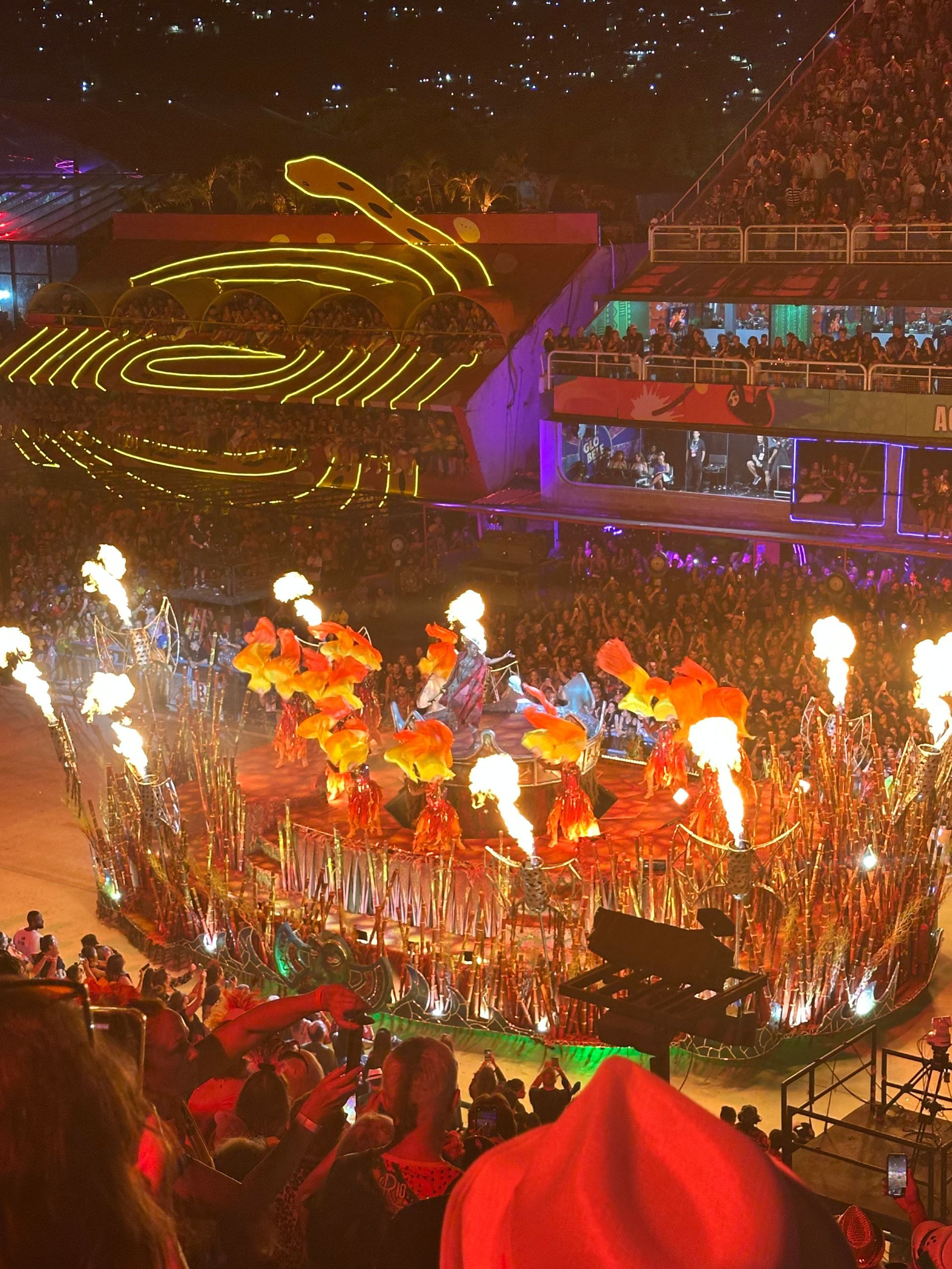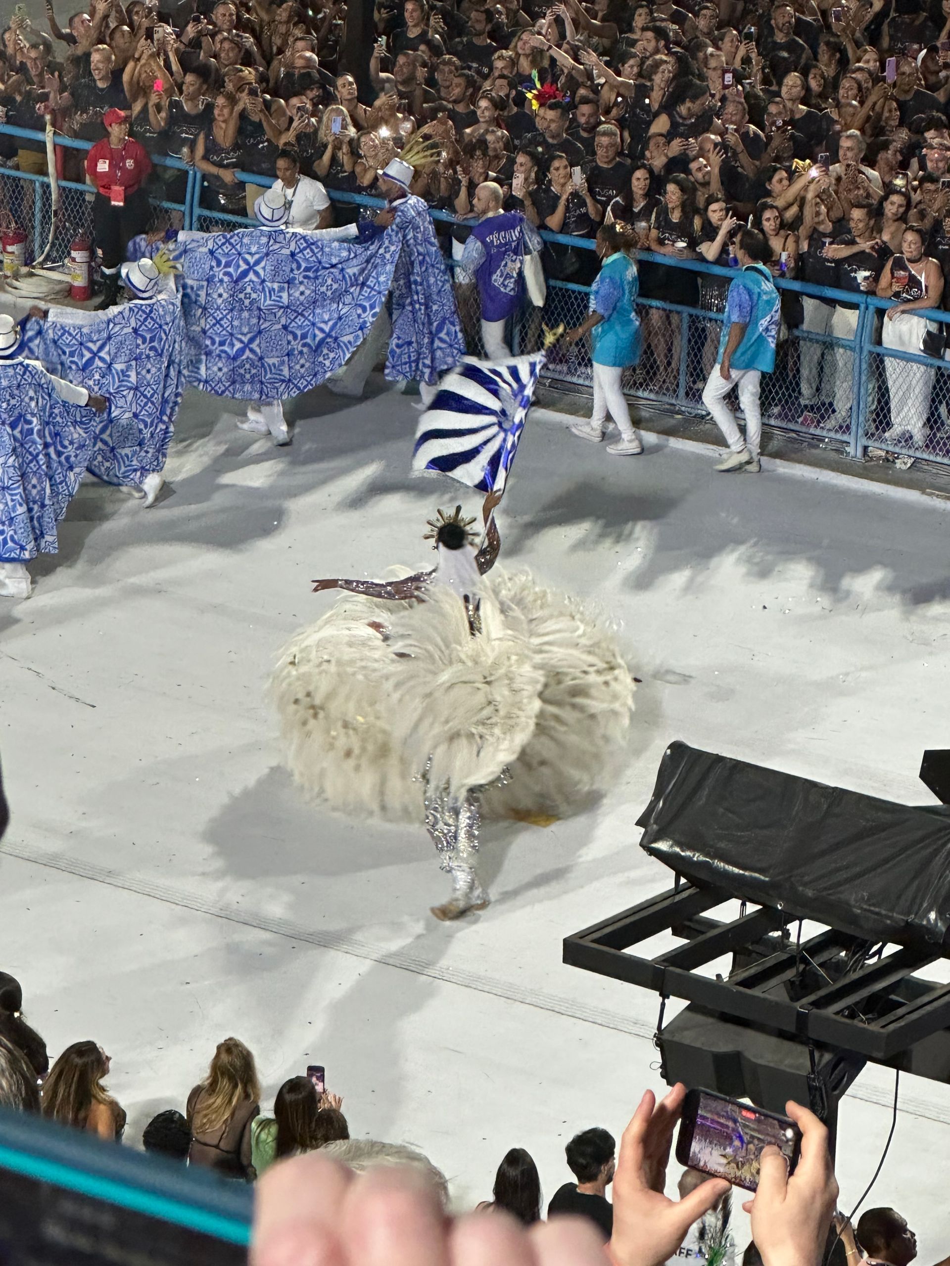 Above is partial gang of residents that took part in celebrating the end of Carnival in Rio, going to the Parade of Champions at the Sambadrome (holds 90,000 people in stands). From L to R - Scott, Gary, Delia, ?,Christy, Me and Lori. Almost everyone in the crowd dresses up in some fashion - it's the hugest party I have ever been too, and it doesn't even get started till 10 Pm at night!! Twelve Samba schools compete all week and this parade celebrates the top 6 schools. Each school (which has to have a minimum of 3,500 members)gets to perform for about an hour with full fireworks at the start of each performance and a break of about 20 to 40 minutes in between, to clean up and clear the street, for the next performance. The 6th best school starts their performance at 10 p.m. and the winners are supposed to be on by 3 a.m. However they started late, the breaks in between schools were much longer, and therefore the best teams #1 BEIJA FLOR & #2 GRANDE RIO performed in the daylight hours, finishing at roughly 8 a.m!! Only Callie (Scott's friend who is visiting) and Gary and myself made it all the way through! Shown below some more or our crowd Sheri, Bob & Sarah - our crazy section and the 3 of us, who stayed to the very end! We then had to get through the crowds and make it back to the ship - had breakfast and then the ship sailed away from port, and we slept all afternoon!