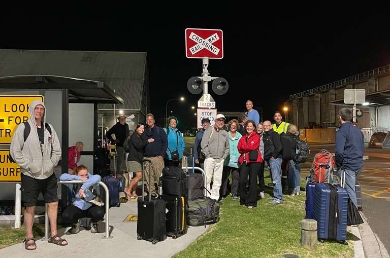 Rotorua became a bonus city for us. Our Port stay in Tauranga got cut down to one day, due to NZ biosecurity regulations and since we really wanted to do Hobbiton, we decided to get off the ship and stay in hotels and get back on the ship, in a few days. Due to a variety of factors, the Ship ended up doing a quick pick up of us in Tauranga, three days later. The Kiwi's we encountered along the way, who helped with all our last minute details, were amazingly kind, hospitable and generous. Below is our tired, chilly group huddled at the security shed, outside the Port in the wee hours (1:30 am) Monday morning, awaiting our final hurdle of getting back on our Home. Home sweet home! What an adventure!