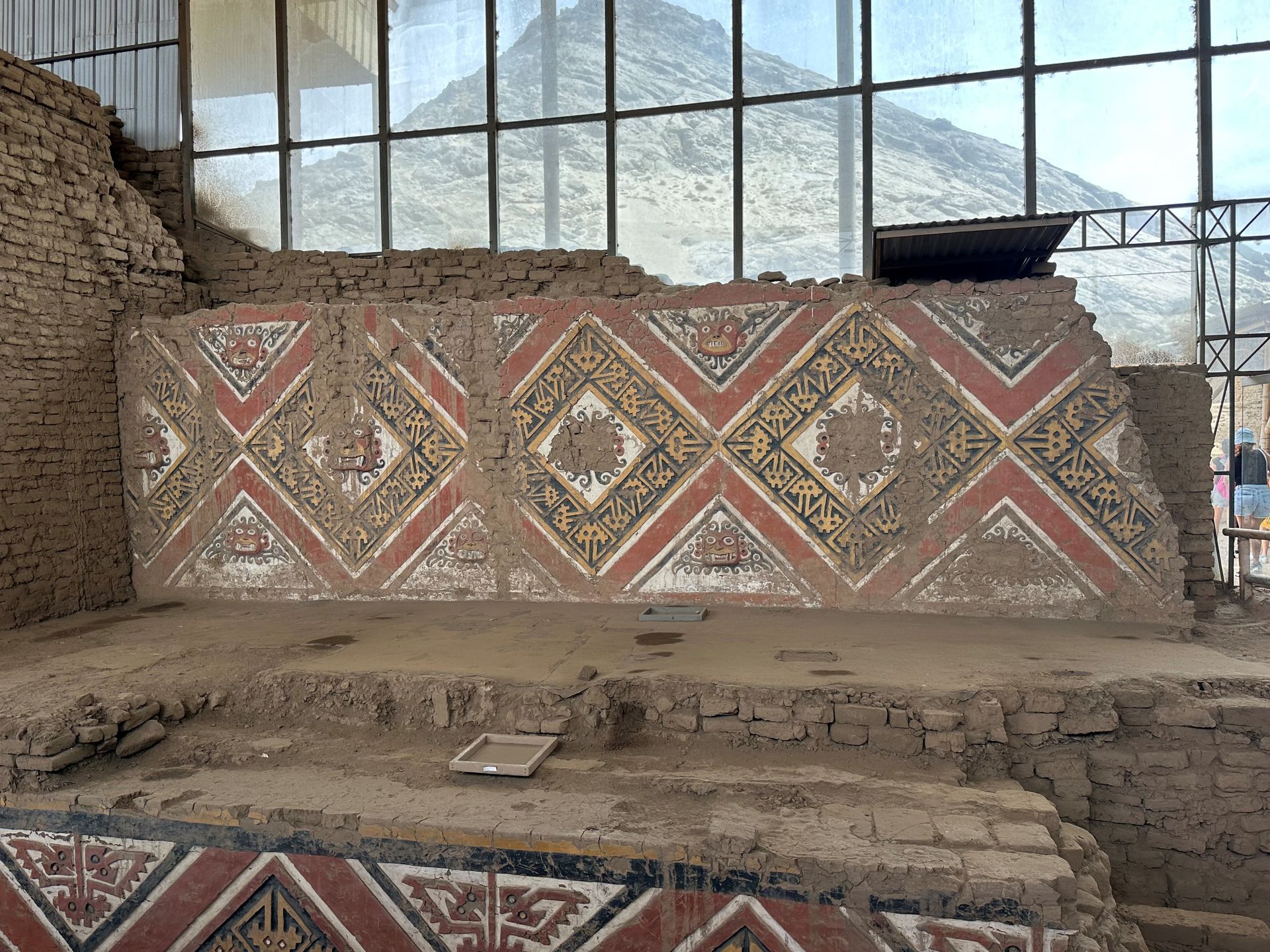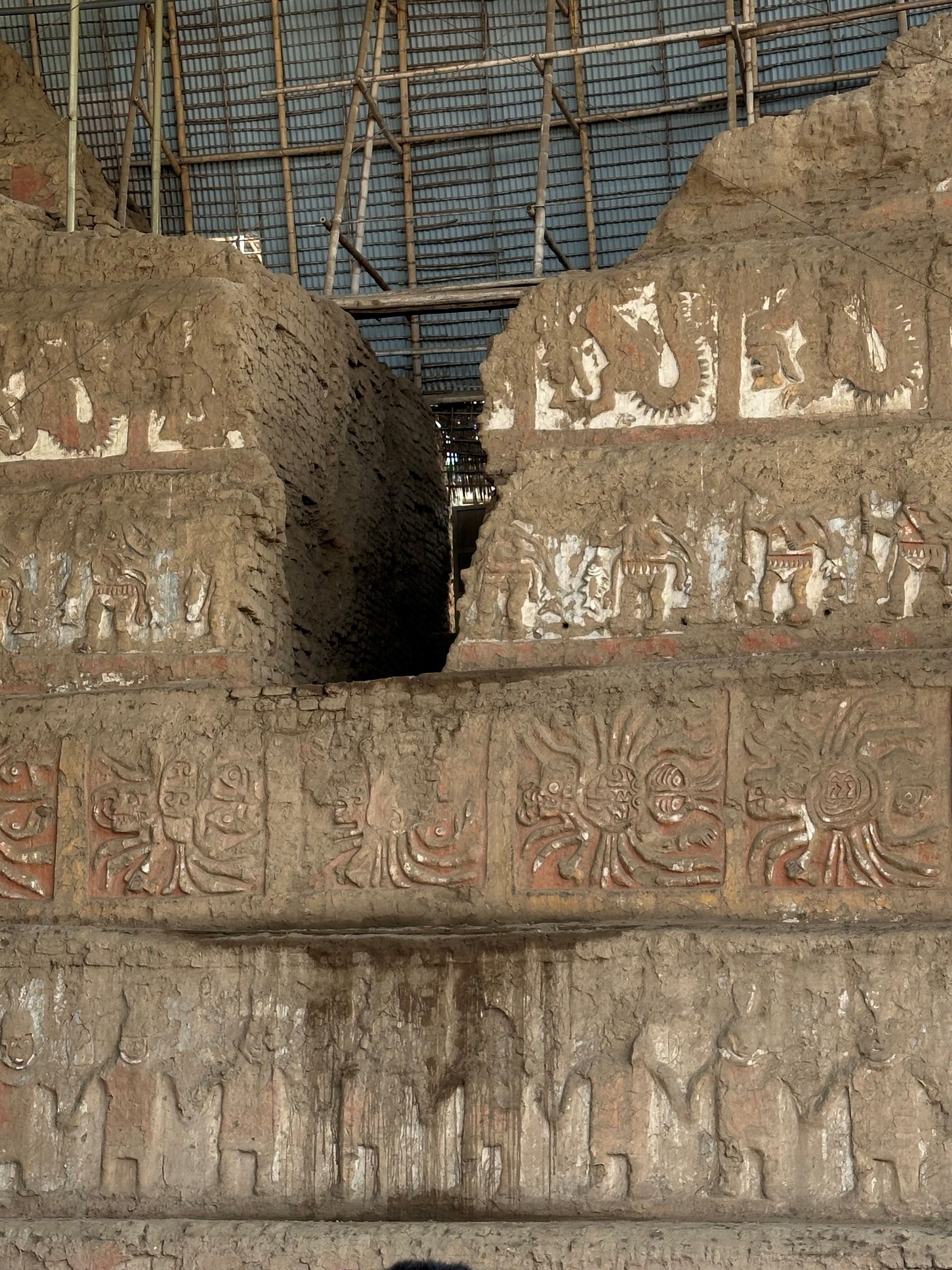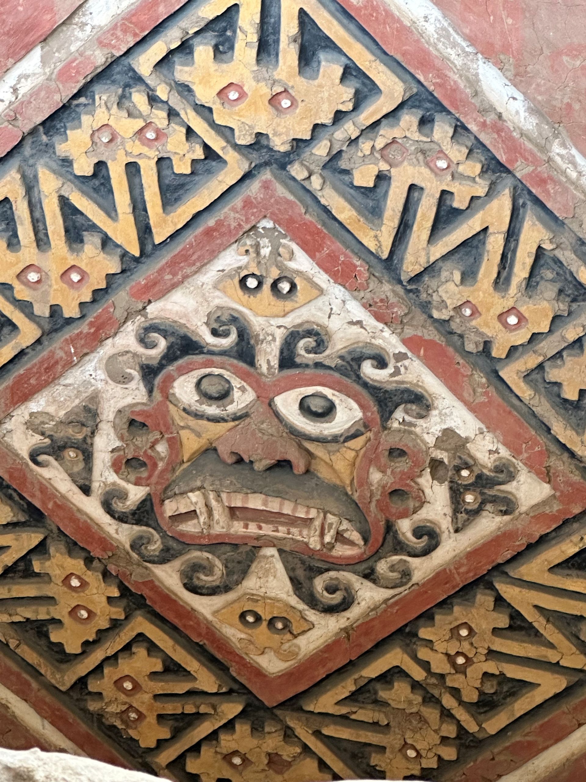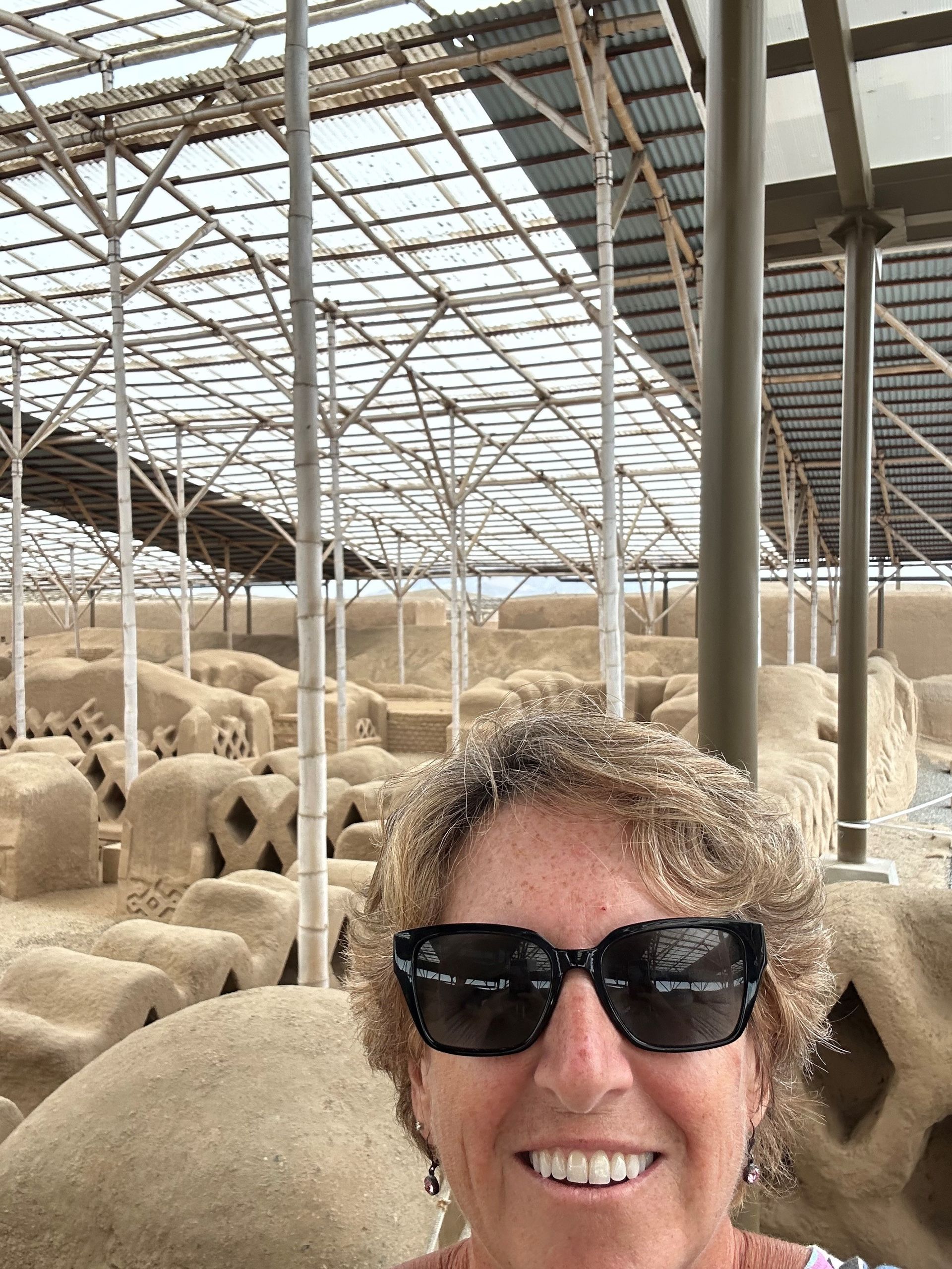 We pulled into the port of Salaverry, Peru around 9 am Sunday, December 29th, despite the reports of awful weather coming out of Peru. We heard there was a tsunami that hit the north of Peru ( just above us) and severe wind gusts and swells were elsewhere. We must have been in a protective bubble, thankfully, because the seas were calm and the winds not a factor. I spent the day with friends Delia, Lauren and Scott exploring ancient ruins and town of Trujillo. We hired a cab for 5 hours to take us around and wait at each locale. The driver didn't speak English but used a translate app through his car speaker to communicate with us and we could use also to ask questions. Love Technology ! First stop was the ruins of the Moche civilization - La Huaca de la Luna - a large pyramid built for worship & human sacrifice when the flooding rain came.