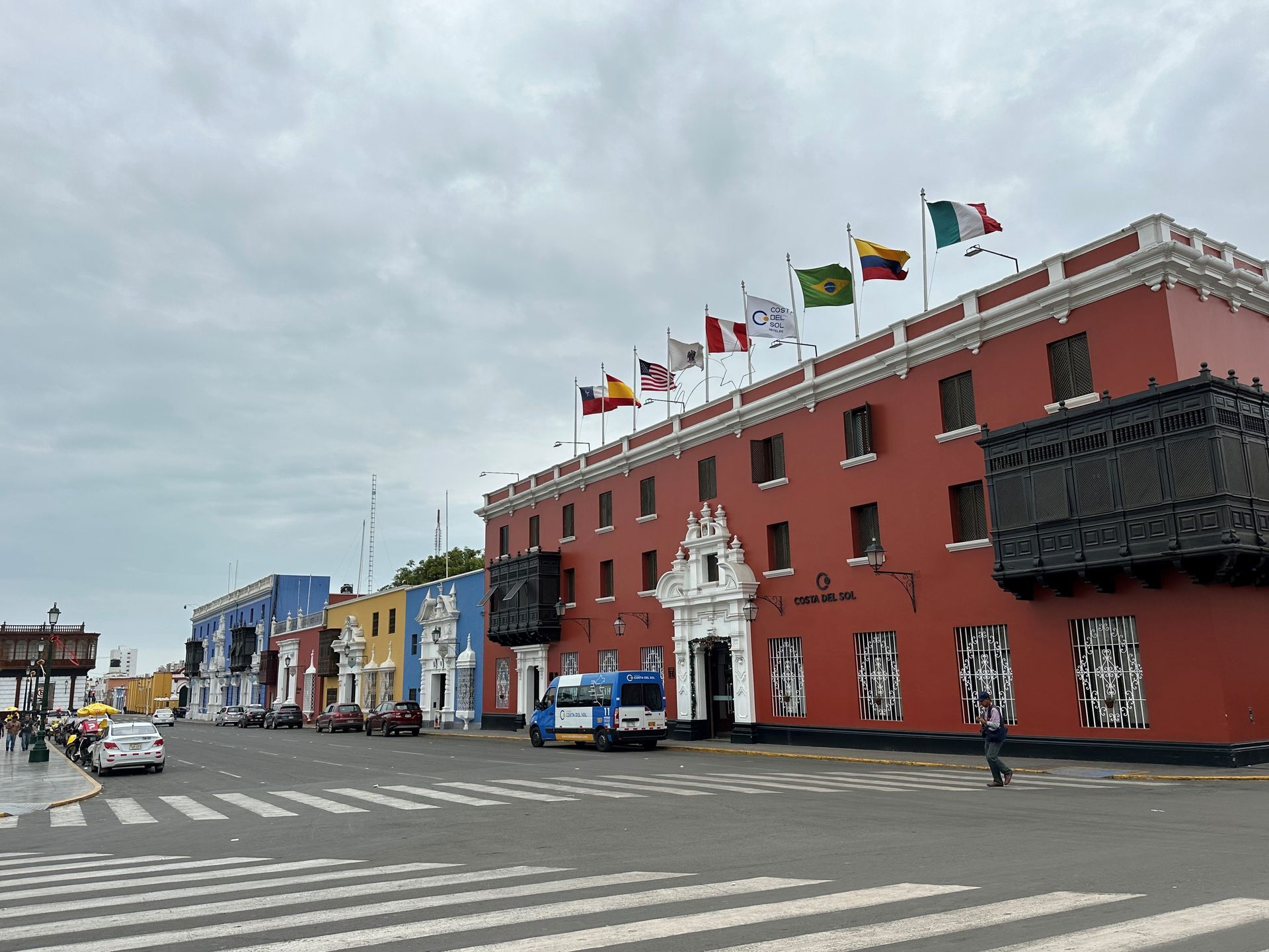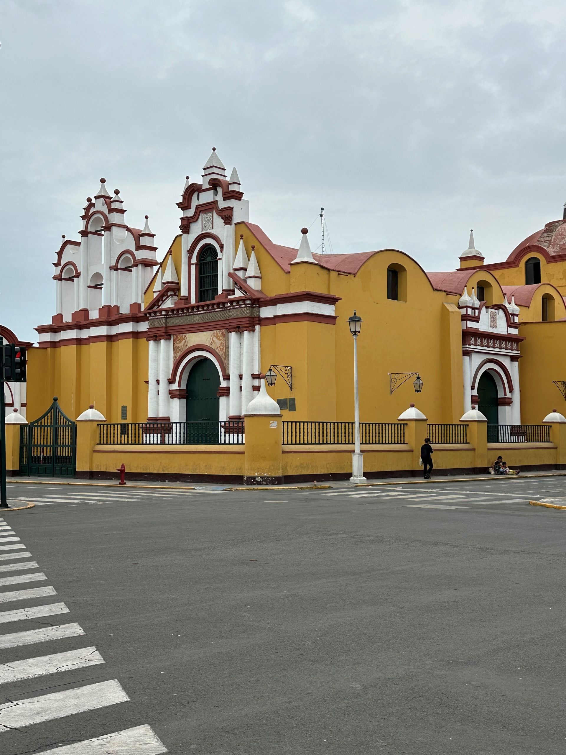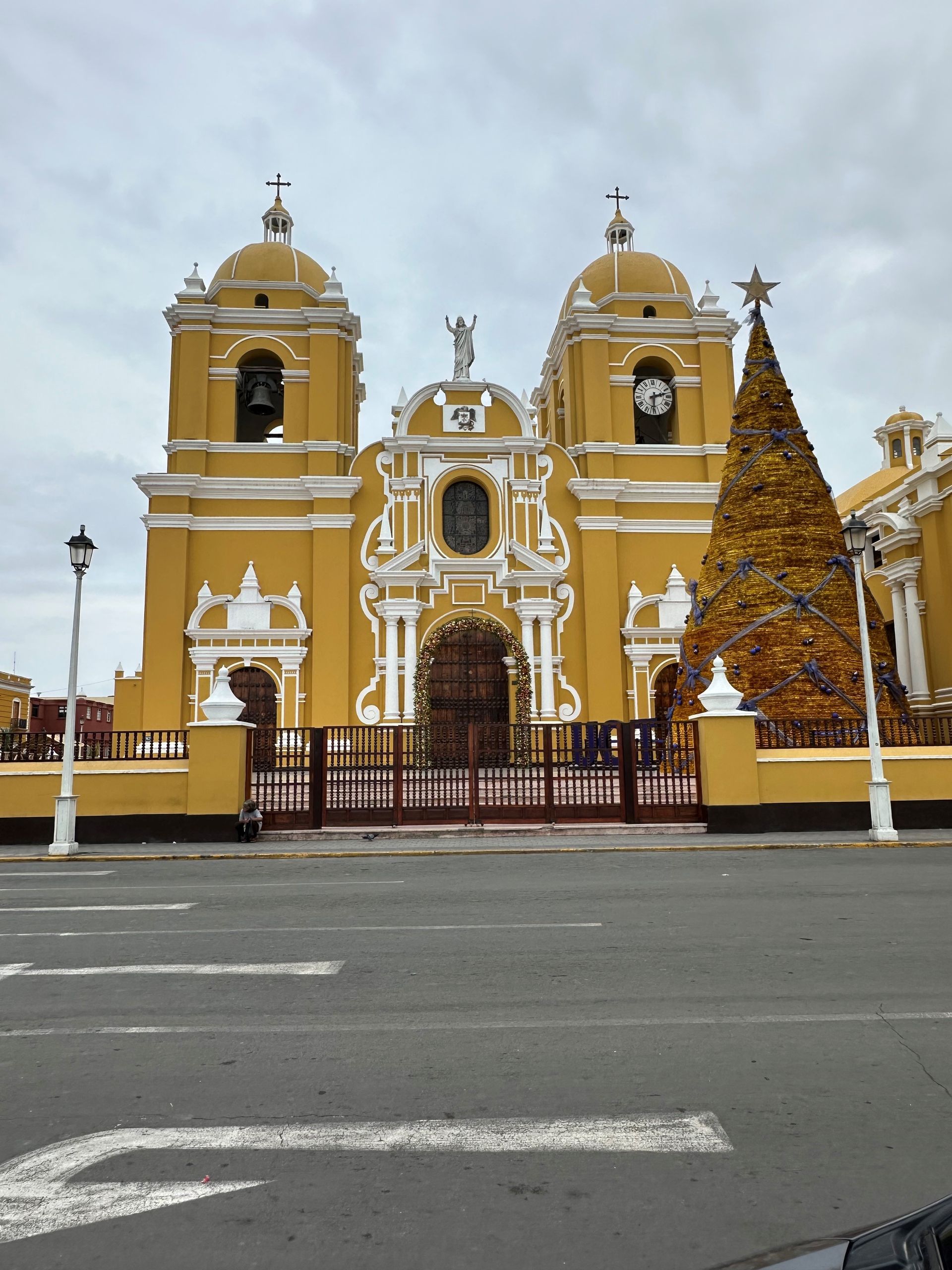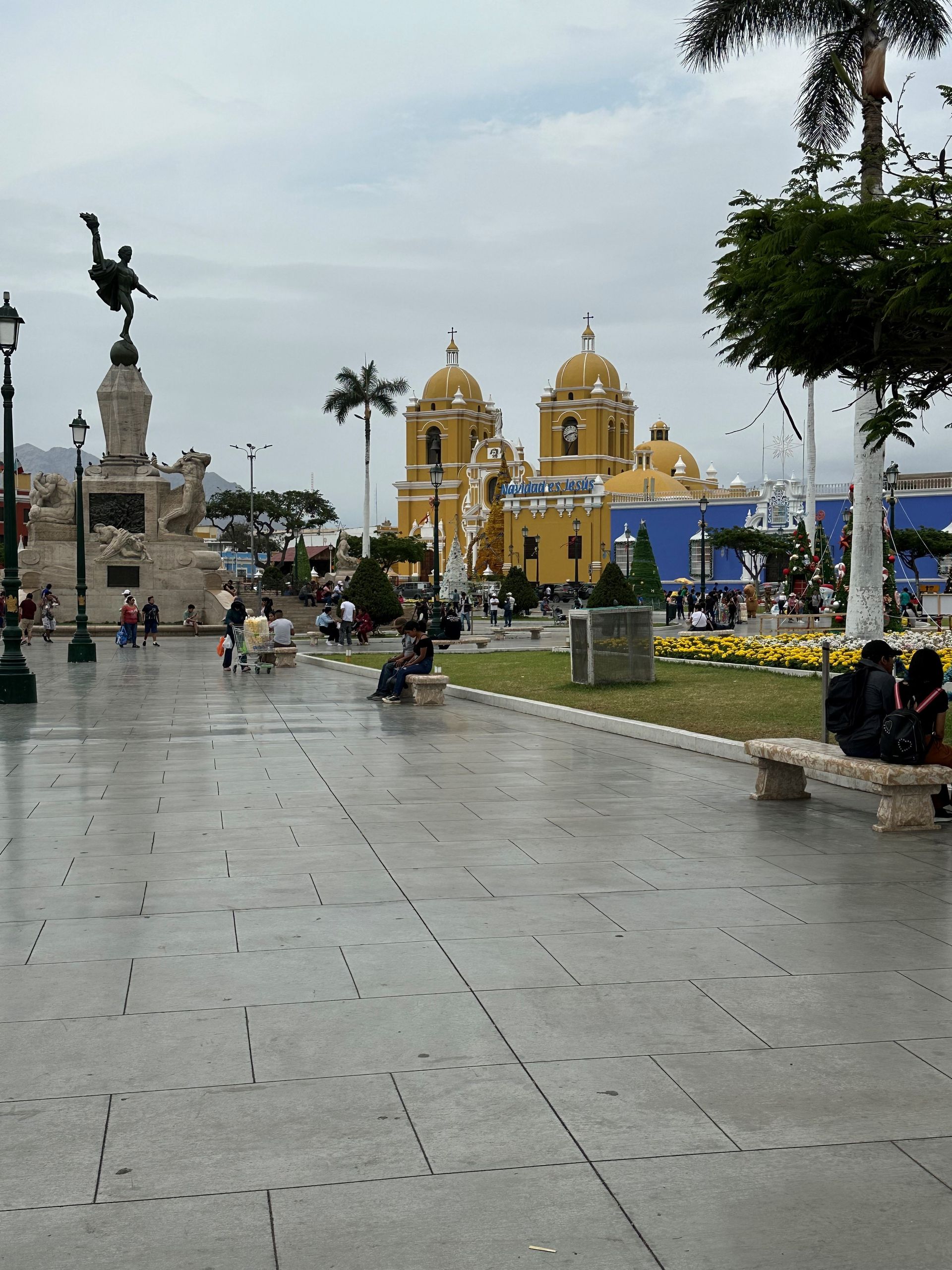 A lot of information is just guesses or theories of archeologist, but the Moche civilization, is believed to exist from 400 to 900 A.D. They built 2 temples pyramids, that scientist named Luna and Sol, with a city in between. Luna had been excavated about 60 % before funds dried up. Sol and City barely touched. Story goes that they did human sacrifices, decapitation of their heads (after they were drugged by plants) in an effort to stop heavy rains. Engineering used to construct shape very involved. Every 100 years another level was built and carved and painted with story decorations. Five layers or 500 years uncovered. Next we went to TRUJILLO CITY SQUARE. We walked around, went to bank for local currency and got some Chinese food CHIFA for lunch.