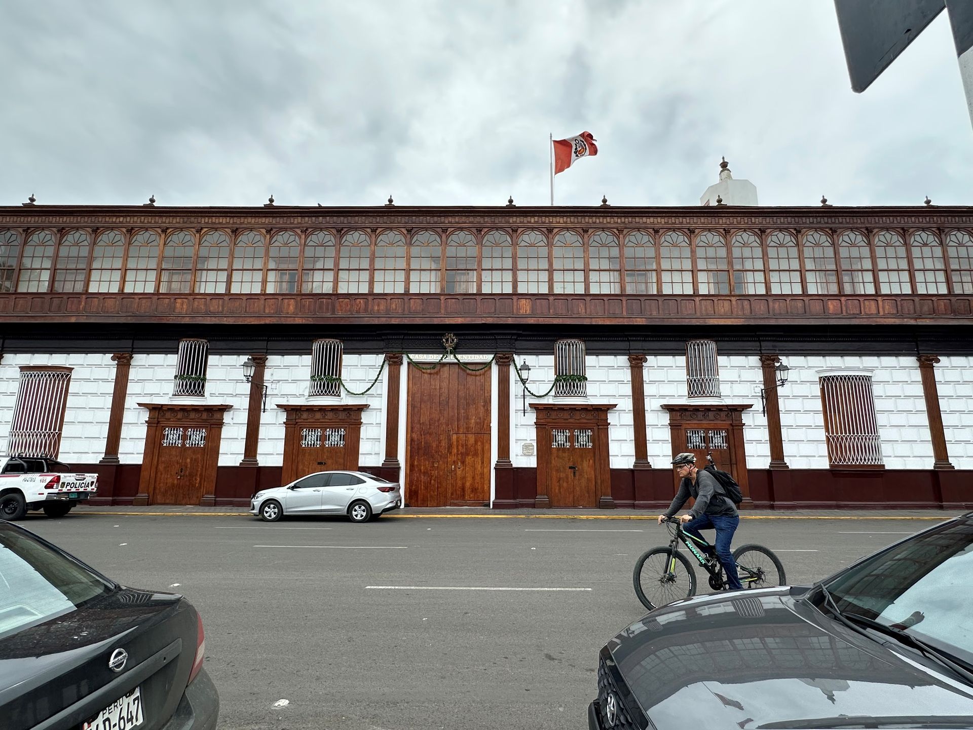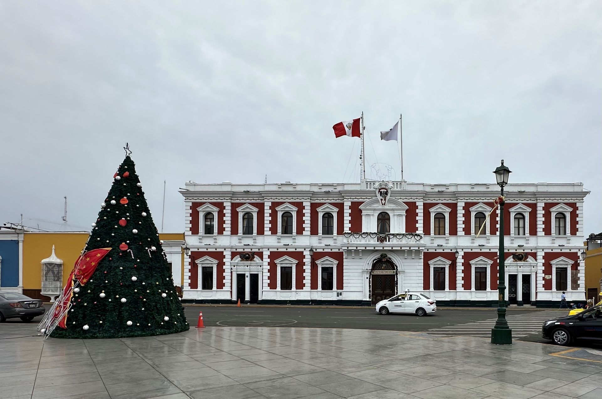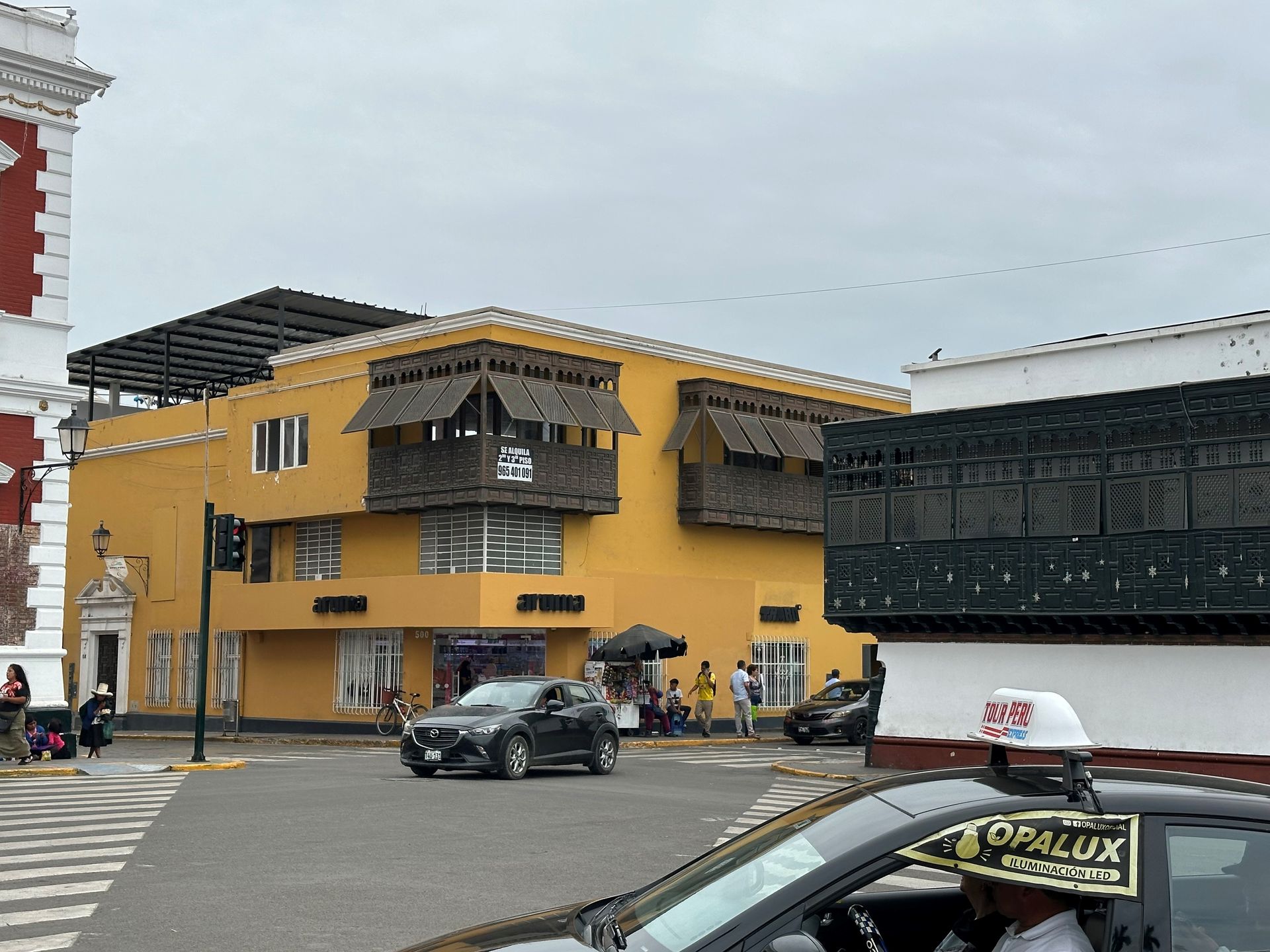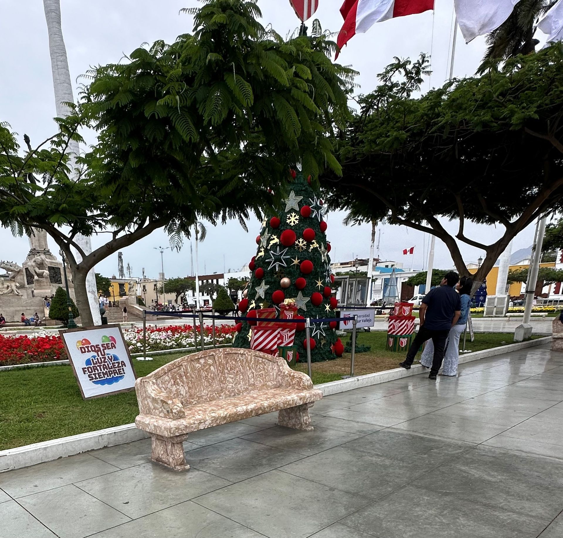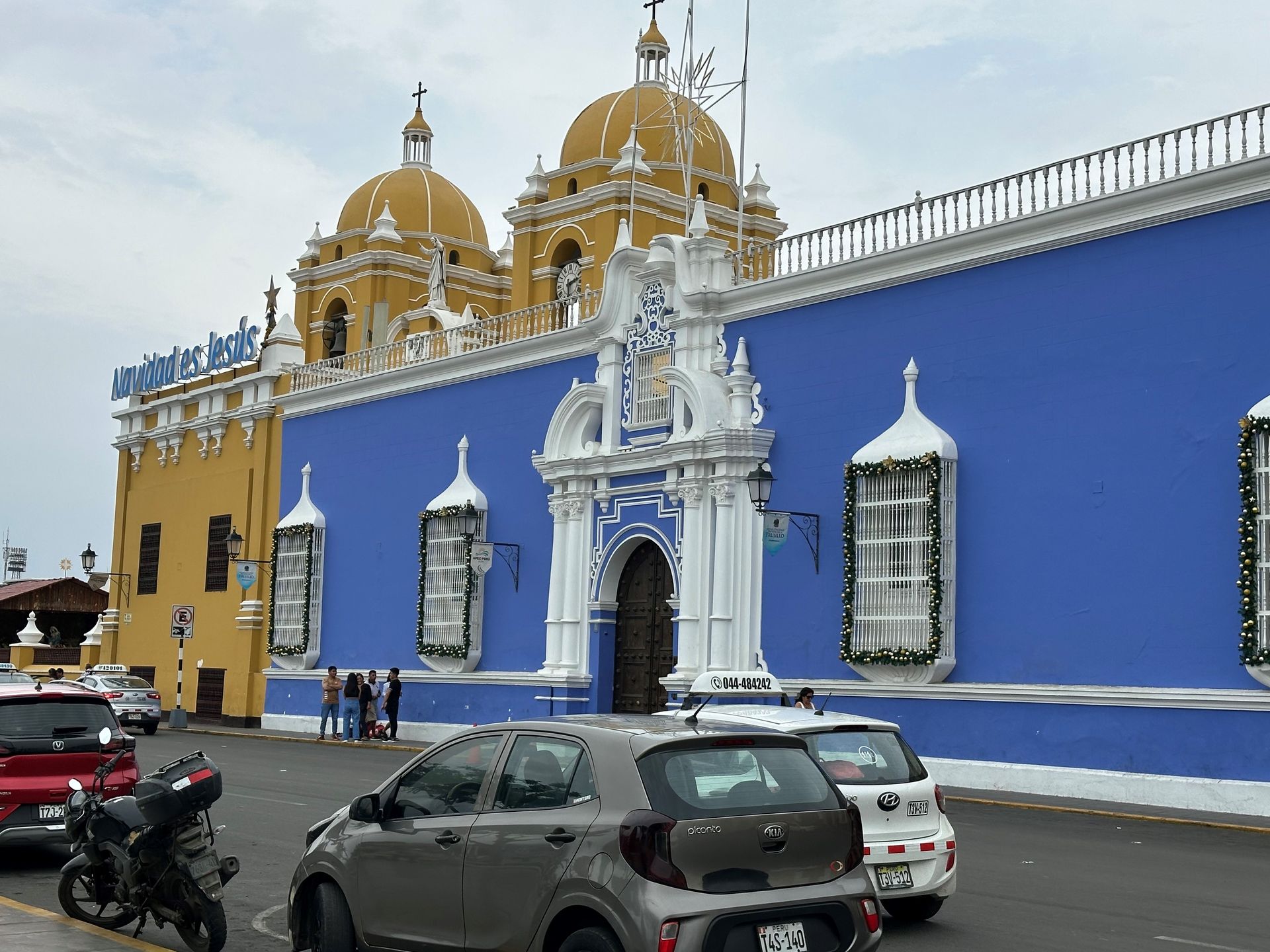 A lot of information is just guesses or theories of archeologist, but the Moche civilization, is believed to exist from 400 to 900 A.D. They built 2 temples pyramids, that scientist named Luna and Sol, with a city in between. Luna had been excavated about 60 % before funds dried up. Sol and City barely touched. Story goes that they did human sacrifices, decapitation of their heads (after they were drugged by plants) in an effort to stop heavy rains. Engineering used to construct shape very involved. Every 100 years another level was built and carved and painted with story decorations. Five layers or 500 years uncovered. Next we went to TRUJILLO CITY SQUARE. We walked around, went to bank for local currency and got some Chinese food CHIFA for lunch.