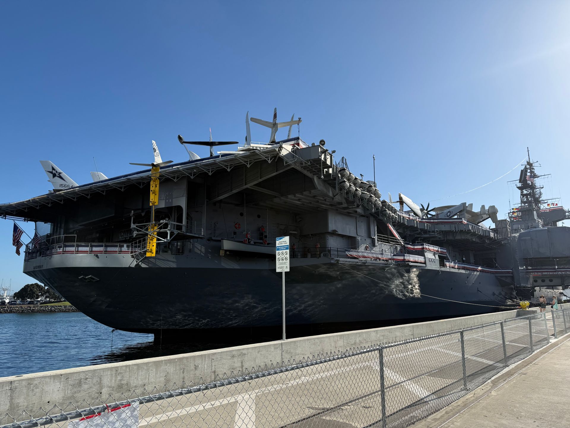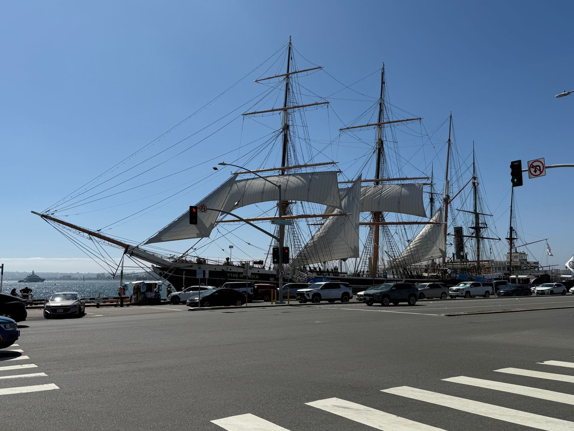 I flew from Philadelphia to San Diego on the morning of Sunday June 15th to rejoin the Ship. It was a gorgeous sunny day and after carting my bags to my room, and unpacking a little bit, I got out to explore the City. Sarah joined me walking around the port area. We did some shopping at the outdoor farmer markets and caught up. Our Ship was docked between two icons - the USS Midway Aircraft carrier and the Star of India the world's oldest active sailing ship. Both are currently museums. Sarah and I posed like the Farewell Kiss statue and did a selfie for Sarah's boyfriend Bob.