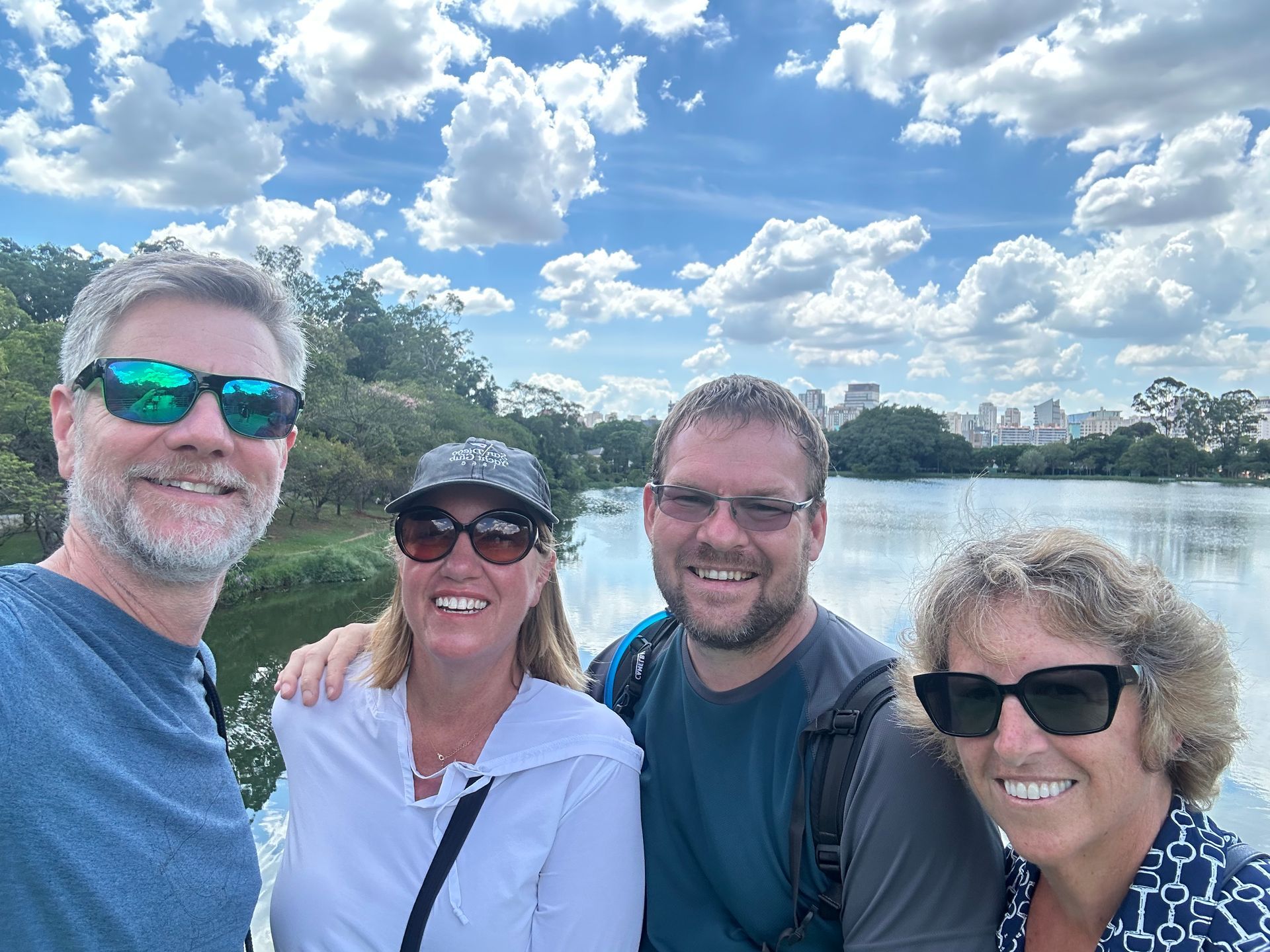 Not knowing when I may ever be in this part of the world again, I made a quick decision without much planning to day trip to SAO PAULO, BRAZIL when we pulled into the port of SANTOS on Monday morning 2/24/25. Scott was of same opinion and he worked out a driver deal, while I started focusing on what we should seek out to see. We also canvased our friends, to see who wanted to join us on this impulsive adventure. Gary and Christy were game, but had commitments till 10:30 am, so we got a little bit of a late start. Also finding our driver, who was a friend of another driver already engaged, took some time in the busy port, but we squeezed into her Fiat ( tight for 3 in back seat) and arrived in Sao Paulo at our first stop by 1pm. Did I mention driver spoke hardly any English, so we had to translate everything with an app. Regardless, first stop was giant park called Parque Ibirapuera similiar to central park in NYC. Gary wasted no time embracing his coconuts and got the party started!
