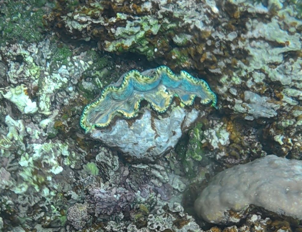 The predator for clams are octopus and humans. The local village toys to keep both out of this reef and fosters the growth of new clams within the corals. The largest clams are about 8 years old and span over a meter in width. The 12 to 18 " wide colorful clams we saw in abundance are about 3 years old. I never knew clams were this colorful! They protect themselves by slamming shut and can break the tentacle off of an octopus or a human foot or hand. When they sense the water move around them they close up quickly. We had to make sure we went at least 2 hours after low tide, to allow enough water coverage to snorkel over the them in the reef.