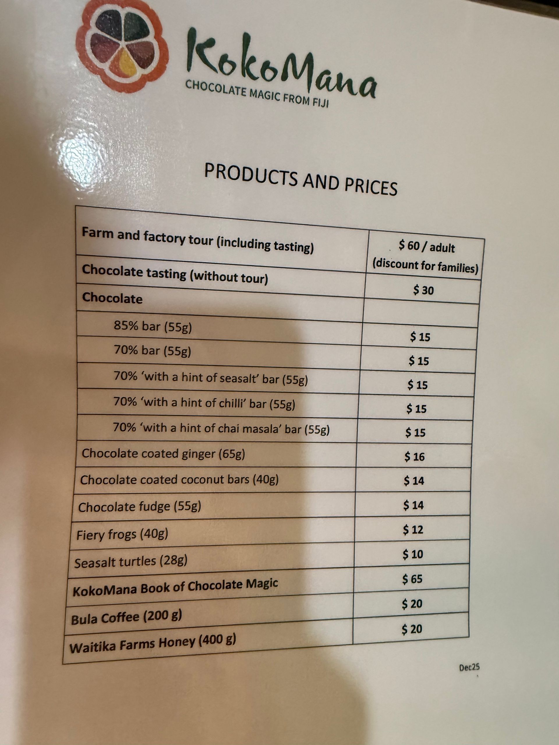 After snorkeling we stopped at KokoMana local chocolate farm and meet with the Chocolatier shown below who is one of 3 ladies who makes all the yummy chocolate creations listed below. They only use 2 ingredients chocolate pods and island sugar cane, no dairy!