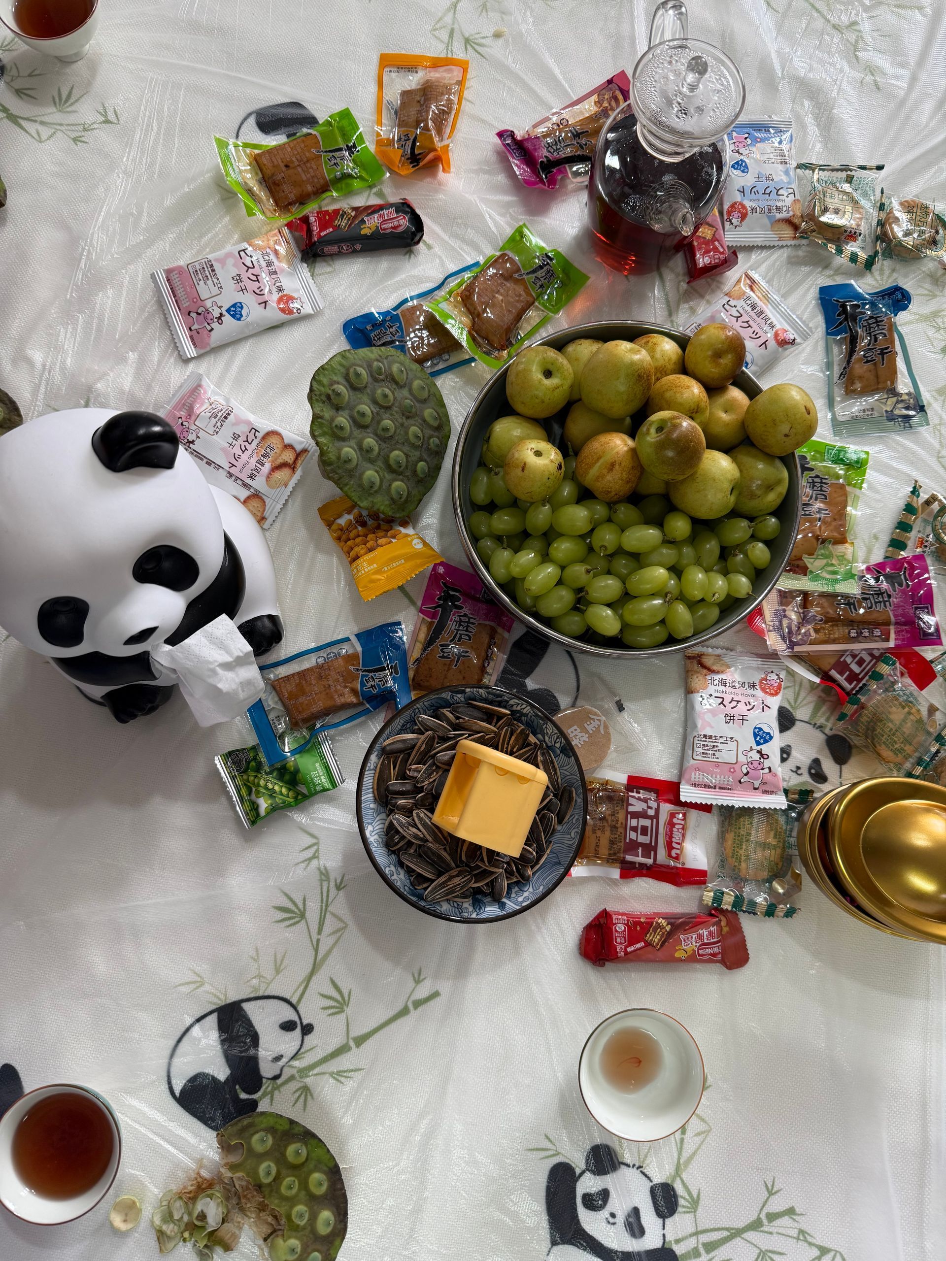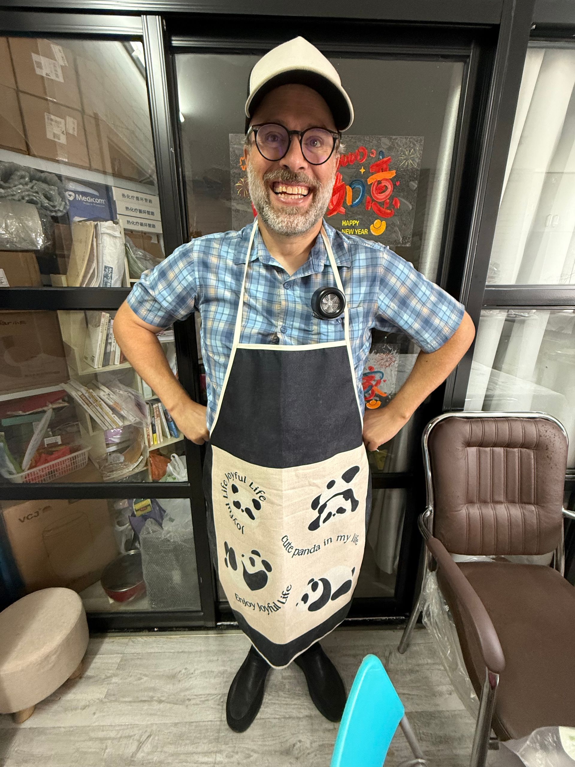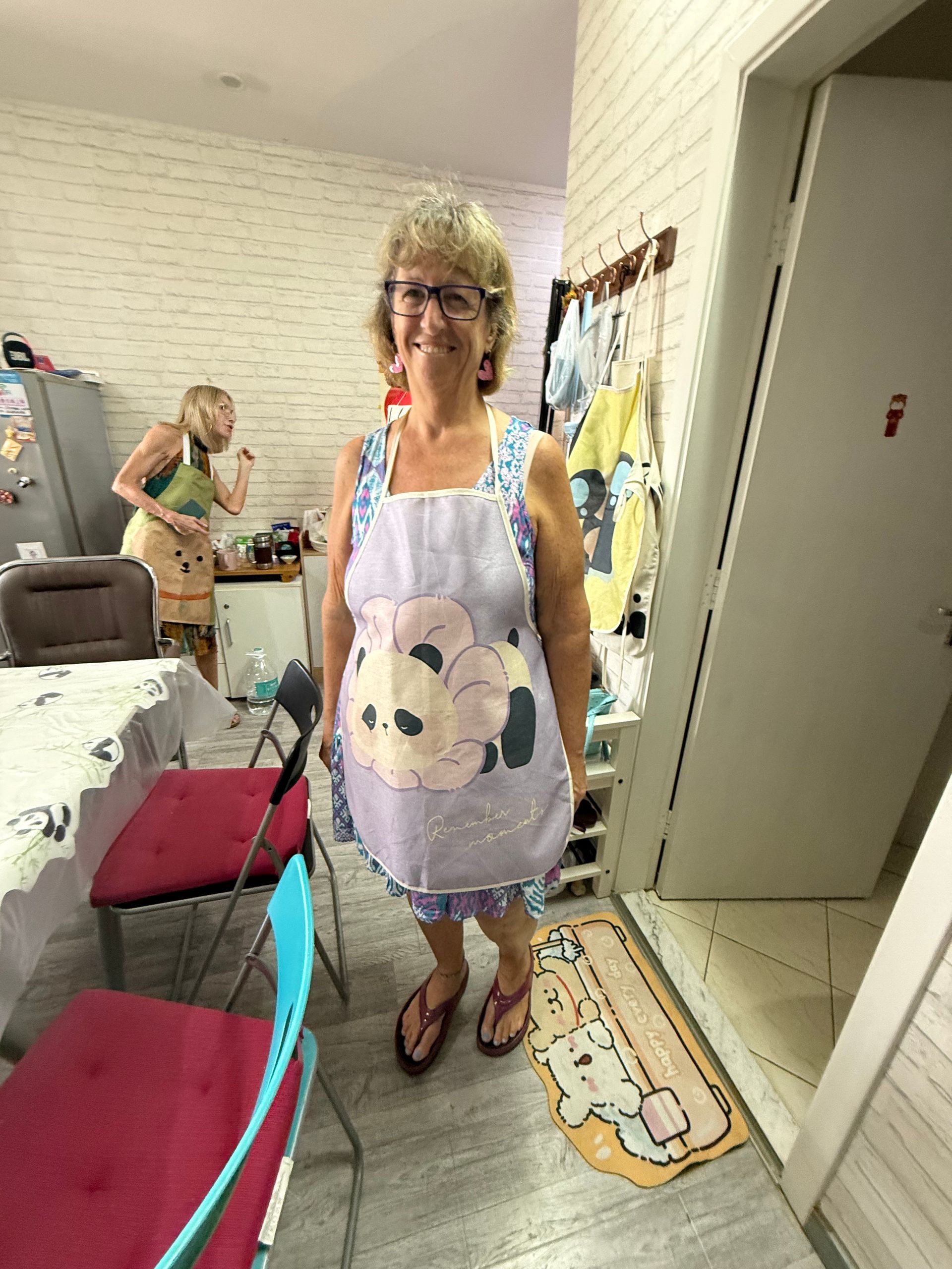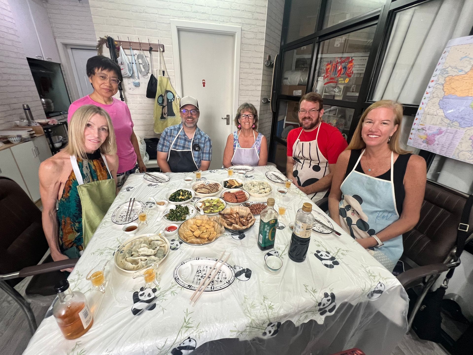 (L to R) Spanish visitor Monica, teacher / host Bonnie, Bosco, Me, Gary and Christy. Photo at end of class when we are about to eat the bounty of our 3 hours of lessons in dumpling making. This is inside Bonnie's 2 room apartment in typical high-rise city building, units are a mix of residential and small business. Aisle kitchen, good size bathroom with tub and washing machine. This is her living room/ work / demo everything room and other side of glass partition is her bedroom - which is 1/2 full of stuff she is storing of her sisters - who lives on lower floor and owns this unit too. Wanted to take class for cultural insight and seeing how people live behind the walls we see from street. Dumplings are delicious so it was a win win - especially since I asked before booking if her place was air conditioned! Great activity to escape heat of day. Have you caught onto that theme lately in my post? It's really HOT here in daytime!