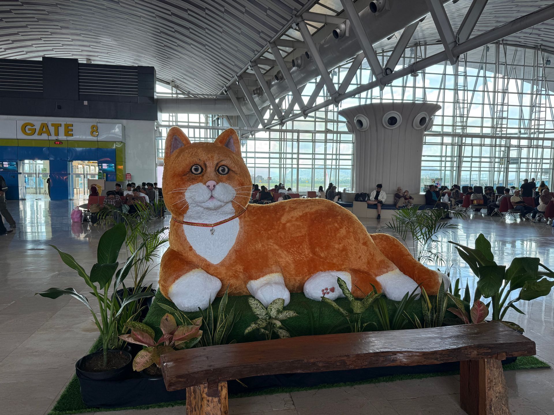This cat was the most interesting artwork in Sultan Hasanuddin Airport but they did play a rather loud impossing Indonesian Raya at 10 am where everything stopped and people stood. The anthem is to foster nationalism, patriotism and unity, encouraging citizens to pause their activities to honor the nation's history and values.