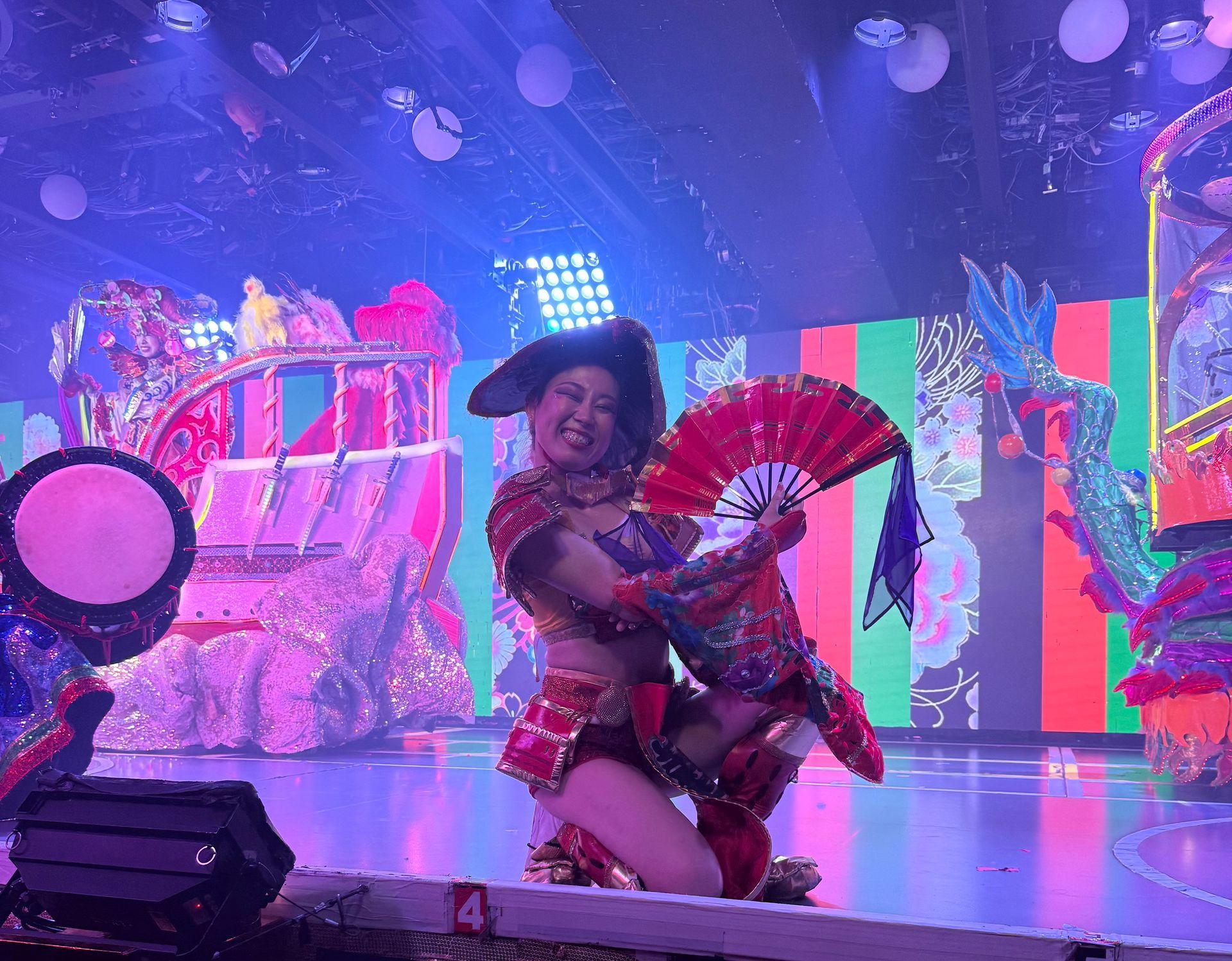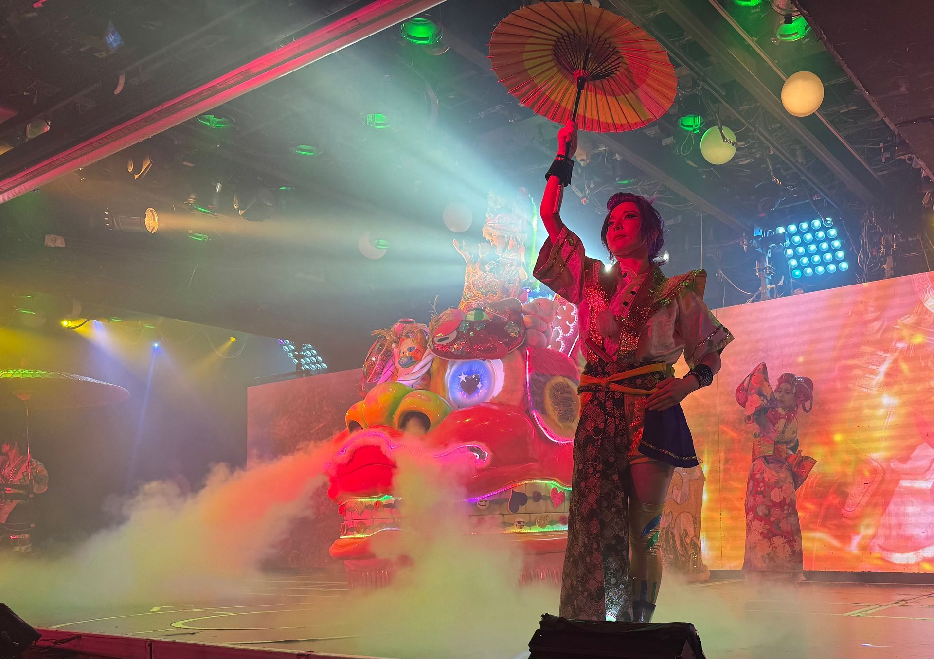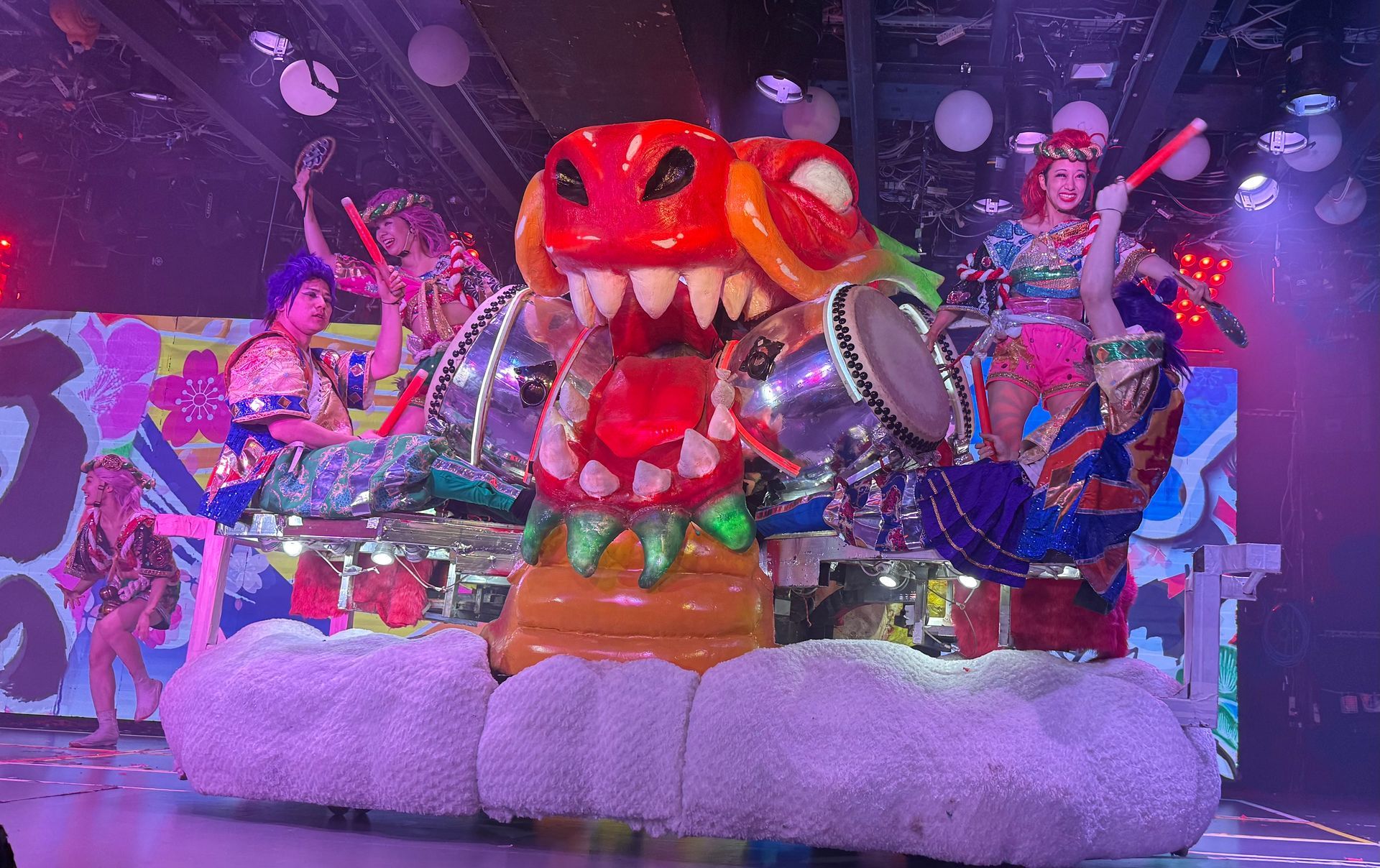 The Samurai Theater itself was a calidescope of all things sparkly and glitter! WOW! The show was lively, loud music, strobe lights and neon and tons of moving parts. The dancers and musicians portray a ton of classic Japanese images, samurai warriors, geshi, dragons and lots of colorful images. We had seats right along the stage and ate a dinner of sushi and udon, while we watched the performance. Afterwards we strolled more of the neighborhood and got to see the Cat in a Box billboard.