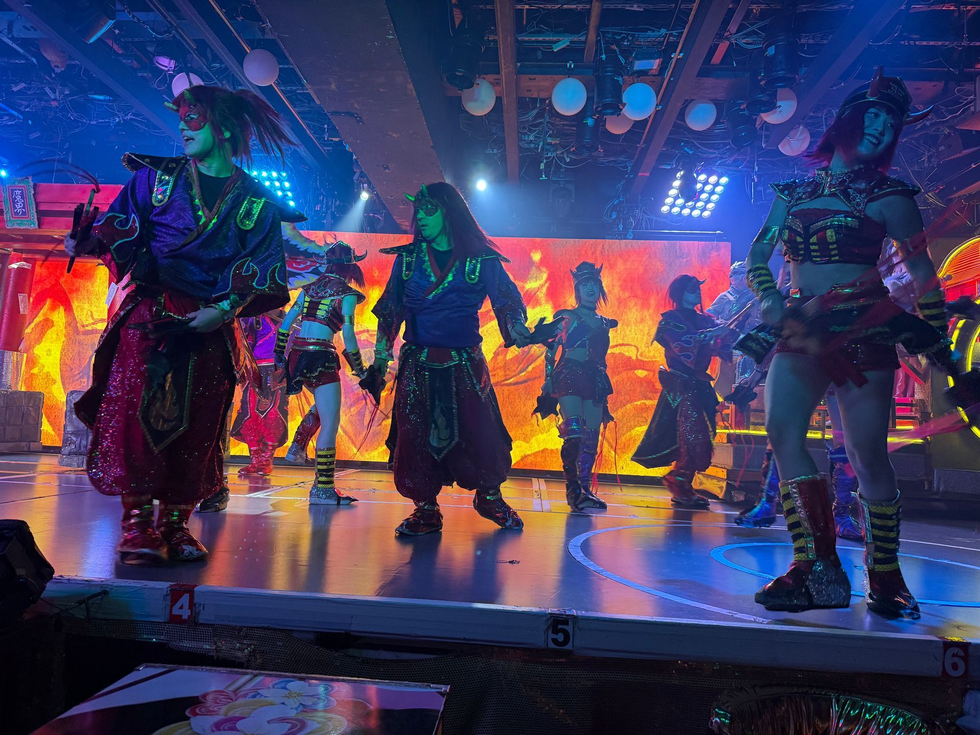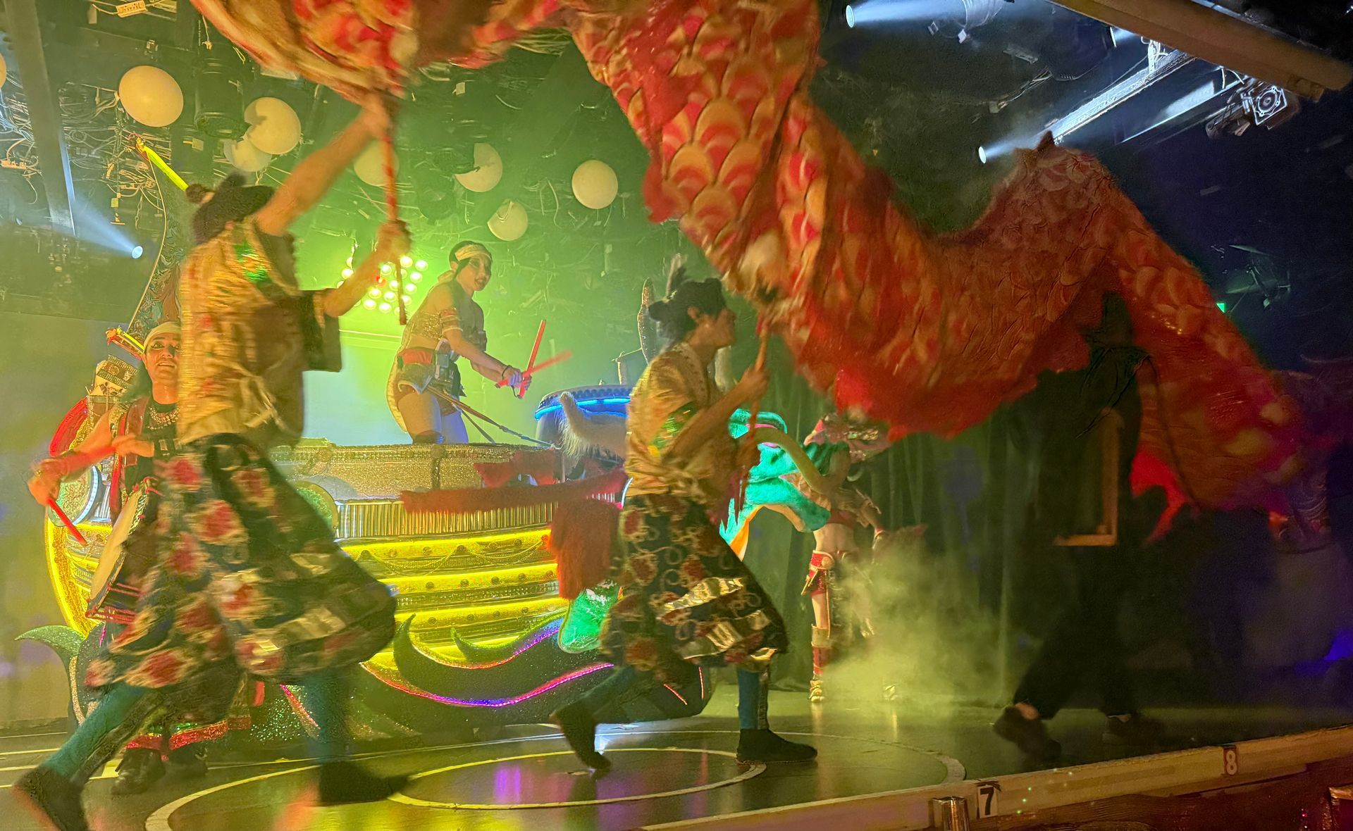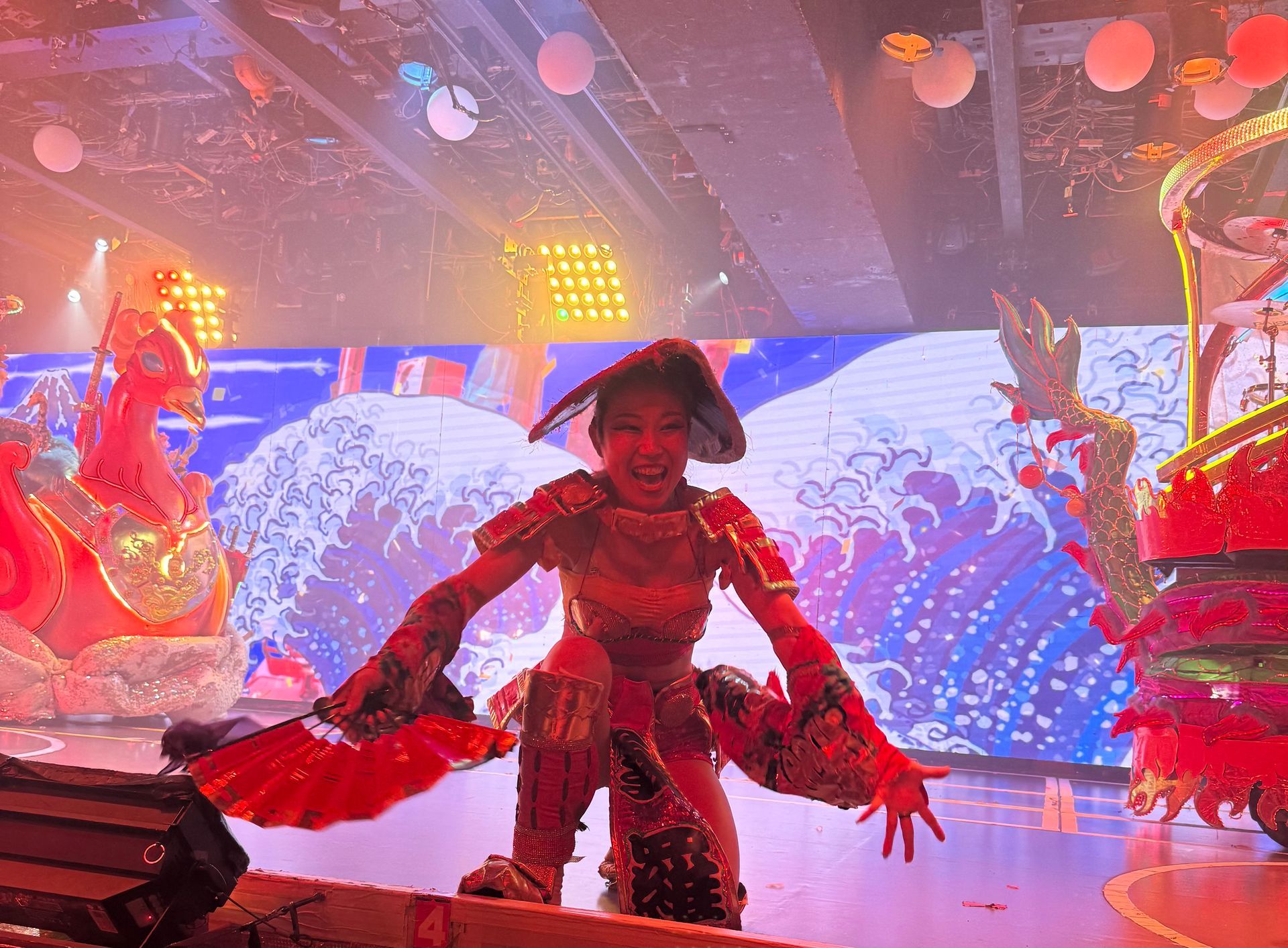 The Samurai Theater itself was a calidescope of all things sparkly and glitter! WOW! The show was lively, loud music, strobe lights and neon and tons of moving parts. The dancers and musicians portray a ton of classic Japanese images, samurai warriors, geshi, dragons and lots of colorful images. We had seats right along the stage and ate a dinner of sushi and udon, while we watched the performance. Afterwards we strolled more of the neighborhood and got to see the Cat in a Box billboard.