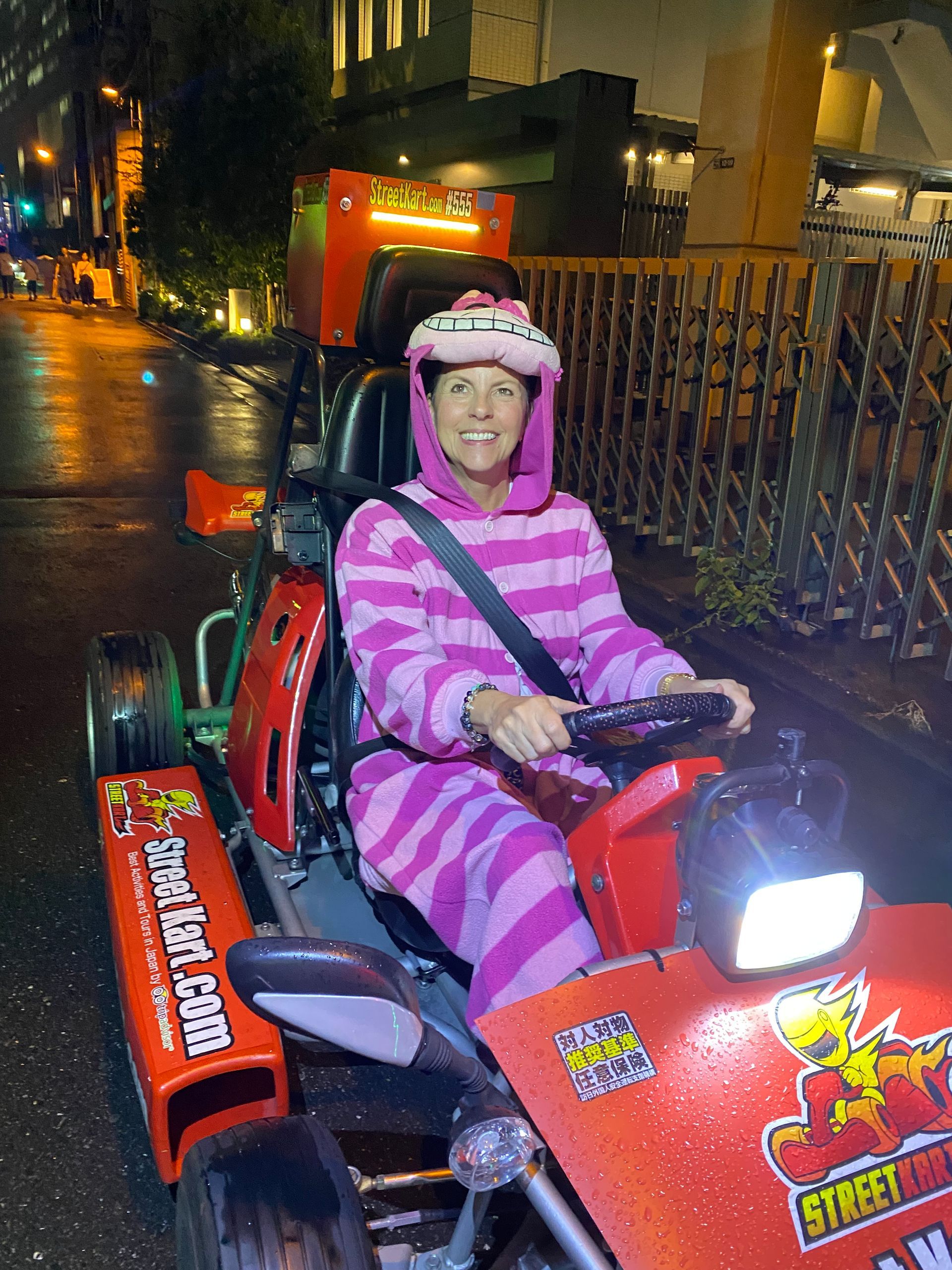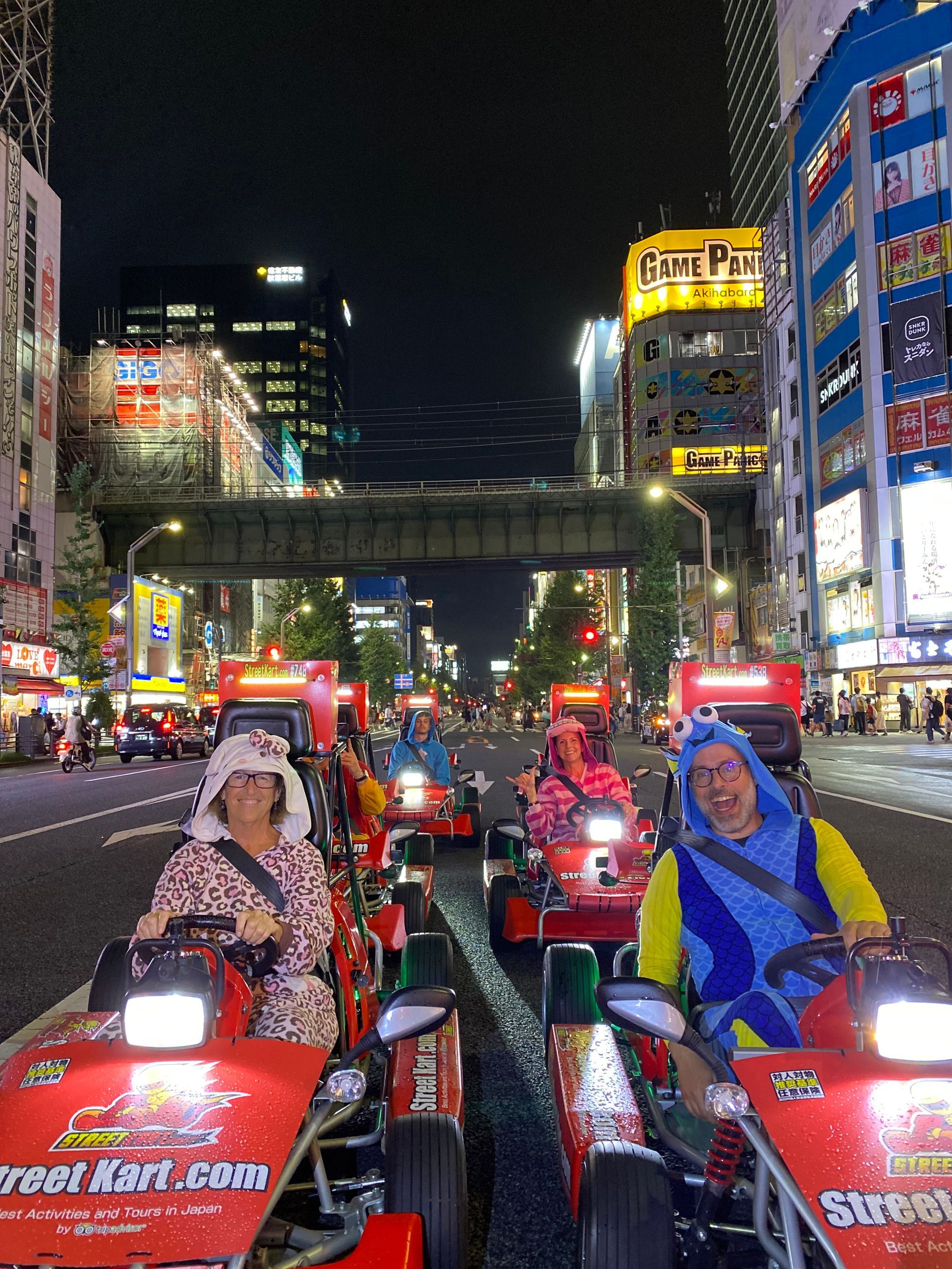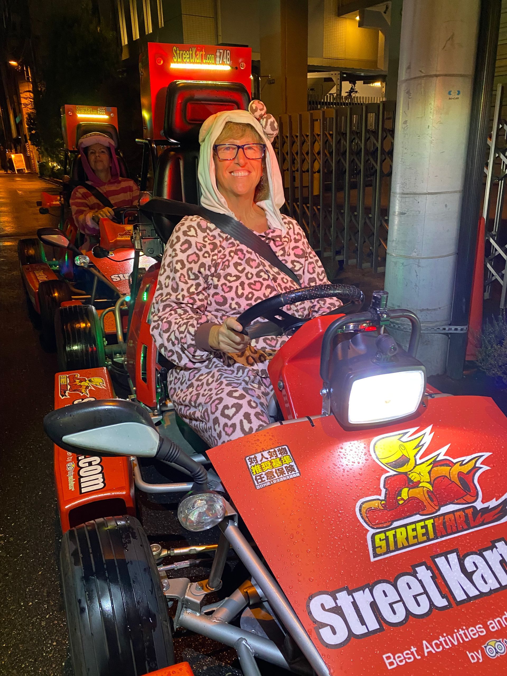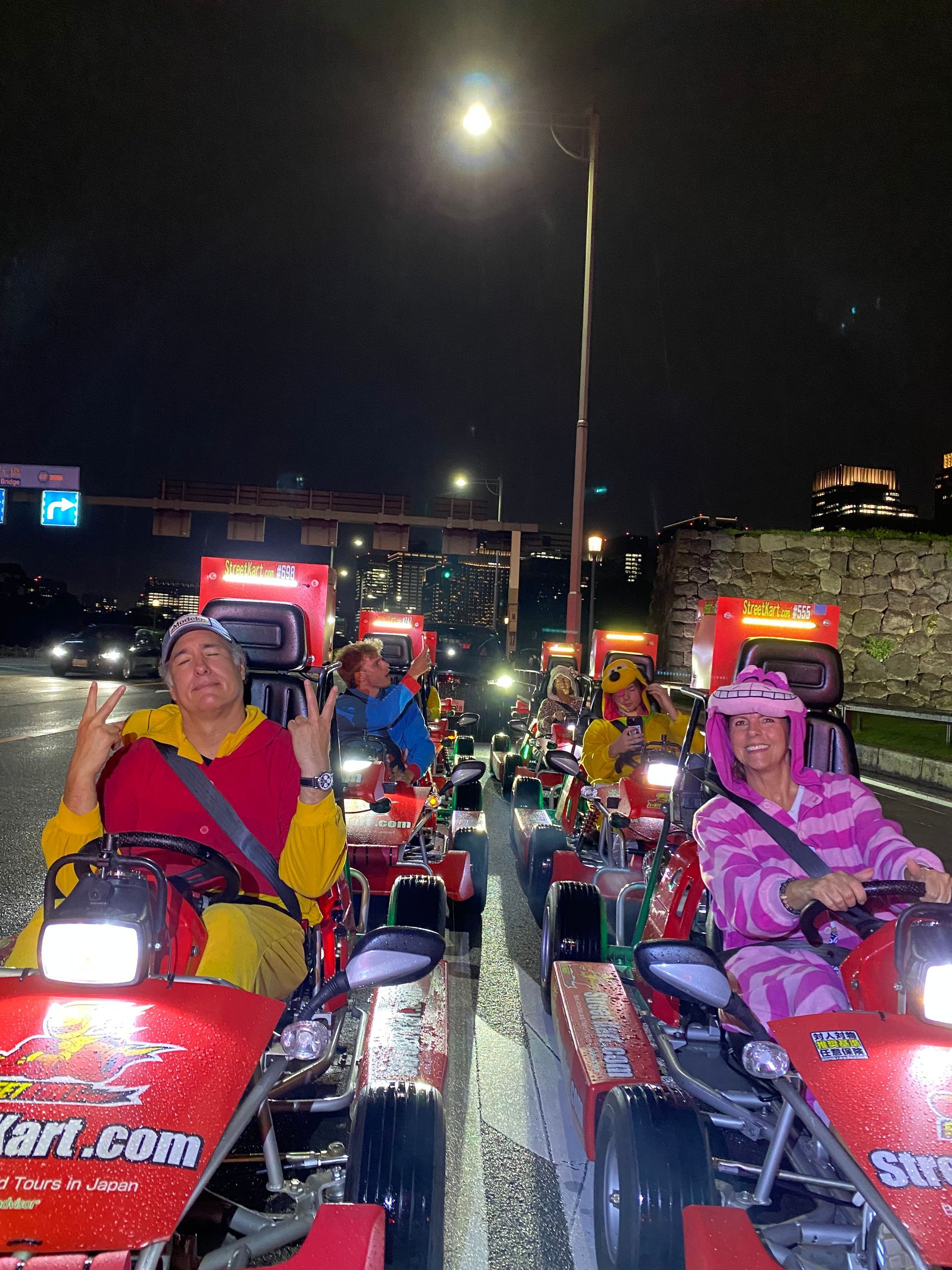 We squeezed in one more FUN excursion, in this long first day in Tokyo. We met up with ship friends (L to R )Theresa, her son Riley, his visiting friend Gavin, Me & Bosco and Alan to drive STREET KARTS around the City. This was a BLAST and a great way to see the city and sights all lite up at night! Plus we got to get in costumes! They supplied a variety of onesie outfits!
