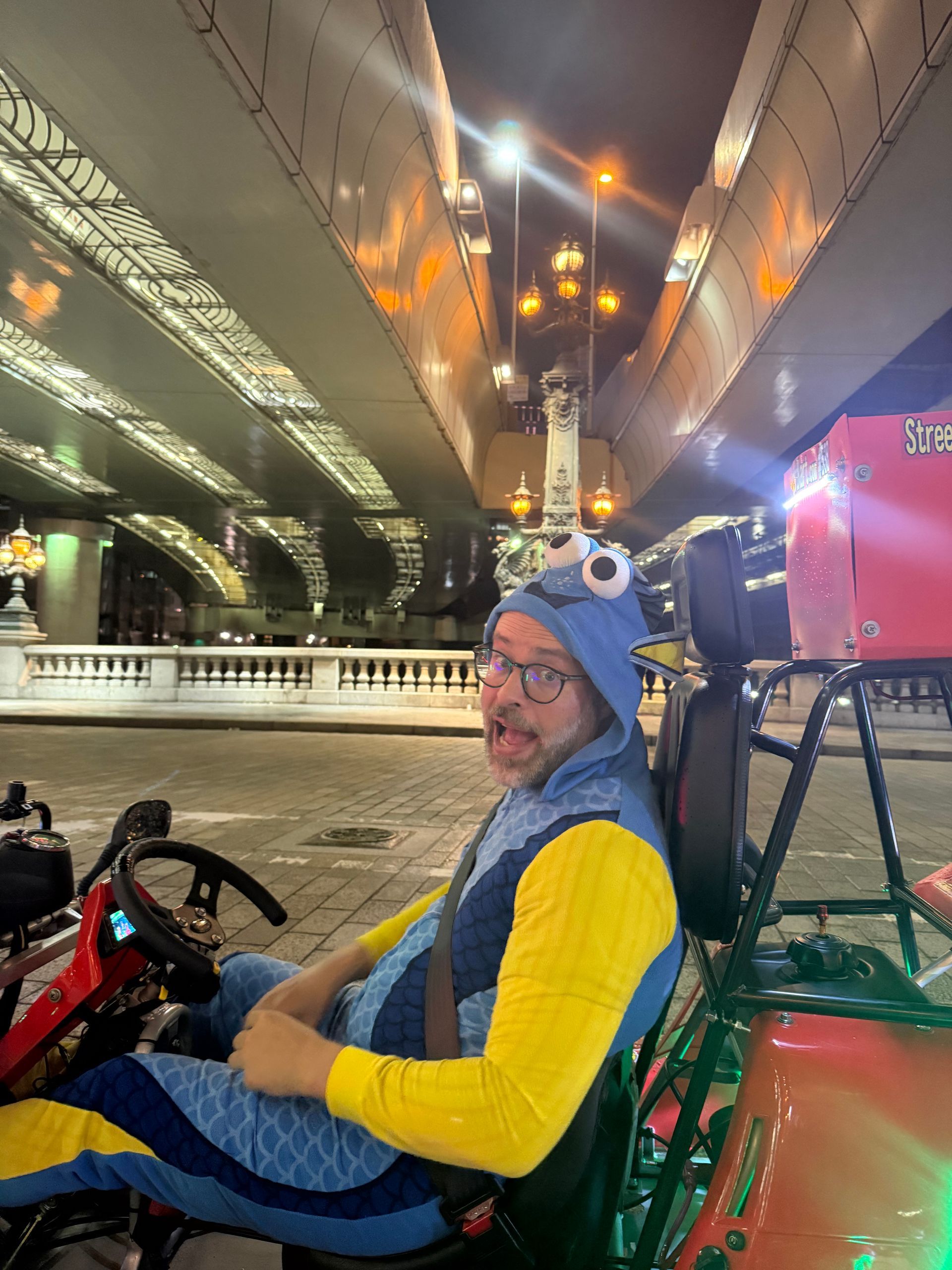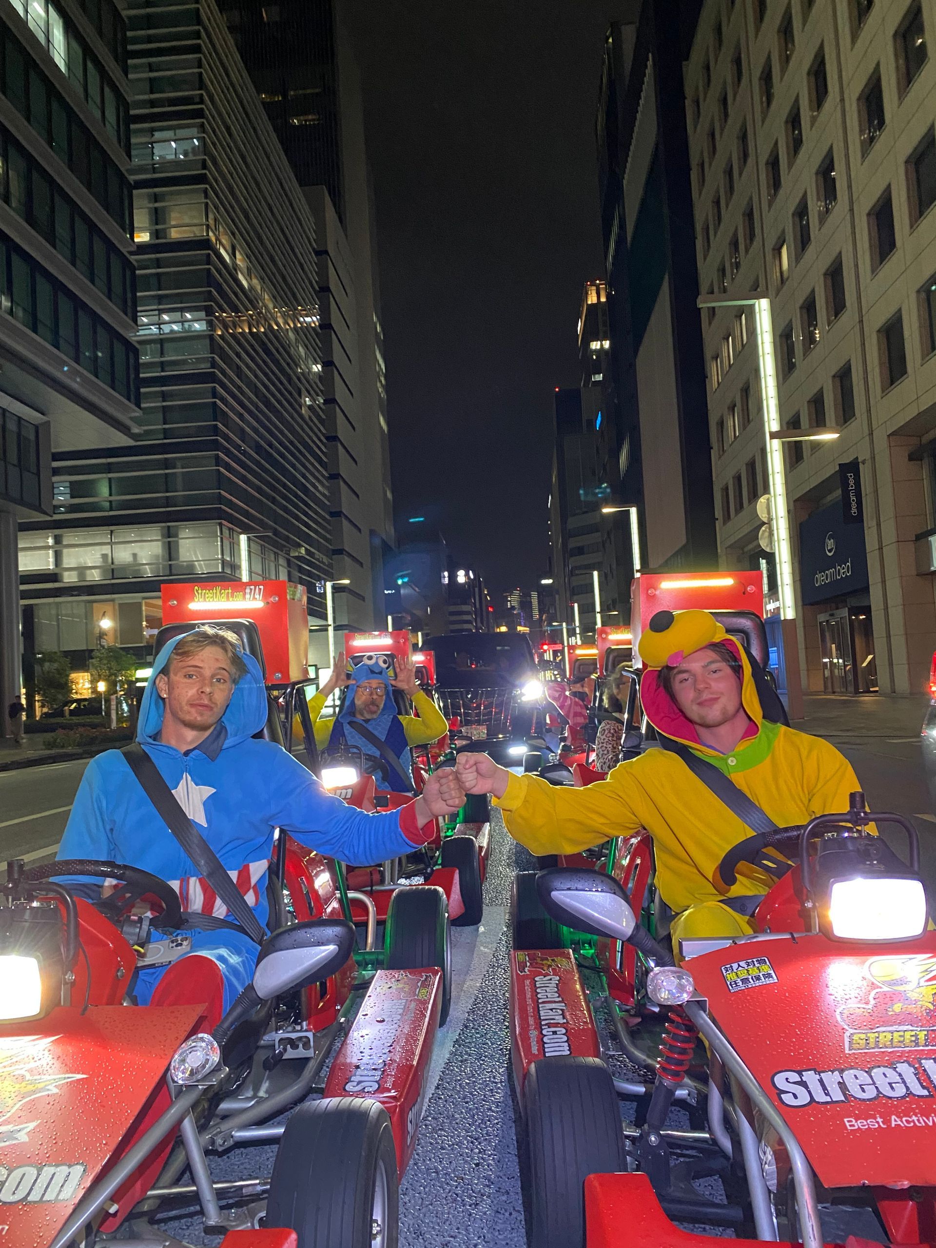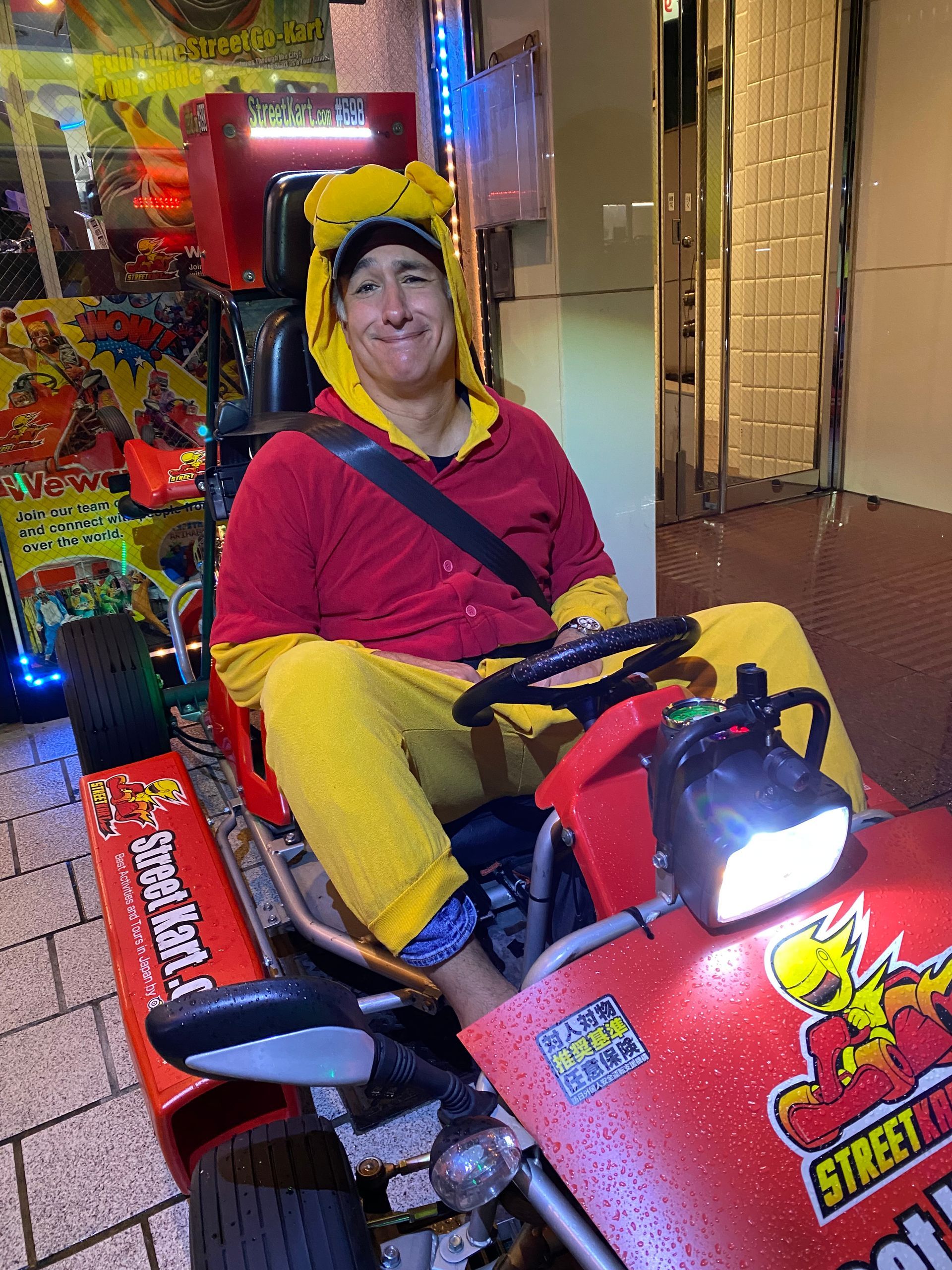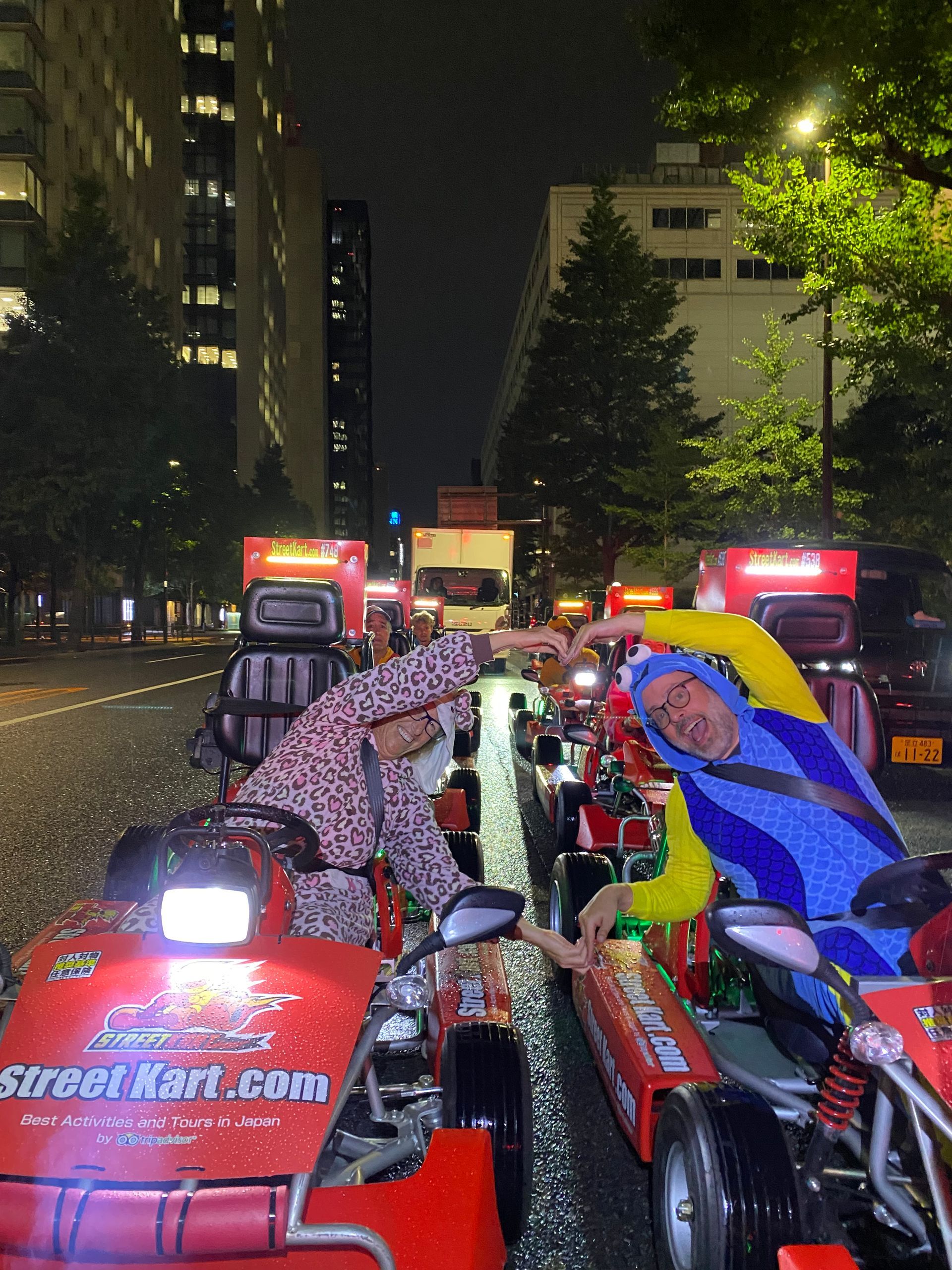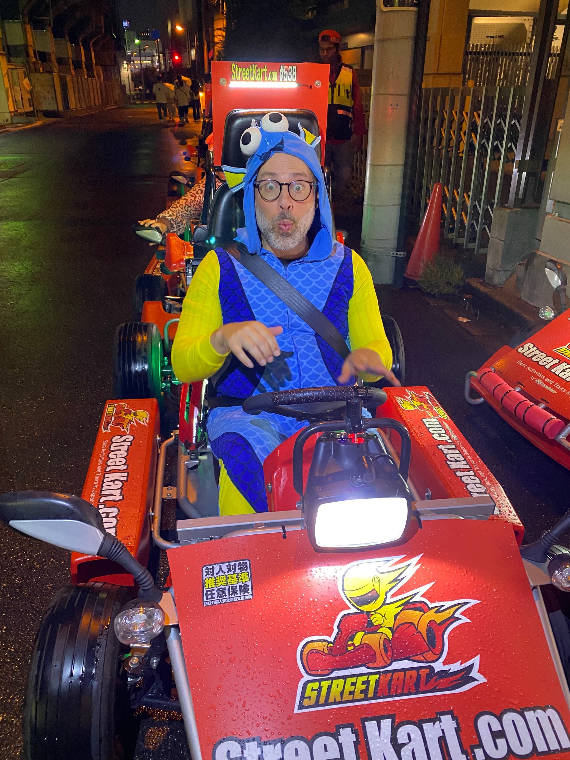 We squeezed in one more FUN excursion, in this long first day in Tokyo. We met up with ship friends (L to R )Theresa, her son Riley, his visiting friend Gavin, Me & Bosco and Alan to drive STREET KARTS around the City. This was a BLAST and a great way to see the city and sights all lite up at night! Plus we got to get in costumes! They supplied a variety of onesie outfits!